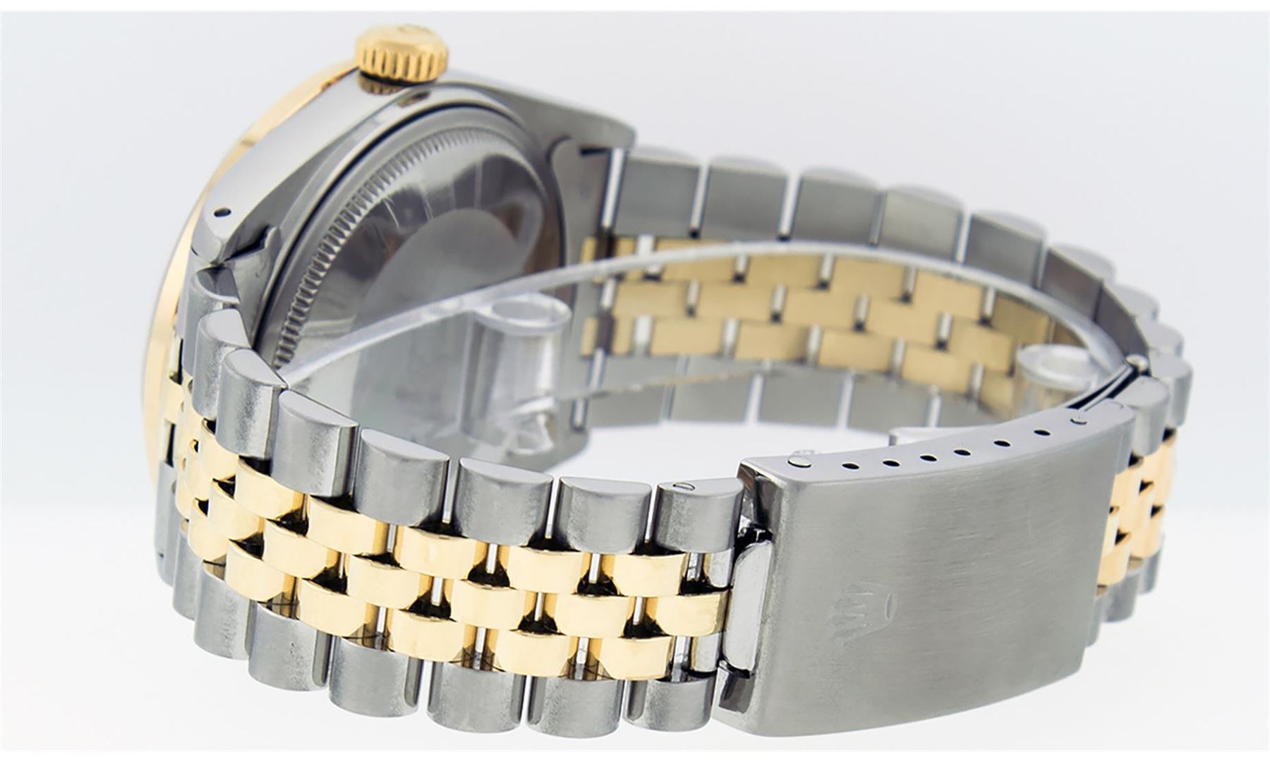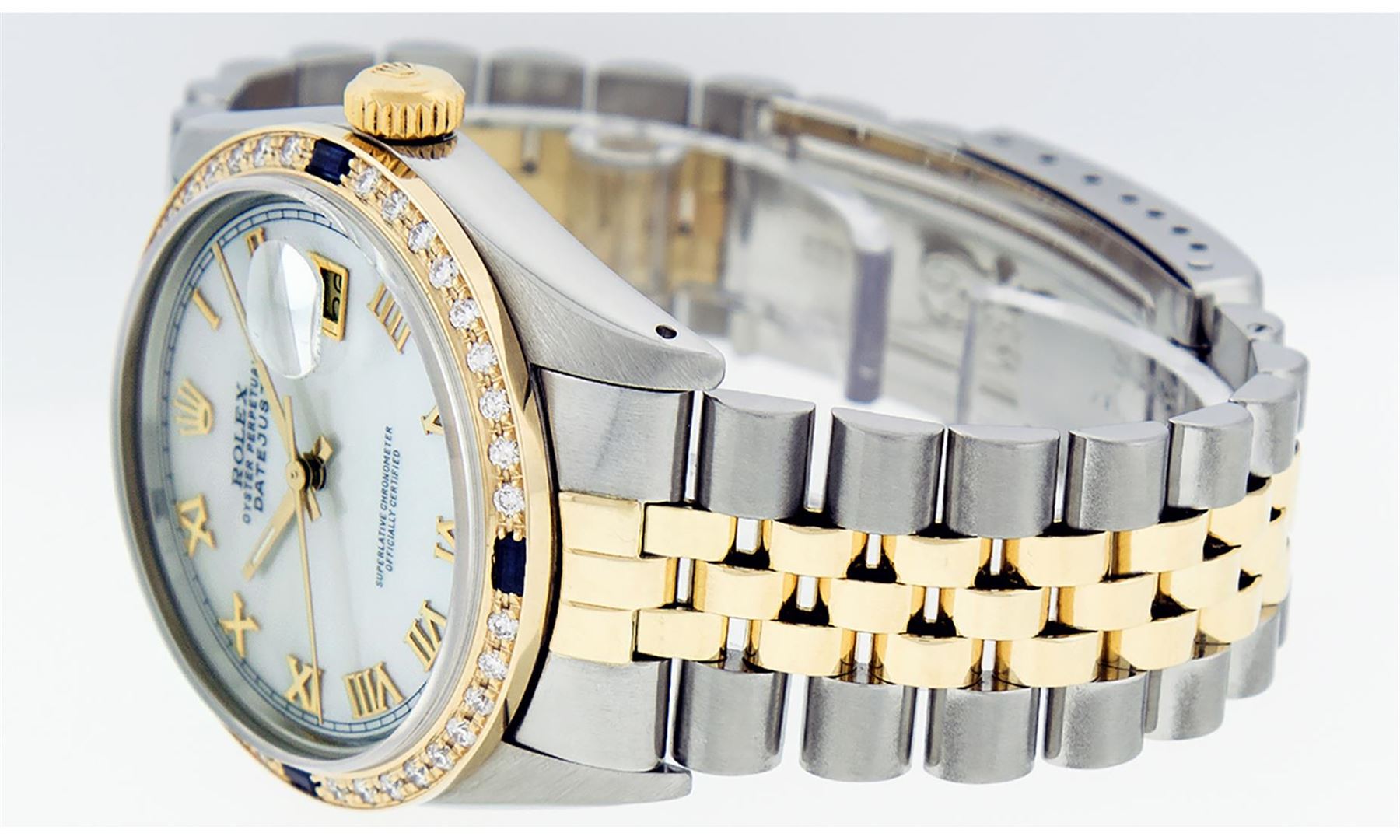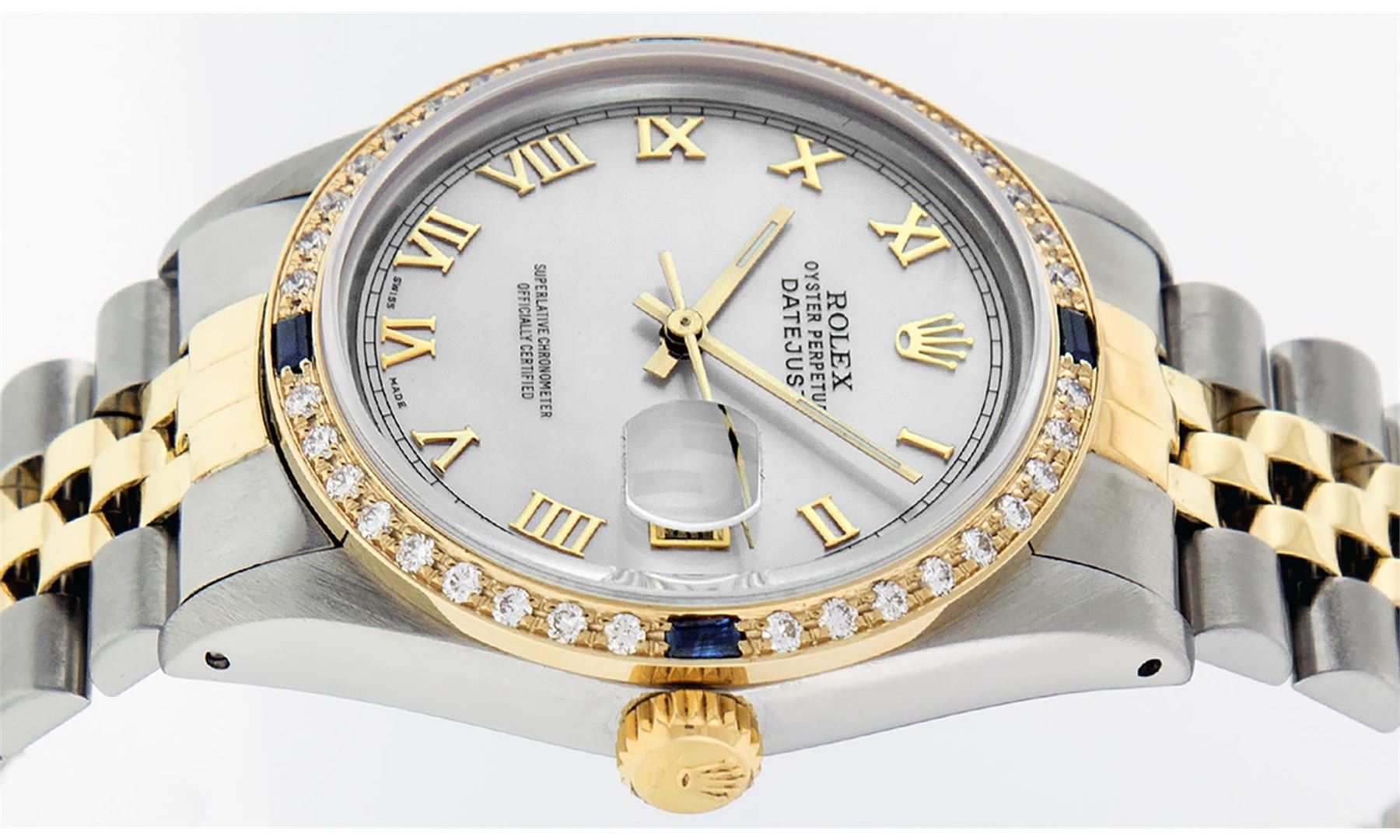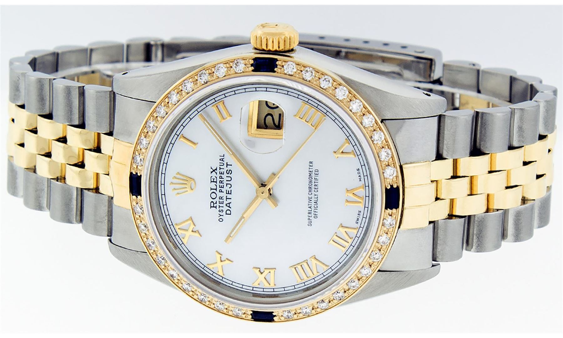 One Mens 14K Yellow Gold Two Tone Rolex Datejust Polished, Serviced & Electronically Tested, 14K Yellow Gold & Stainless Steel Case: 36mm, 14K Yellow Gold Crown, Custom Bezel: 18K Yellow Gold Beadset & Sapphire Diamond Bezel, Stone Count: 36 Diamonds + 4 Sapphires, Total Weight 1.00 Carat, Clarity: SI-VS, Color: G to H. Custom Crystal: New Scratch Resistant Synthetic Sapphire Cyclops Lens. Custom Hands: New Luminecent Hands. Movement: Automatic Winding Movement Caliber 3035. Custom Dial: Mother Of Pearl Roman Dial With Square Track. Date Window: 3 O'Clock Position Date Display, Quickset, Model: 16013 Datejust. Condition: G-6 Extra Fine. Bracelet: Two Tone 14K Yellow Gold & Stainless Steel Jubilee. Bright Polish. 7.0 Inch Length, Adjustable. Standard Clasp, With Rolex Logo. This Watch Has Been Serviced Time Tested And Is In Excellent Condition It Is Free Of All Scratches And Dents.