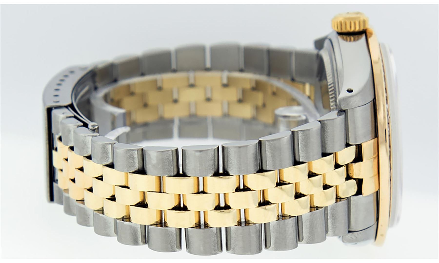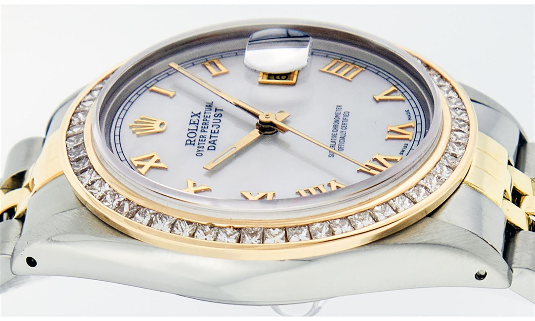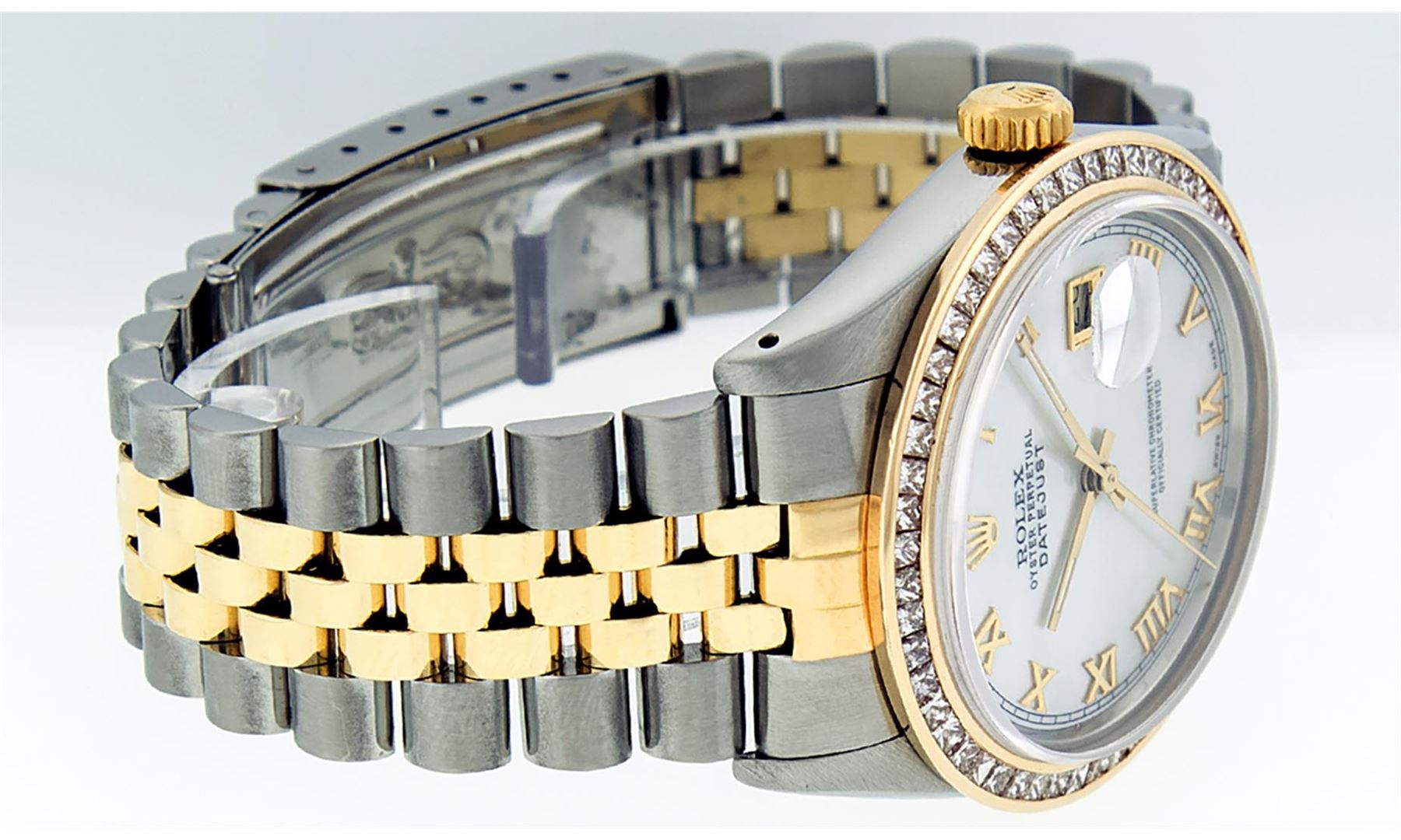 One Mens 14K Yellow Gold Two Tone Rolex Datejust Polished Bright with Satin Finish, Serviced & Electronically Tested, 14K Yellow Gold And Stainless Steel Case: 36mm, 14K Yellow Gold Crown, Custom Bezel: New 14K Yellow Gold Princess Cut Diamond Bezel, Diamond Count: 53 Diamonds, Total Weight 2.75 Carat, Clarity: SI-VS, Color: G to H. Custom Crystal: New Scratch Resistant Synthetic Sapphire Cyclops Lens. Custom Hands: New Luminecent Hands. Movement: Automatic Winding Movement Caliber 3035. Custom Dial: Mother Of Pearl Roman Dial With Square Track. Date Window: 3 O'Clock Position Date Display, Quickset, Model: 16013 Datejust. Condition: G-6 Extra Fine. Bracelet: 14K Yellow Gold And Stainless Steel Jubilee Band. Bright Polish & Satin Finish. 7.0 Inch Length, Adjustable. Standard Clasp, With Rolex Logo. This Watch Has Been Serviced and Polished And It Is Free Of All Dents And Scratches And Has Been Time Tested.