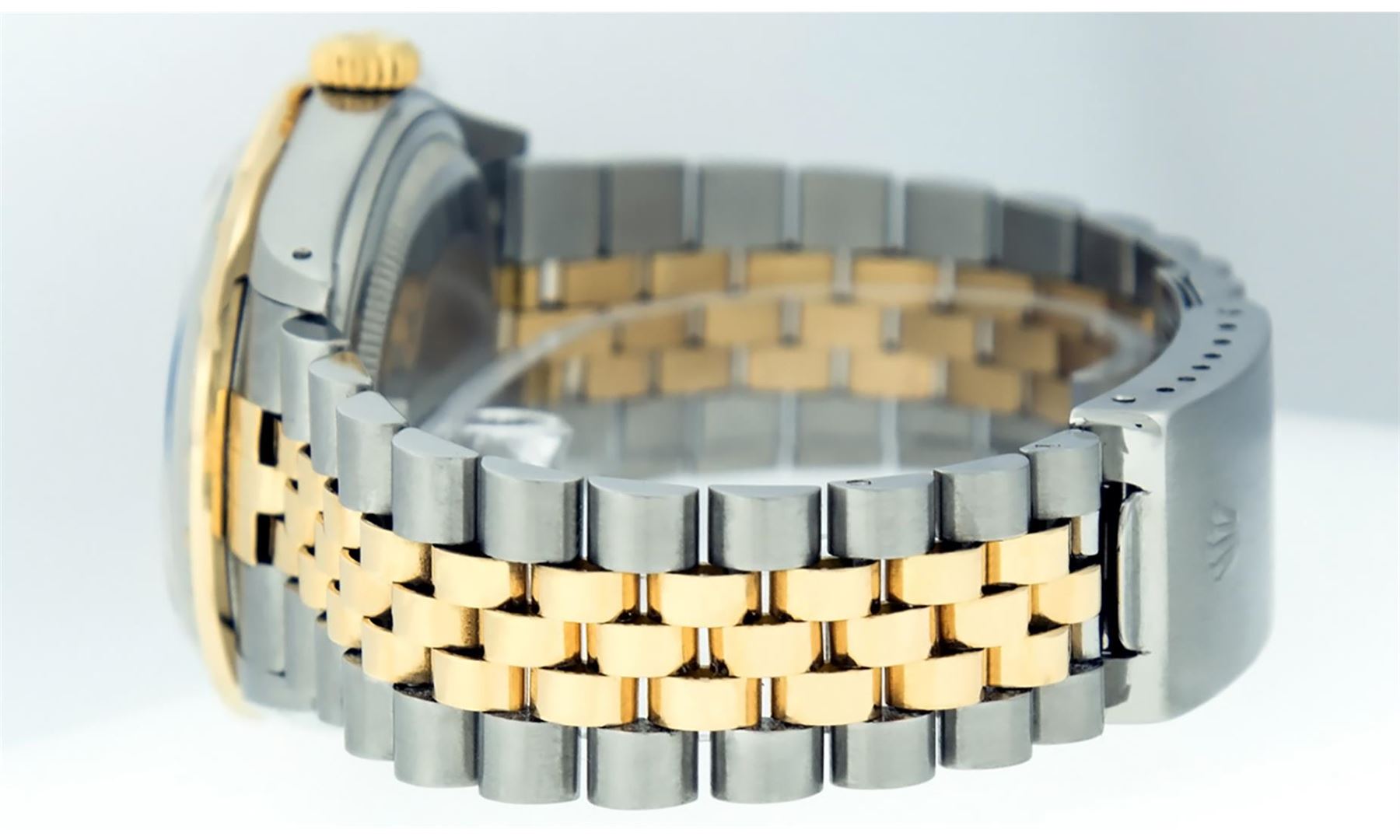 One Mens 14K Yellow Gold Rolex Datejust Polished Bright with Satin Finish, Serviced & Electronically Tested, Stainless Steel Case: 36mm, Yellow Gold Crown, Custom Bezel: New 18K Yellow Gold Pyramid Diamond Bezel, Diamond Count: 24 Diamonds, Total Weight .75 Carat, Clarity: SI-VS, Color: G to H. Custom Crystal: New Scratch Resistant Synthetic Sapphire Cyclops Lens. Custom Hands: New Luminecent Hands. Movement: Automatic Winding Movement Caliber 3035. Custom Dial: Mother Of Pearl With Sqaure Track. Date Window: 3 O'Clock Position Date Display, Quickset, Model: 16013 Datejust. Condition: G-6 Extra Fine. Bracelet: 14K Yellow Gold And Stainless Steel Jubilee Band. Bright Polish & Satin Finish. 7.0 Inch Length, Adjustable. Standard Clasp, With Rolex Logo. This Watch Has Been Serviced And Polished It Is Free Of All Scratches And Dents.