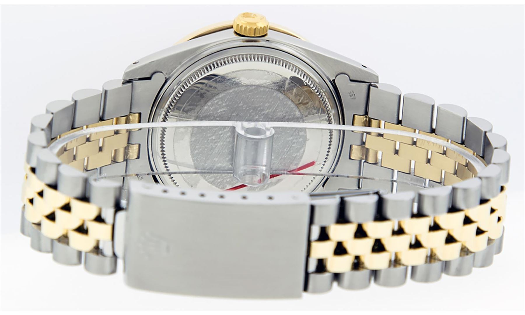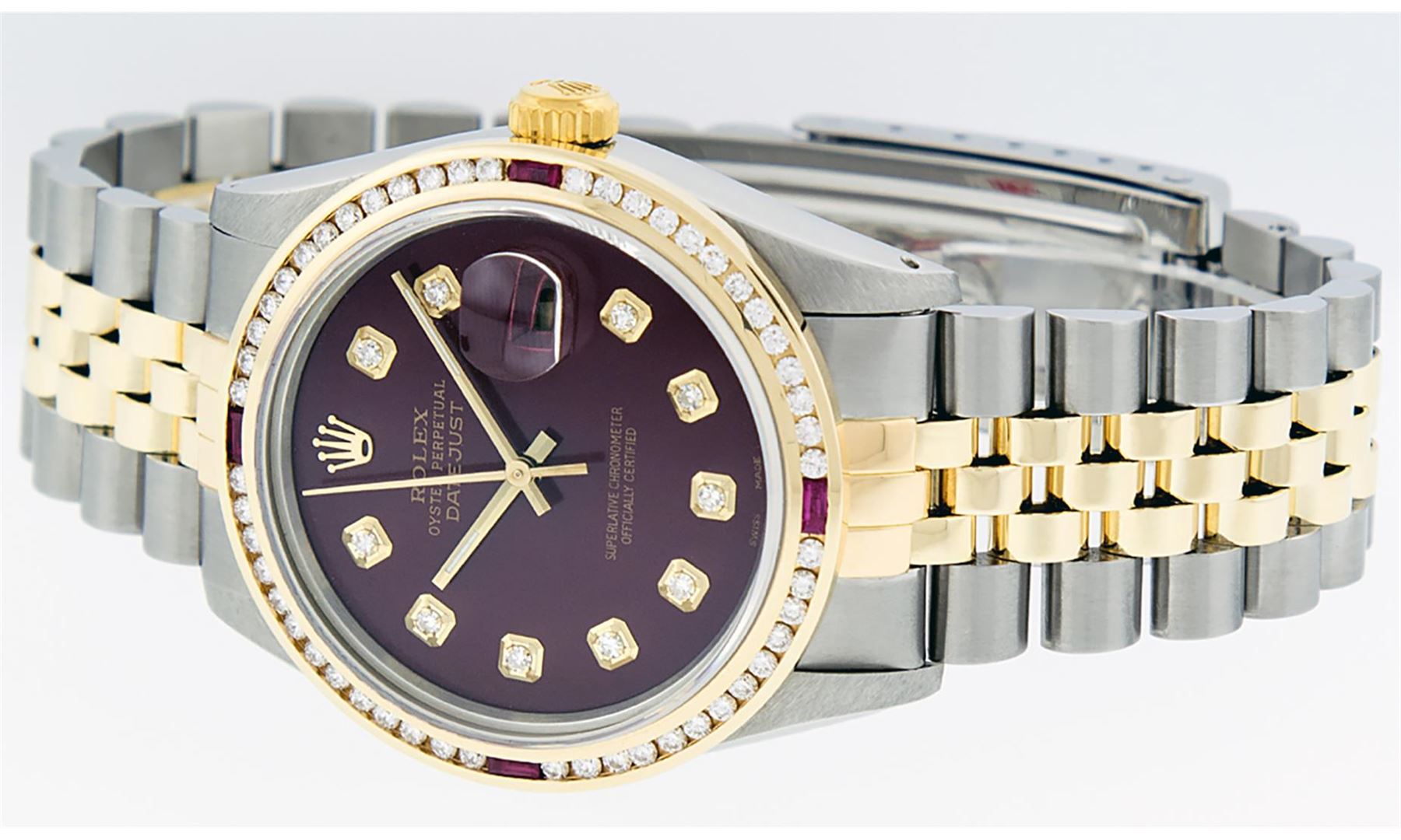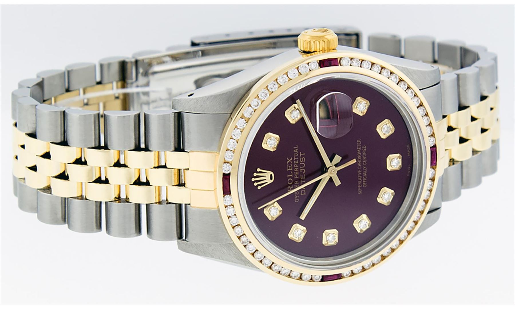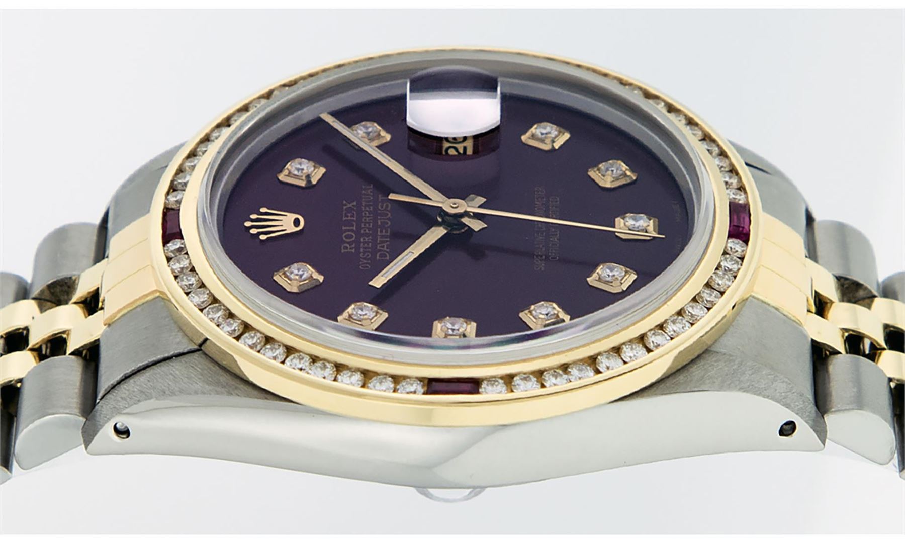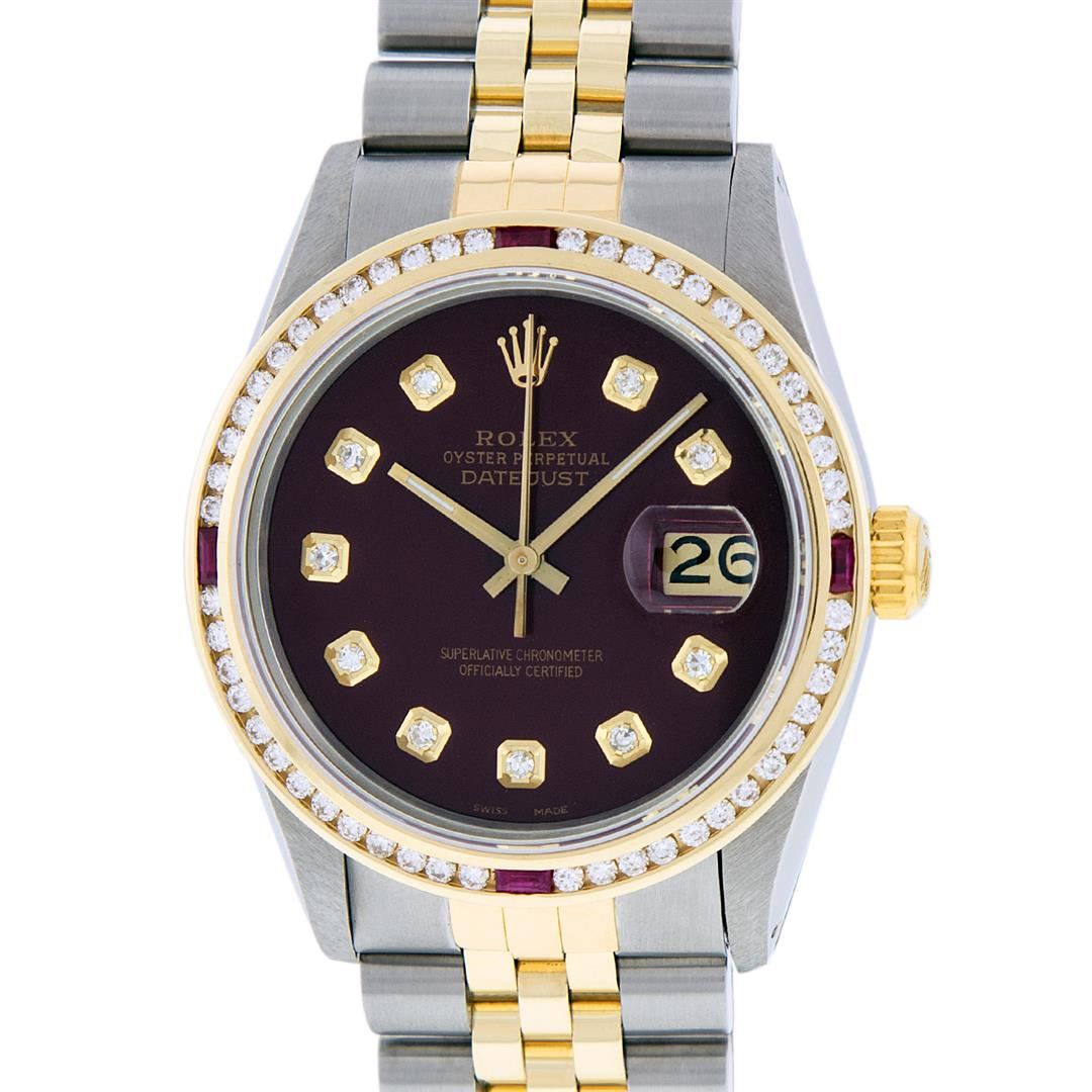 One Mens 14K Yellow Gold Two Tone Rolex Datejust Polished, Serviced & Electronically Tested, 14K Yellow Gold & Stainless Steel Case: 36mm, 14K Yellow Gold Crown, Custom Bezel: 18K Yellow Gold Ruby Channel Set Diamond Bezel, Diamond Count: 52 Diamonds + 4 Rubies, Total Weight 1.30 Carat, Clarity: SI-VS, Color: G to H. Custom Crystal: New Scratch Resistant Synthetic Sapphire Cyclops Lens. Custom Hands: New Luminecent Hands. Movement: Automatic Winding Movement Caliber 3035. Custom Dial: Maroon Diamond Dial With Single Cut Diamonds, Diamond Count: 10 Diamonds in Dial. Date Window: 3 O'Clock Position Date Display, Quickset, Model: 16013 Datejust. Condition: G-6 Extra Fine. Bracelet:Two Tone 14K Yellow Gold & Stainless Steel Jubilee Band. Bright Polish. 7.0 Inch Length, Adjustable. Standard Clasp, With Rolex Logo. This Watch Has Been Serviced Time Tested And Is In Excellent Condition It Is Free Of All Scratches And Dents.