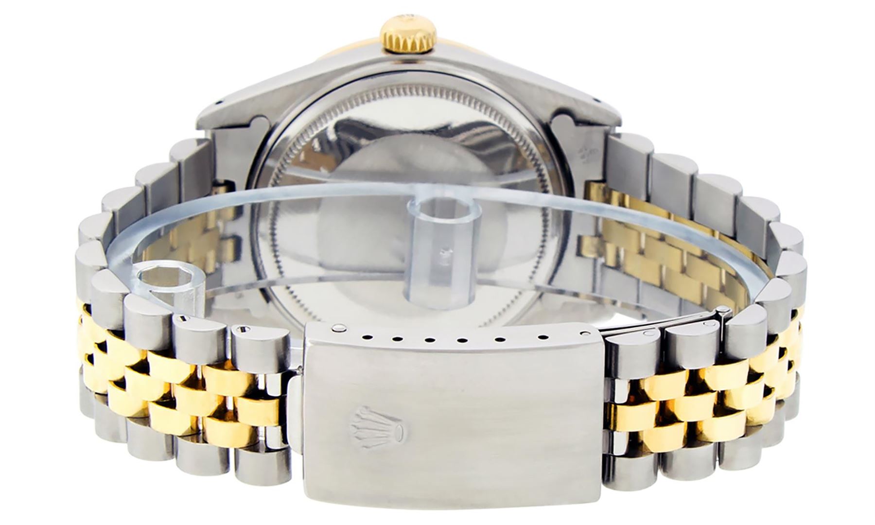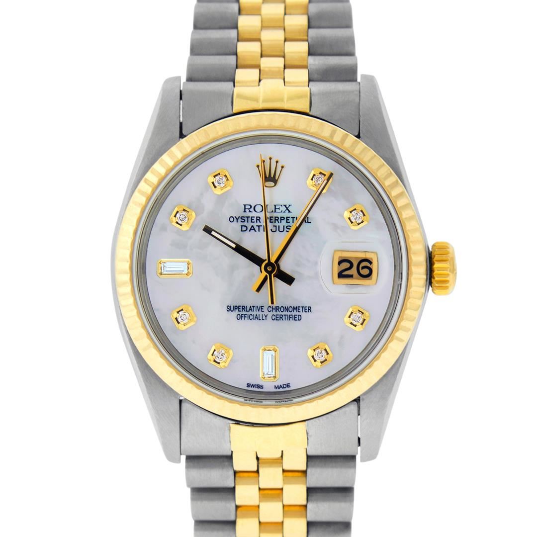 One Mens 14K Yellow Gold Two Tone Rolex Datejust Polished, Serviced & Electronically Tested, 14K Yellow Gold & Stainless Steel Case: 36mm, 14K Yellow Gold Crown, Bezel: 14K Yellow Gold Fluted Bezel. Custom Crystal: New Acrylic Cyclops Lens. Custom Hands: New Luminecent Hands. Movement: Automatic Winding Movement Caliber 3035. Custom Dial: Mother Of Pearl Diamond Dial, Stone Count: 8 Diamonds + 2 Baguette Diamonds in Dial, G To H In Color, SI-VS Clarity. Date Window: 3 O'Clock Position Date Display, Quickset, Model: Datejust. Condition: G-6 Extra Fine. Bracelet: Two Tone 14K Yellow Gold & Stainless Steel Jubilee Band. Bright Polish. 7.0 Inch Length, Adjustable. Standard Clasp, With Rolex Logo. This Watch Has Been Serviced And Polished It Is Free Of All Scratches And Dents.