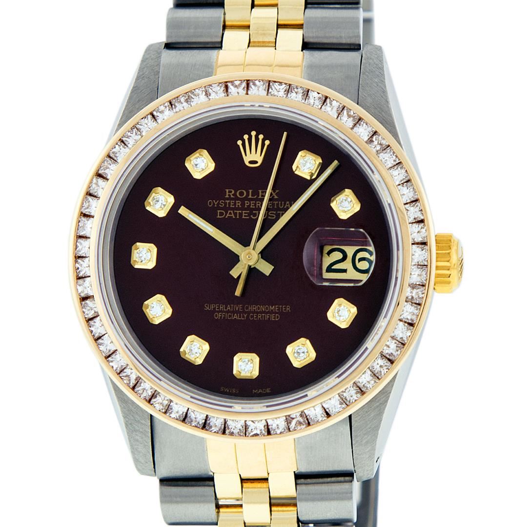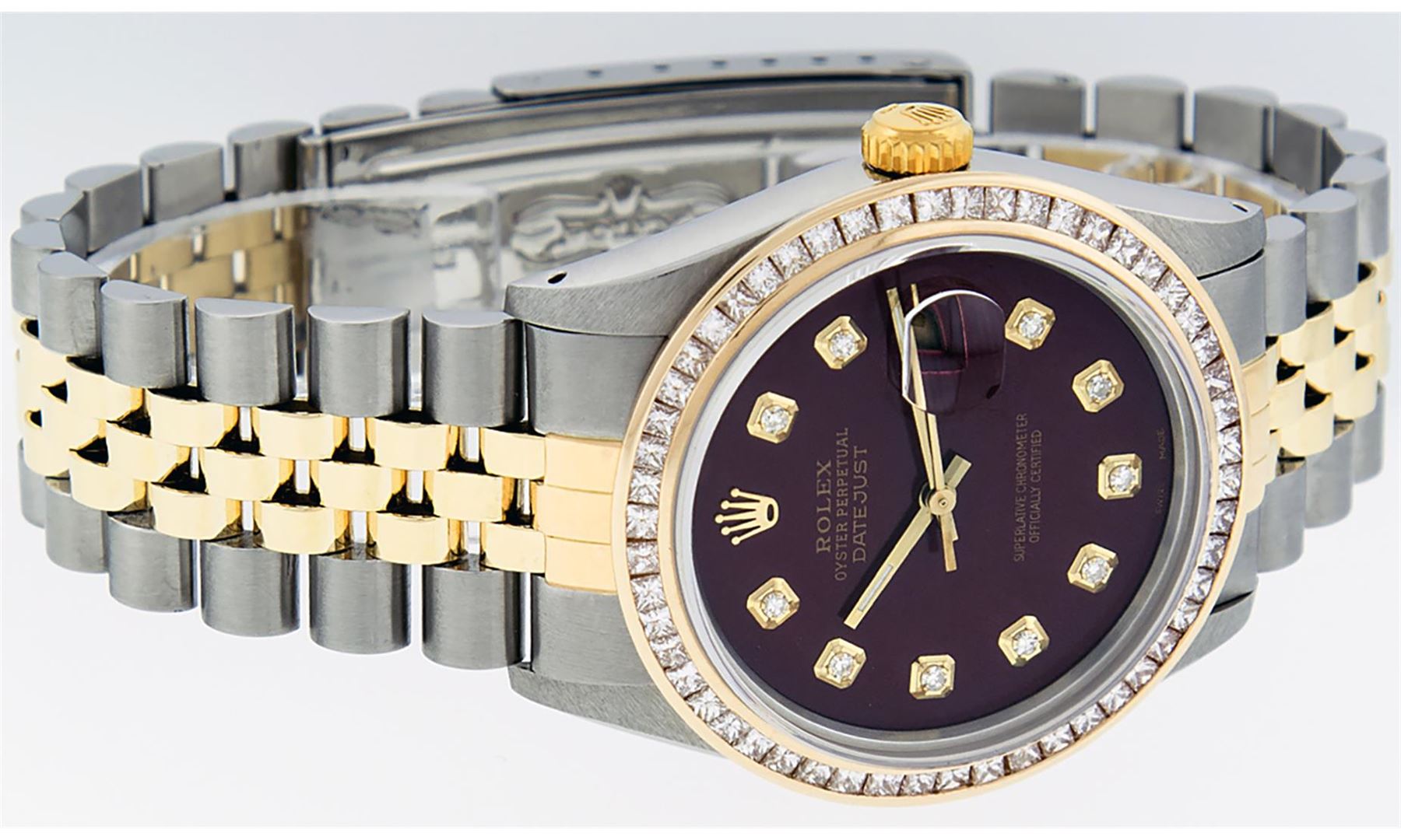 One Mens 14K Yellow Gold Two Tone Rolex Datejust Polished Bright with Satin Finish, Serviced & Electronically Tested, 14K Yellow Gold And Stainless Steel Case: 36mm, 14K Yellow Gold Crown, Custom Bezel: New 14K Yellow Gold Princess Cut Diamond Bezel, Diamond Count: 53 Diamonds, Total Weight 2.75 Carat, Clarity: SI-VS, Color: G to H. Custom Crystal: New Scratch Resistant Synthetic Sapphire Cyclops Lens. Custom Hands: New Luminecent Hands. Movement: Automatic Winding Movement Caliber 3035. Custom Dial: Maroon Single Cut Diamond Dial, Diamond Count: 10 Diamonds in Dial, Dial Color: G To H In Color, Clarity: VS2. Date Window: 3 O'Clock Position Date Display, Quickset, Model: Datejust. Condition: G-6 Extra Fine. Bracelet: 14K Yellow Gold And Stainless Steel Jubilee. Bright Polish & Satin Finish. 7.0 Inch Length, Adjustable. Standard Clasp, With Rolex Logo. This Watch Has Been Serviced and Polished And It Is Free Of All Dents And Scratches And Has Been Time Tested.