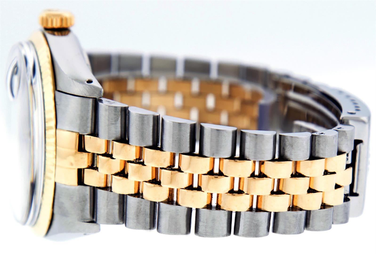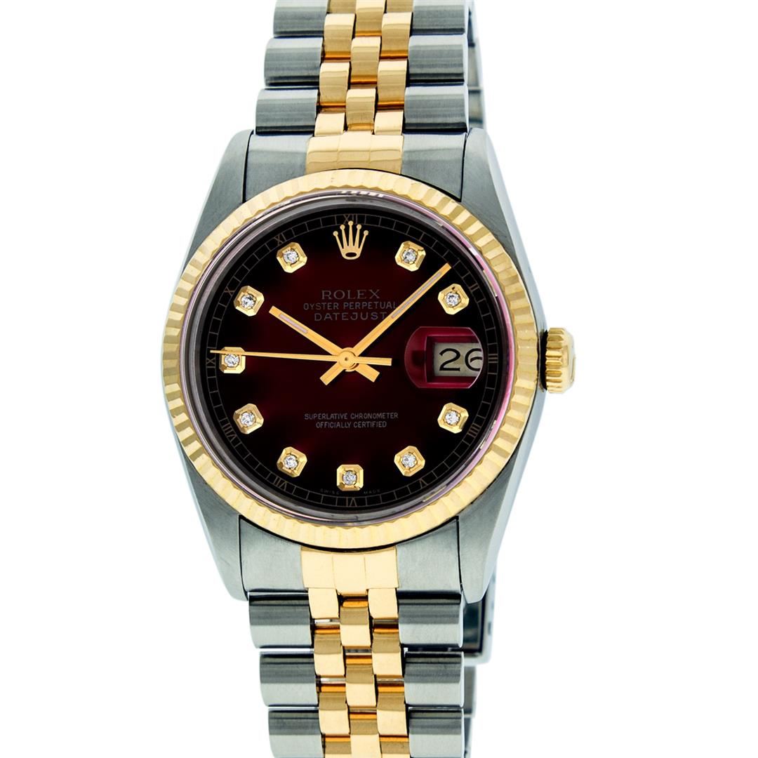 One Mens 14K Yellow Gold Two Tone Rolex Datejust Polished, Serviced & Electronically Tested, 14K Yellow Gold & Stainless Steel Case: 36mm, 14K Yellow Gold Crown, Bezel: 14K Yellow Gold Fluted Bezel. Custom Crystal: New Acrylic Cyclops Lens. Custom Hands: New Luminecent Hands. Movement: Automatic Winding Movement Caliber 3035. Custom Dial: Red Vignette Set With Diamond Hour Markers And Square Roman Track, Diamond Count: 10 Diamonds in Dial, G To H In Color, SI-VS Clarity. Date Window: 3 O'Clock Position Date Display, Quickset, Model: 16013 Datejust, Condition: G-6 Extra Fine. Bracelet: Two Tone 14K Yellow Gold & Stainless Steel Jubilee. Bright Polish. 7.0 Inch Length, Adjustable. Standard Clasp, With Rolex Logo. This Watch Has Been Serviced And Polished It Is Free Of All Scratches And Dents.