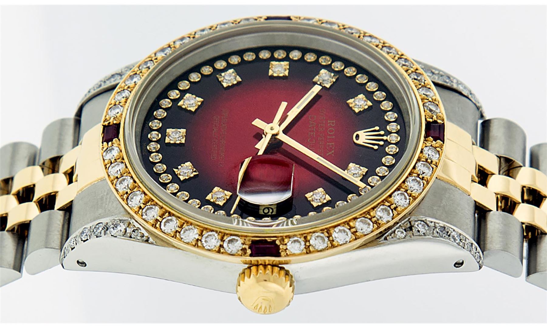 One Mens 14K Yellow Gold Rolex Datejust Polished Bright with Satin Finish, Serviced & Electronically Tested, Stainless Steel Case: 36mm, Custom Diamond Lugs: 28 Diamonds On Lugs, Color: G to H, Clarity: SI-VS. Yellow Gold Crown, Custom Bezel: New 18K Yellow Gold Beadset Diamond + Ruby Bezel, Diamond + Stone Count: 36 Diamonds + 4 Rubies, Total Weight 1.00 Carat, Clarity: SI-VS, Color: G to H. Custom Crystal: New Scratch Resistant Synthetic Sapphire Cyclops Lens. Custom Hands: New Luminecent Hands. Movement: Automatic Winding Movement Caliber 3035. Custom Dial: Red Vignette Single Cut String Diamond Dial, Stone Count: 58 Diamonds In Dial, Color: G to H, Clarity: VS2. Date Window: 3 O'Clock Position Date Display, Quickset, Model: 16013 Datejust. Condition: G-6 Extra Fine. Bracelet: 14K Yellow Gold And Stainless Steel Jubilee Band. Bright Polish & Satin Finish. 7.0 Inch Length, Adjustable. Standard Clasp, With Rolex Logo. This Watch Has Been Serviced And Polished It Is Free Of All Scratches And Dents.