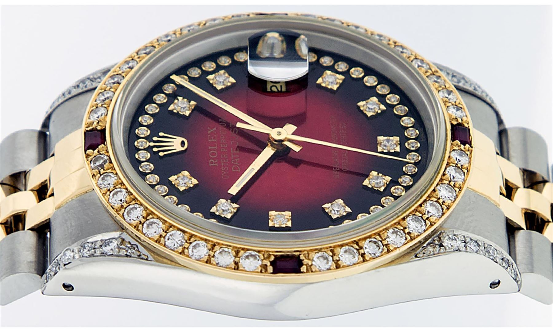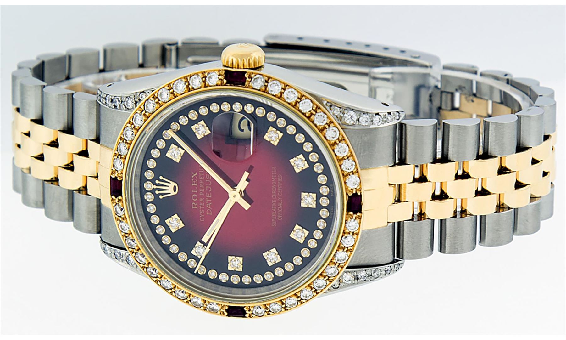 One Mens 14K Yellow Gold Rolex Datejust Polished Bright with Satin Finish, Serviced & Electronically Tested, Stainless Steel Case: 36mm, Custom Diamond Lugs: 28 Diamonds On Lugs, Color: G to H, Clarity: SI-VS. Yellow Gold Crown, Custom Bezel: New 18K Yellow Gold Beadset Diamond + Ruby Bezel, Diamond + Stone Count: 36 Diamonds + 4 Rubies, Total Weight 1.00 Carat, Clarity: SI-VS, Color: G to H. Custom Crystal: New Scratch Resistant Synthetic Sapphire Cyclops Lens. Custom Hands: New Luminecent Hands. Movement: Automatic Winding Movement Caliber 3035. Custom Dial: Red Vignette Single Cut String Diamond Dial, Stone Count: 58 Diamonds In Dial, Color: G to H, Clarity: VS2. Date Window: 3 O'Clock Position Date Display, Quickset, Model: 16013 Datejust. Condition: G-6 Extra Fine. Bracelet: 14K Yellow Gold And Stainless Steel Jubilee Band. Bright Polish & Satin Finish. 7.0 Inch Length, Adjustable. Standard Clasp, With Rolex Logo. This Watch Has Been Serviced And Polished It Is Free Of All Scratches And Dents.