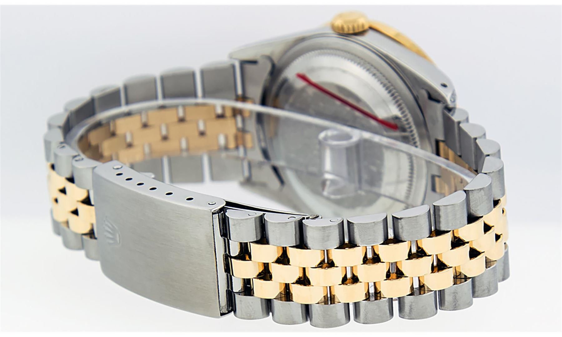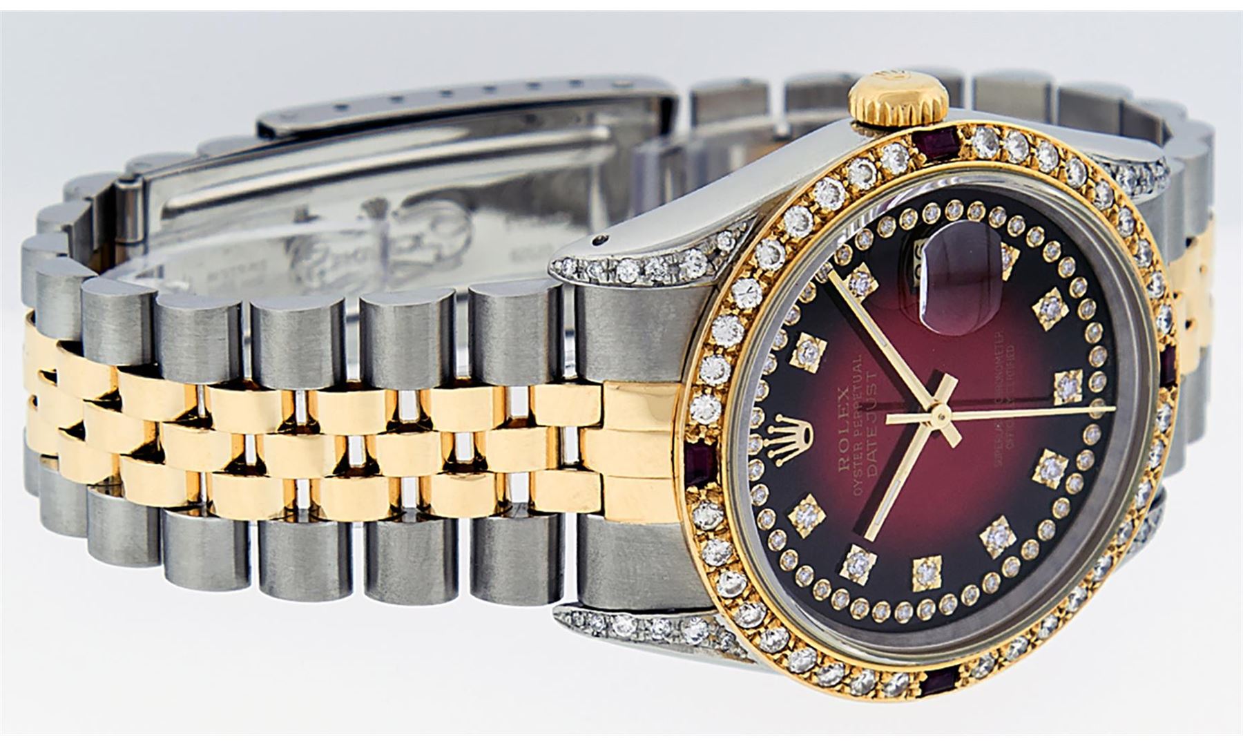 One Mens 14K Yellow Gold Rolex Datejust Polished Bright with Satin Finish, Serviced & Electronically Tested, Stainless Steel Case: 36mm, Custom Diamond Lugs: 28 Diamonds On Lugs, Color: G to H, Clarity: SI-VS. Yellow Gold Crown, Custom Bezel: New 18K Yellow Gold Beadset Diamond + Ruby Bezel, Diamond + Stone Count: 36 Diamonds + 4 Rubies, Total Weight 1.00 Carat, Clarity: SI-VS, Color: G to H. Custom Crystal: New Scratch Resistant Synthetic Sapphire Cyclops Lens. Custom Hands: New Luminecent Hands. Movement: Automatic Winding Movement Caliber 3035. Custom Dial: Red Vignette Single Cut String Diamond Dial, Stone Count: 58 Diamonds In Dial, Color: G to H, Clarity: VS2. Date Window: 3 O'Clock Position Date Display, Quickset, Model: 16013 Datejust. Condition: G-6 Extra Fine. Bracelet: 14K Yellow Gold And Stainless Steel Jubilee Band. Bright Polish & Satin Finish. 7.0 Inch Length, Adjustable. Standard Clasp, With Rolex Logo. This Watch Has Been Serviced And Polished It Is Free Of All Scratches And Dents.