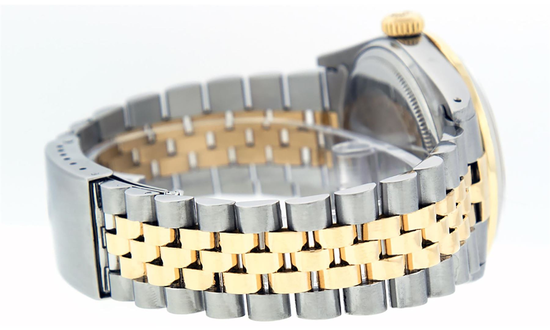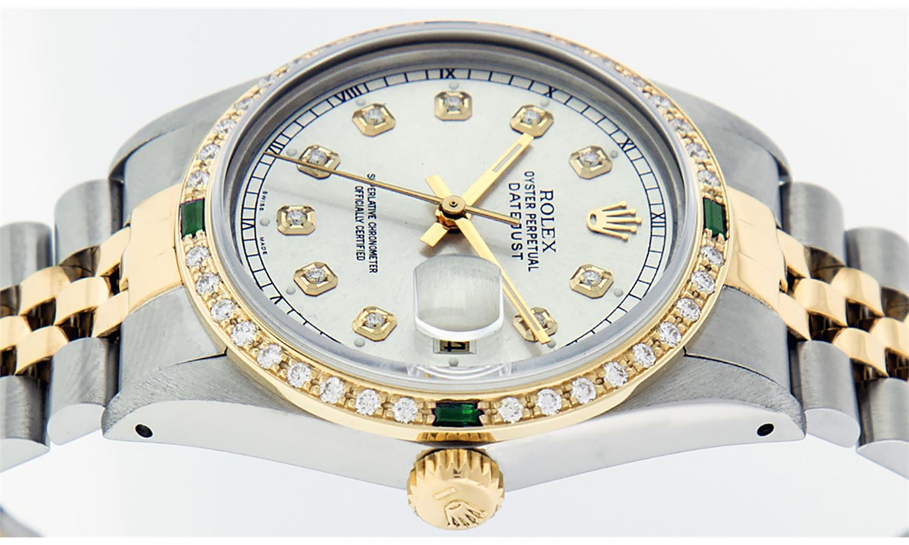One Mens 14K Yellow Gold Two Tone Rolex Datejust Polished, Serviced & Electronically Tested, 14K Yellow Gold & Stainless Steel Case: 36mm, 14K Yellow Gold Crown, Custom Bezel: New 18K Yellow Gold Emerald Beadset Diamond Bezel, Diamond Count: 36 Diamonds + 4 Emeralds, Total Weight 1.00 Carat, Clarity: SI-VS, Color: G to H. Custom Crystal: New Scratch Resistant Synthetic Sapphire Cyclops Lens. Custom Hands: New Luminecent Hands. Movement: Automatic Winding Movement Caliber 3035. Custom Dial: Silver Diamond With Square Roman Track & Lumi Dots. Diamond Count: 10 Diamonds In Dial, Clarity: SI-VS, Color: Color G to H Date Window: 3 O'Clock Position Date Display, Quickset, Model: 16013 Datejust, Condition: G-6 Extra Fine. Bracelet:Two Tone 14K Yellow Gold & Stainless Steel Jubilee. Bright Polish. 7.0 Inch Length, Adjustable. Standard Clasp, With Rolex Logo. This Watch Has Been Serviced Time Tested And Is In Excellent Condition It Is Free Of All Scratches And Dents.