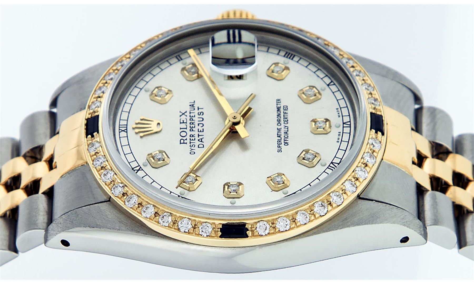 One Mens 14K Yellow Gold Two Tone Rolex Datejust Polished, Serviced & Electronically Tested, 14K Yellow Gold & Stainless Steel Case: 36mm, 14K Yellow Gold Crown, Custom Bezel: New 18K Yellow Gold Sapphire Beadset Diamond Bezel, Diamond Count: 36 Diamonds + 4 Sapphires, Total Weight 1.00 Carat, Clarity: SI-VS, Color: G to H. Custom Crystal: New Scratch Resistant Synthetic Sapphire Cyclops Lens. Custom Hands: New Luminecent Hands. Movement: Automatic Winding Movement Caliber 3035. Custom Dial: Silver Diamond With Square Roman Track & Lumi Dots. Diamond Count: 10 Diamonds In Dial, Clarity: SI-VS, Color: Color G to H Date Window: 3 O'Clock Position Date Display, Quickset, Model: 16013 Datejust. Condition: G-6 Extra Fine. Bracelet:Two Tone 14K Yellow Gold & Stainless Steel Jubilee. Bright Polish. 7.0 Inch Length, Adjustable. Standard Clasp, With Rolex Logo. This Watch Has Been Serviced Time Tested And Is In Excellent Condition It Is Free Of All Scratches And Dents.