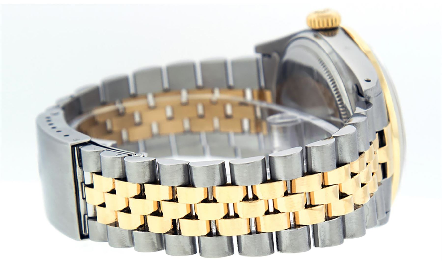 One Mens 14K Yellow Gold Two Tone Rolex Datejust Polished, Serviced & Electronically Tested, 14K Yellow Gold & Stainless Steel Case: 36mm, 14K Yellow Gold Crown, Custom Bezel: New 18K Yellow Gold Sapphire Beadset Diamond Bezel, Diamond Count: 36 Diamonds + 4 Sapphires, Total Weight 1.00 Carat, Clarity: SI-VS, Color: G to H. Custom Crystal: New Scratch Resistant Synthetic Sapphire Cyclops Lens. Custom Hands: New Luminecent Hands. Movement: Automatic Winding Movement Caliber 3035. Custom Dial: Silver Diamond With Square Roman Track & Lumi Dots. Diamond Count: 10 Diamonds In Dial, Clarity: SI-VS, Color: Color G to H Date Window: 3 O'Clock Position Date Display, Quickset, Model: 16013 Datejust. Condition: G-6 Extra Fine. Bracelet:Two Tone 14K Yellow Gold & Stainless Steel Jubilee. Bright Polish. 7.0 Inch Length, Adjustable. Standard Clasp, With Rolex Logo. This Watch Has Been Serviced Time Tested And Is In Excellent Condition It Is Free Of All Scratches And Dents.