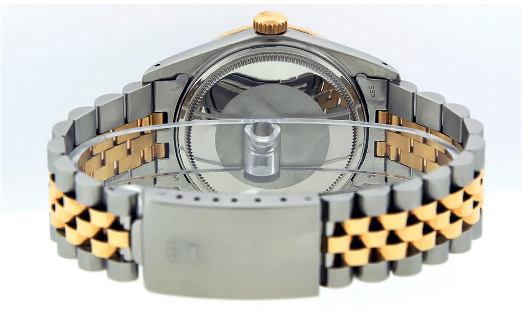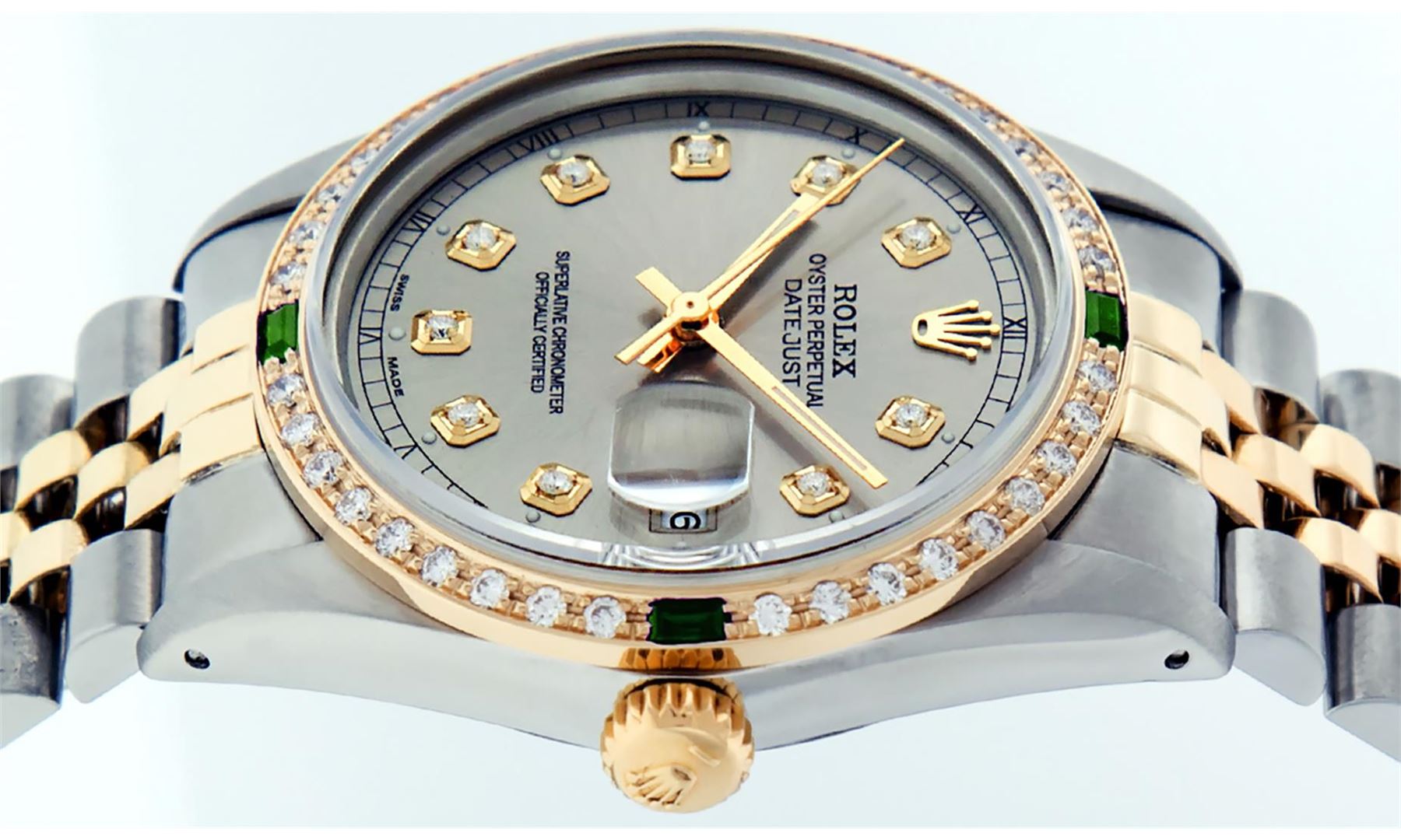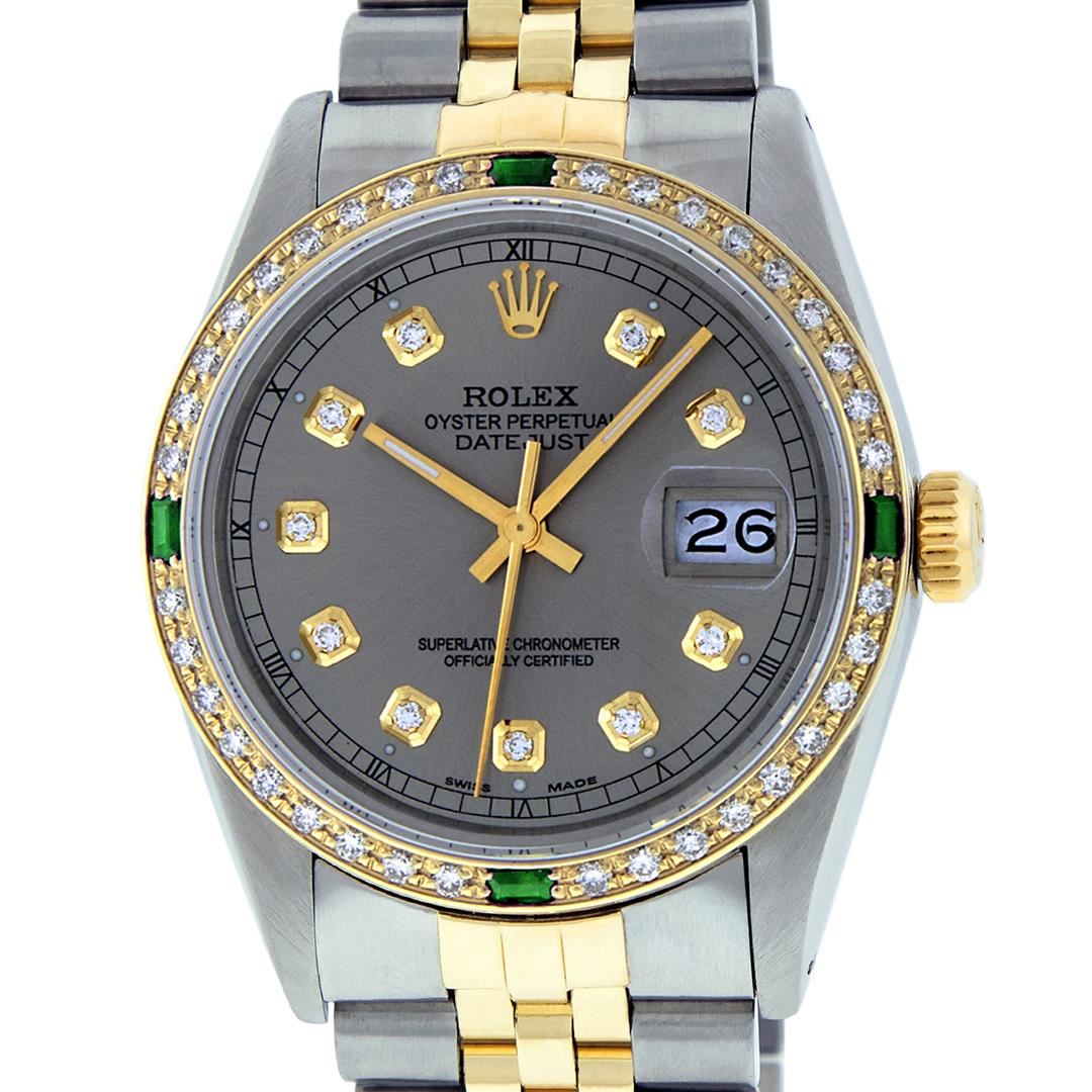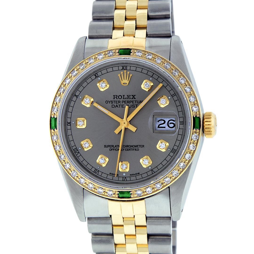 One Mens 14K Yellow Gold Two Tone Rolex Datejust Polished, Serviced & Electronically Tested, 14K Yellow Gold & Stainless Steel Case: 36mm, 14K Yellow Gold Crown, Custom Bezel: New 18K Yellow Gold Emerald Beadset Diamond Bezel, Diamond Count: 36 Diamonds + 4 Emeralds, Total Weight 1.00 Carat, Clarity: SI-VS, Color: G to H. Custom Crystal: New Scratch Resistant Synthetic Sapphire Cyclops Lens. Custom Hands: New Luminecent Hands. Movement: Automatic Winding Movement Caliber 3035. Custom Dial: Slate Grey Diamond With Square Roman Track & Lumi Dots. Diamond Count: 10 Diamonds In Dial, Clarity: SI-VS, Color: Color G to H Date Window: 3 O'Clock Position Date Display, Quickset, Model: 16013 Datejust. Condition: G-6 Extra Fine. Bracelet:Two Tone 14K Yellow Gold & Stainless Steel Jubilee. Bright Polish. 7.0 Inch Length, Adjustable. Standard Clasp, With Rolex Logo. This Watch Has Been Serviced Time Tested And Is In Excellent Condition It Is Free Of All Scratches And Dents.