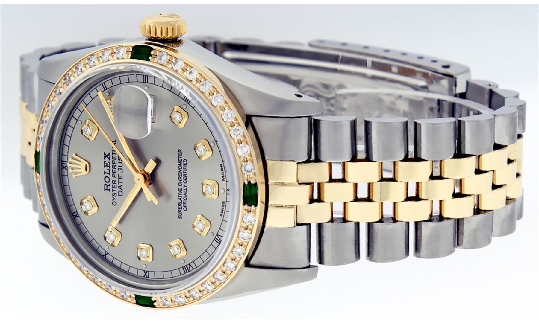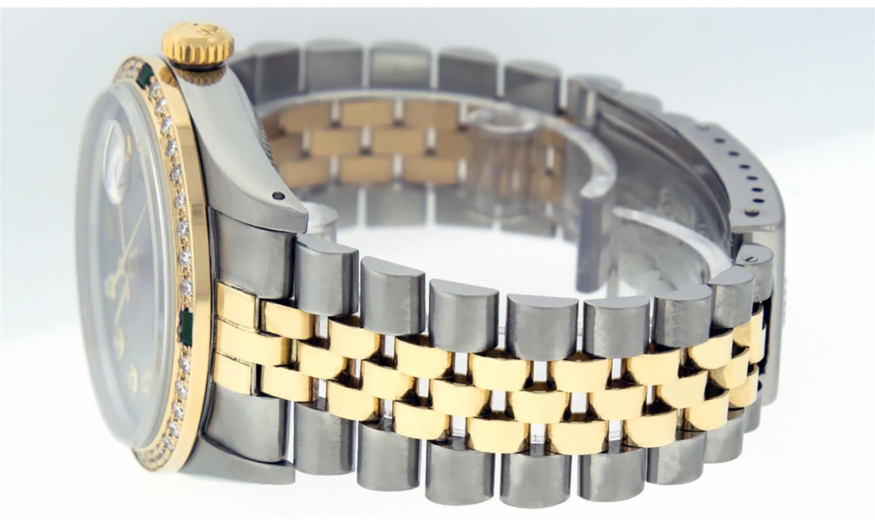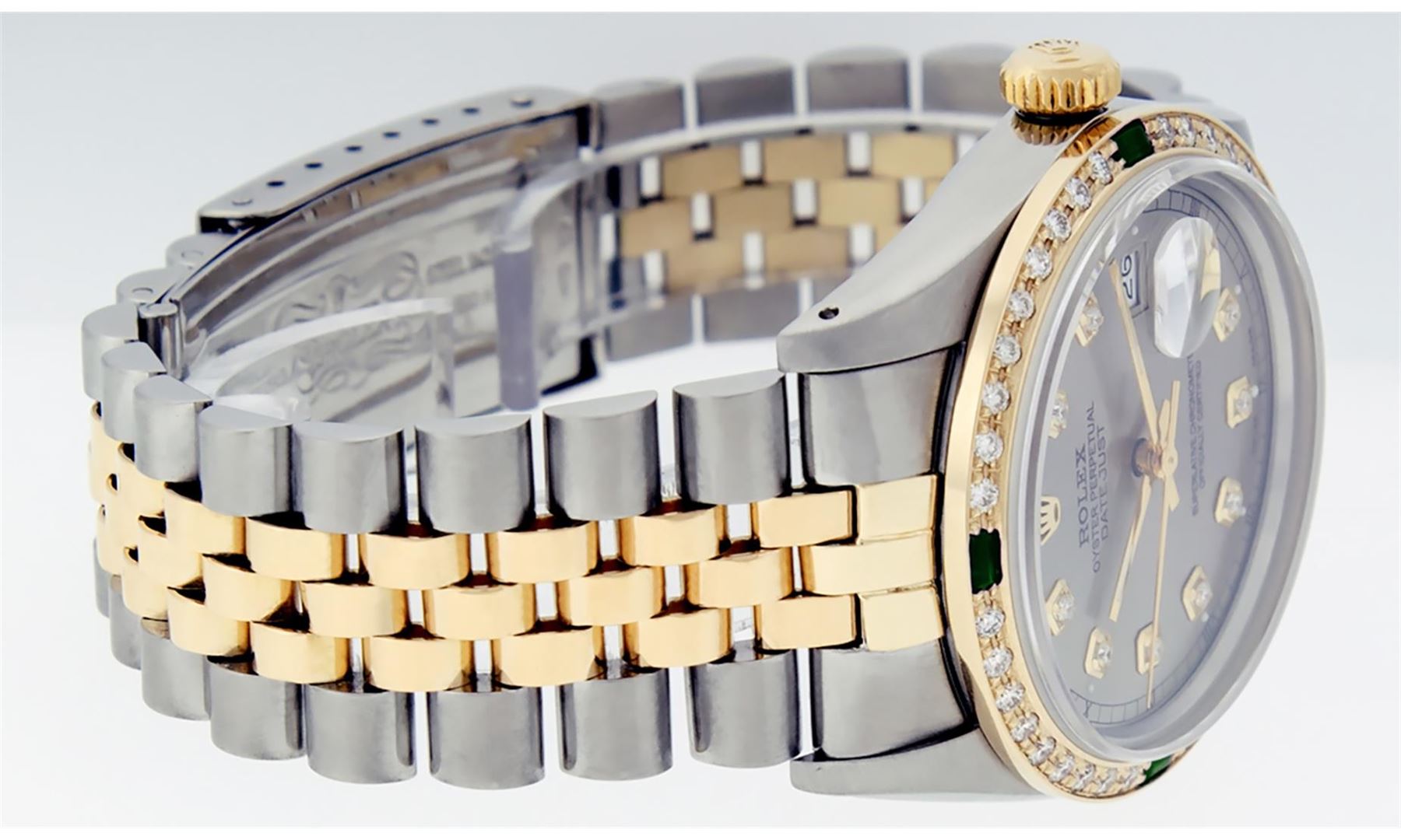One Mens 14K Yellow Gold Two Tone Rolex Datejust Polished, Serviced & Electronically Tested, 14K Yellow Gold & Stainless Steel Case: 36mm, 14K Yellow Gold Crown, Custom Bezel: New 18K Yellow Gold Emerald Beadset Diamond Bezel, Diamond Count: 36 Diamonds + 4 Emeralds, Total Weight 1.00 Carat, Clarity: SI-VS, Color: G to H. Custom Crystal: New Scratch Resistant Synthetic Sapphire Cyclops Lens. Custom Hands: New Luminecent Hands. Movement: Automatic Winding Movement Caliber 3035. Custom Dial: Slate Grey Diamond With Square Roman Track & Lumi Dots. Diamond Count: 10 Diamonds In Dial, Clarity: SI-VS, Color: Color G to H Date Window: 3 O'Clock Position Date Display, Quickset, Model: 16013 Datejust. Condition: G-6 Extra Fine. Bracelet:Two Tone 14K Yellow Gold & Stainless Steel Jubilee. Bright Polish. 7.0 Inch Length, Adjustable. Standard Clasp, With Rolex Logo. This Watch Has Been Serviced Time Tested And Is In Excellent Condition It Is Free Of All Scratches And Dents.