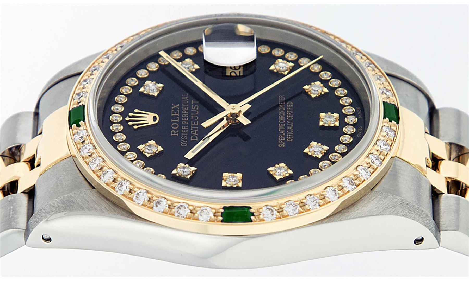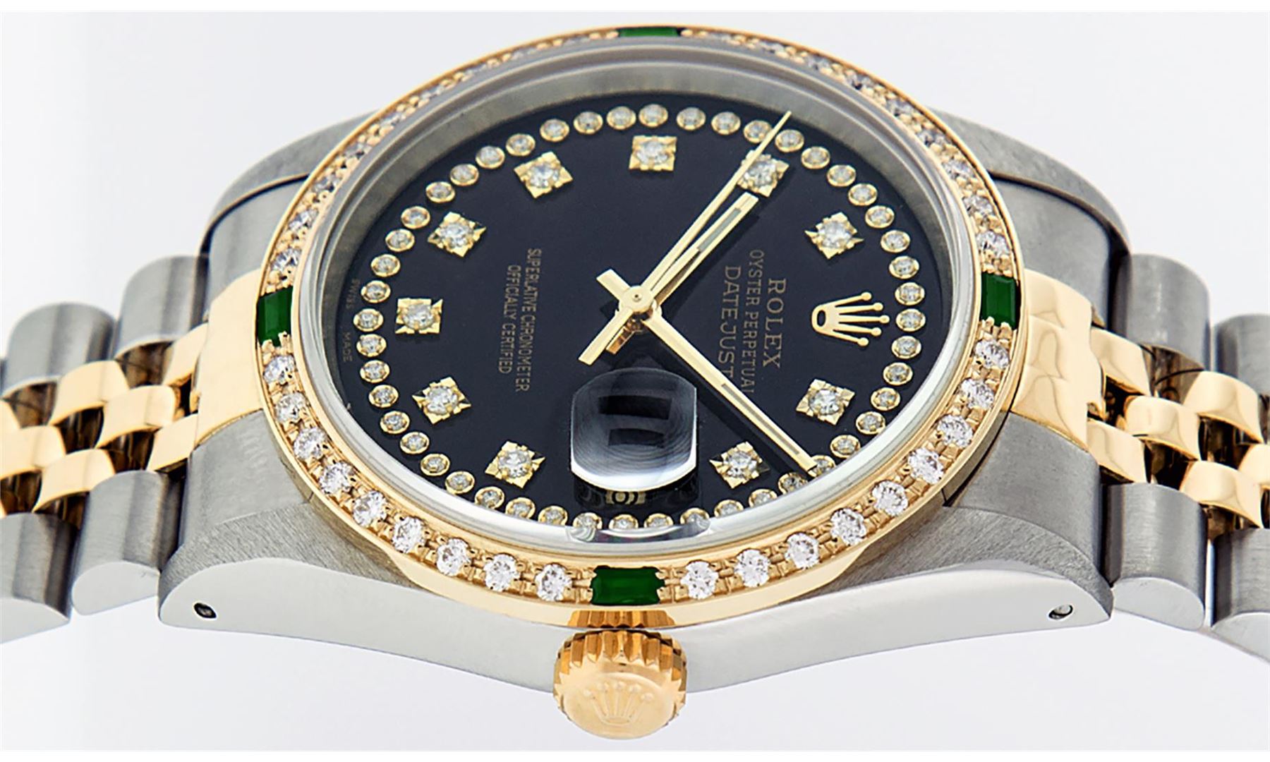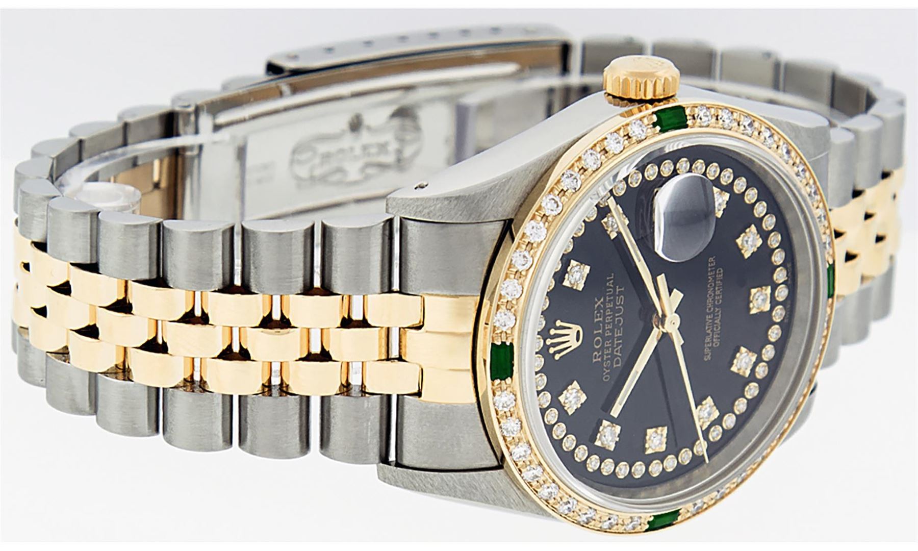 One Mens 14K Yellow Gold Two Tone Rolex Datejust Polished, Serviced & Electronically Tested, 14K Yellow Gold & Stainless Steel Case: 36mm, 14K Yellow Gold Crown, Custom Bezel: 18K Yellow Gold Emerald Beadset Diamond Bezel, Diamond Count: 36 Diamonds + 4 Emeralds, Total Weight 1.0 Carat, Clarity: SI-VS, Color: G to H. Custom Crystal: New Scratch Resistant Synthetic Sapphire Cyclops Lens. Custom Hands: New Luminecent Hands. Movement: Automatic Winding Movement Caliber 3035. Custom Dial: Black String Single Cut Diamond Dial, Diamond Count: 58 Diamonds In Dial, Color: G to H, Clairty: VS2 Date Window: 3 O'Clock Position Date Display, Quickset, Model: 16013 Condition: G-6 Extra Fine. Bracelet: Two Tone 14K Yellow Gold & Stainless Steel Jubilee Band. Bright Polish. 7.0 Inch Length, Adjustable. Standard Clasp, With Rolex Logo. This Watch Has Been Serviced Time Tested And Is In Excellent Condition It Is Free Of All Scratches And Dents.
