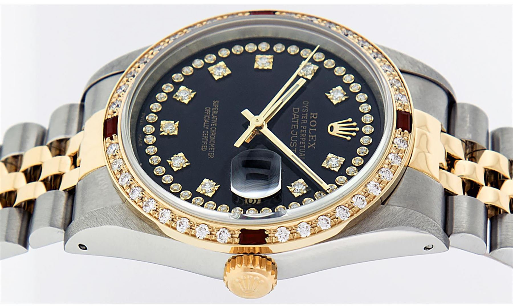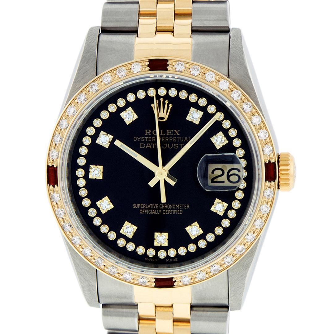 One Mens 14K Yellow Gold Two Tone Rolex Datejust Polished, Serviced & Electronically Tested, 14K Yellow Gold & Stainless Steel Case: 36mm, 14K Yellow Gold Crown, Custom Bezel: New 18K Yellow Gold Ruby Beadset Diamond Bezel, Diamond Count: 36 Diamonds + 4 Rubies In Bezel, Total Weight 1.0 Carat, Clarity: SI-VS, Color: G to H. Custom Crystal: New Scratch Resistant Synthetic Sapphire Cyclops Lens. Custom Hands: New Luminecent Hands. Movement: Automatic Winding Movement Caliber 3035. Custom Dial: Black String Single Cut Diamond�Dial, Diamond Count: 58 Diamonds In Dial, Color: G to H, Clairty: VS2 Date Window: 3 O'Clock Position Date Display,� Quickset, Model: 16013 Datejust, Condition: G-6 Extra Fine. Bracelet: Two Tone 14K Yellow Gold & Stainless Steel Jubilee Band. Bright Polish. 7.0 Inch Length, Adjustable. Standard Clasp, With Rolex Logo. This Watch Has Been Serviced Time Tested And Is In Excellent Condition It Is Free Of All Scratches And Dents.