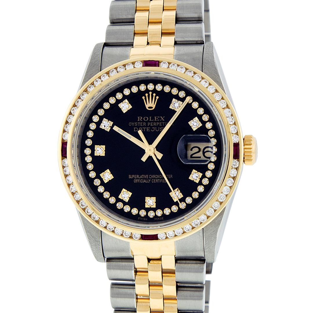One Mens 14K Yellow Gold Two Tone Rolex Datejust Polished, Serviced & Electronically Tested, 14K Yellow Gold & Stainless Steel Case: 36mm, 14K Yellow Gold Crown, Custom Bezel: 18K Yellow Gold Ruby Channel Set Diamond Bezel, Diamond Count: 52 Diamonds + 4 Rubies, Total Weight 1.30 Carat, Clarity: SI-VS, Color: G to H. Custom Crystal: New Scratch Resistant Synthetic Sapphire Cyclops Lens. Custom Hands: New Luminecent Hands. Movement: Automatic Winding Movement Caliber 3035. Custom Dial: Black String Diamond Dial With Single Cut Diamonds, Diamond Count: 58 Diamonds in Dial. Date Window: 3 O'Clock Position Date Display, Quickset, Model: 16013 Datejust. Condition: G-6 Extra Fine. Bracelet:Two Tone 14K Yellow Gold & Stainless Steel Jubilee Band. Bright Polish. 7.0 Inch Length, Adjustable. Standard Clasp, With Rolex Logo. This Watch Has Been Serviced Time Tested And Is In Excellent Condition It Is Free Of All Scratches And Dents.