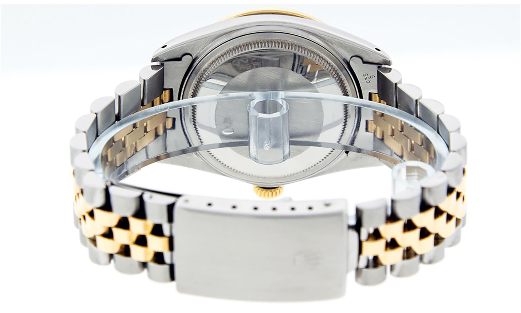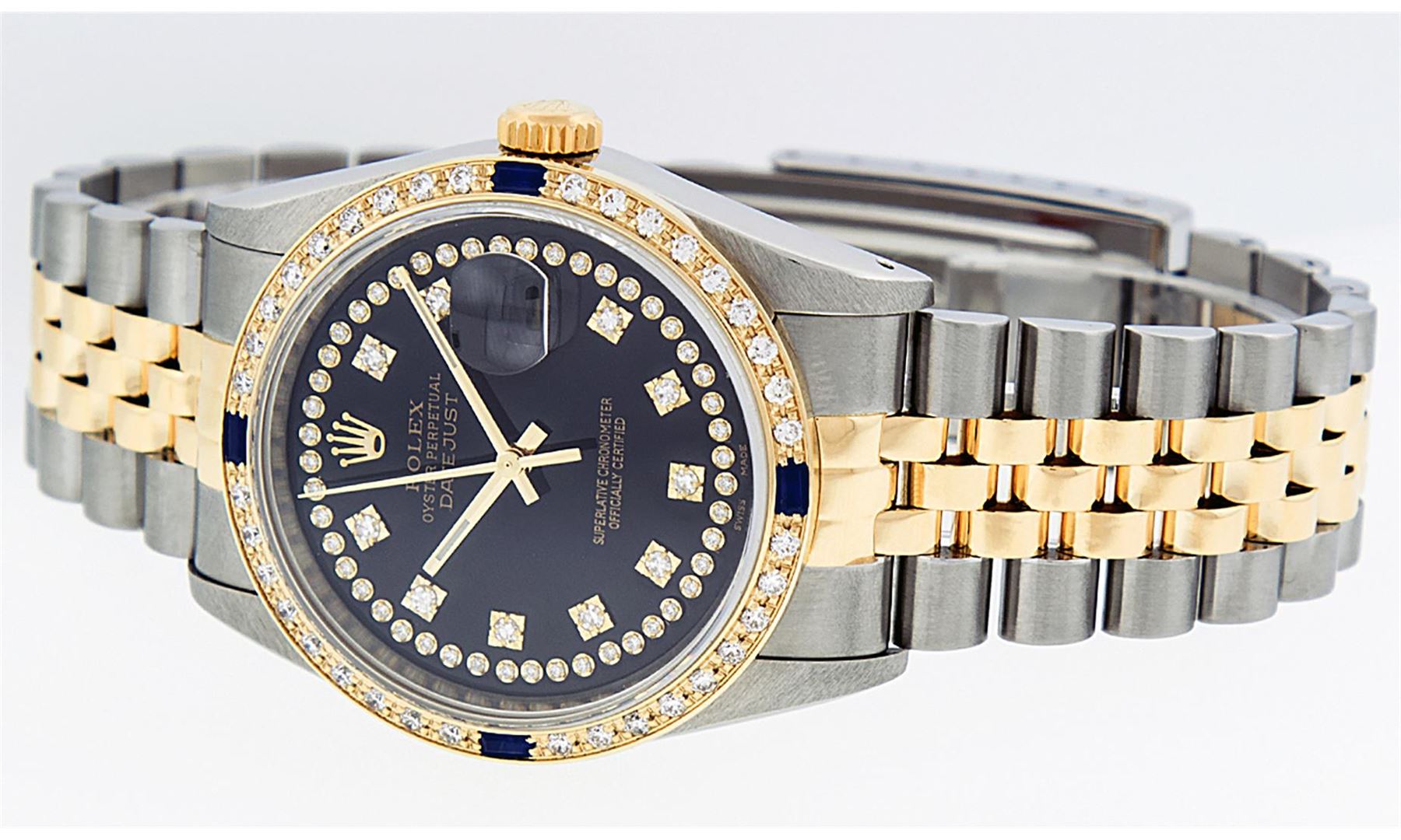 One Mens 14K Yellow Gold Two Tone Rolex Datejust Polished, Serviced & Electronically Tested, 14K Yellow Gold & Stainless Steel Case: 36mm, 14K Yellow Gold Crown, Custom Bezel: 18K Yellow Gold Sapphire Beadset Diamond Bezel, Diamond Count: 36 Diamonds + 4 Sapphires, Total Weight 1.0 Carat, Clarity: SI-VS, Color: G to H. Custom Crystal: New Scratch Resistant Synthetic Sapphire Cyclops Lens. Custom Hands: New Luminecent Hands. Movement: Automatic Winding Movement Caliber 3035. Custom Dial: Black String Single Cut Diamond Dial, Diamond Count: 58 Diamonds In Dial, Color: G to H, Clairty: SI-VS Date Window: 3 O'Clock Position Date Display, Quickset, Model: 16013 Datejust, Condition: G-6 Extra Fine. Bracelet: Two Tone 14K Yellow Gold & Stainless Steel Jubilee Band. Bright Polish. 7.0 Inch Length, Adjustable. Standard Clasp, With Rolex Logo. This Watch Has Been Serviced Time Tested And Is In Excellent Condition It Is Free Of All Scratches And Dents.