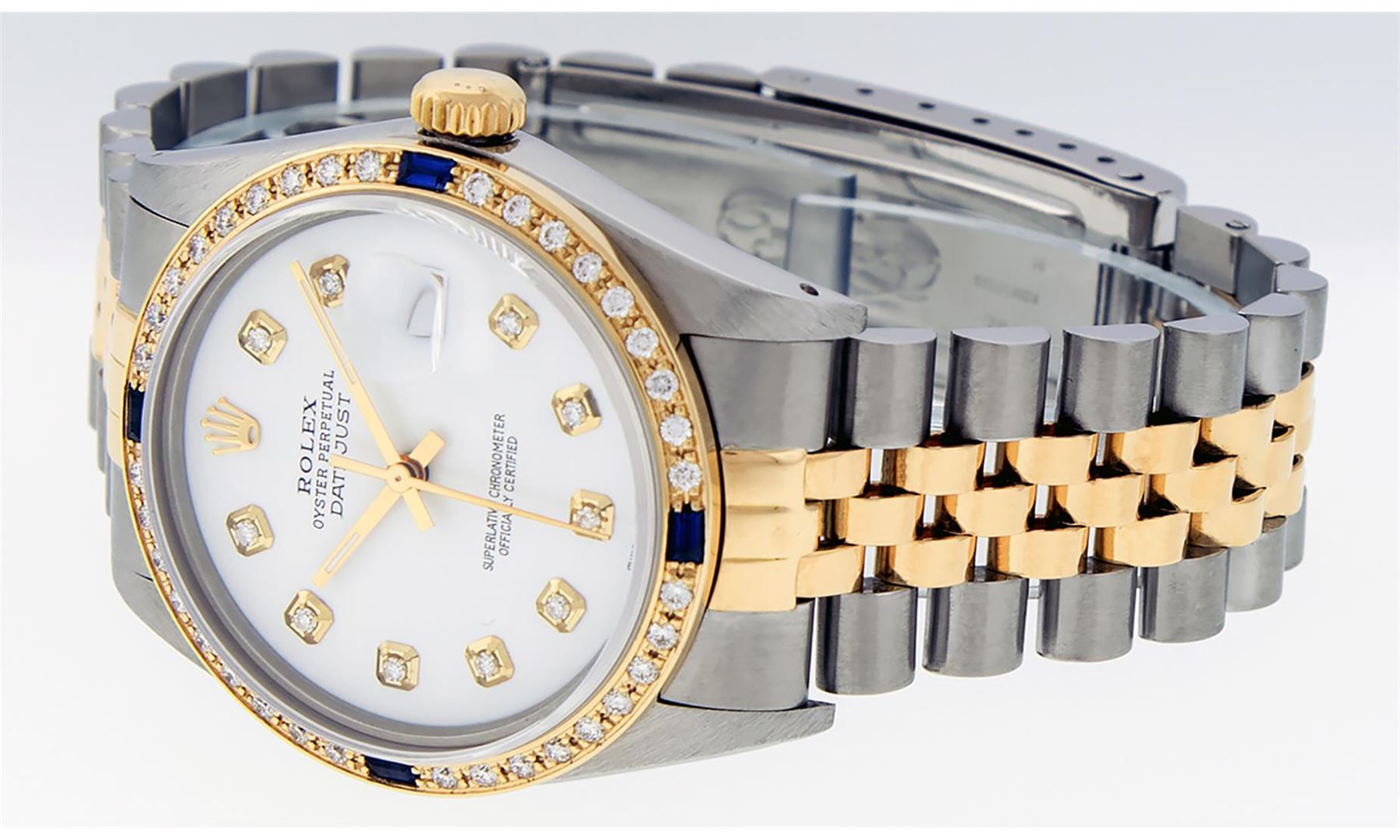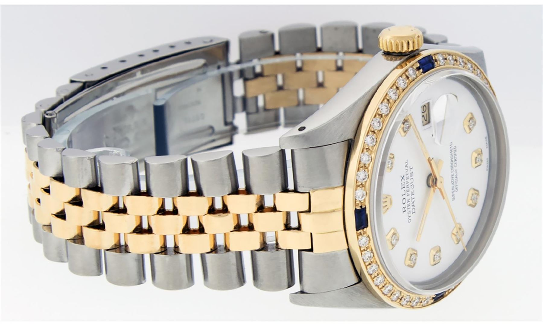 One Mens 14K Yellow Gold Two Tone Rolex Datejust Polished, Serviced & Electronically Tested, 14K Yellow Gold & Stainless Steel Case: 36mm, 14K Yellow Gold Crown, Custom Bezel: New 18K Yellow Gold Sapphire Beadset Diamond Bezel, Stone Count: 36 Diamonds + 4 Sapphires, Total Weight 1.00 Carat, Clarity: SI-VS, Color: G to H. Custom Crystal: New Scratch Resistant Synthetic Sapphire Cyclops Lens. Custom Hands: New Luminecent Hands. Movement: Automatic Winding Movement Caliber 3035. Custom Dial: White Dial With Diamond Hour Markers, Diamond Count: 10 Diamonds, Clarity: VS2-SI1, Color: G to H. Date Window: 3 O'Clock Position Date Display, Quickset, Model: 16013 Datejust. Condition: G-6 Extra Fine. Bracelet: Two Tone 14K Yellow Gold & Stainless Steel Jubilee. Bright Polish. 7.0 Inch Length, Adjustable. Standard Clasp, With Rolex Logo. This Watch Has Been Serviced Time Tested And Is In Excellent Condition It Is Free Of All Scratches And Dents.