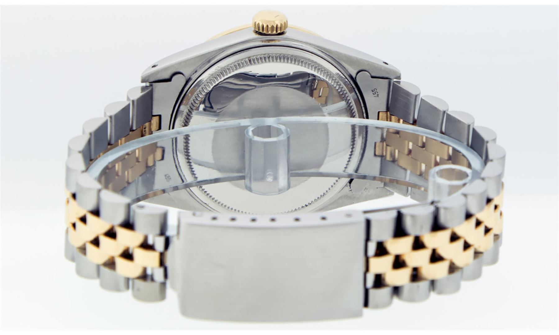 One Mens 14K Yellow Gold Two Tone Rolex Datejust Polished, Serviced & Electronically Tested, 14K Yellow Gold & Stainless Steel Case: 36mm, 14K Yellow Gold Crown, Custom Bezel: New 18K Yellow Gold Sapphire Beadset Diamond Bezel, Stone Count: 36 Diamonds + 4 Sapphires, Total Weight 1.00 Carat, Clarity: SI-VS, Color: G to H. Custom Crystal: New Scratch Resistant Synthetic Sapphire Cyclops Lens. Custom Hands: New Luminecent Hands. Movement: Automatic Winding Movement Caliber 3035. Custom Dial: White Dial With Diamond Hour Markers, Diamond Count: 10 Diamonds, Clarity: VS2-SI1, Color: G to H. Date Window: 3 O'Clock Position Date Display, Quickset, Model: 16013 Datejust. Condition: G-6 Extra Fine. Bracelet: Two Tone 14K Yellow Gold & Stainless Steel Jubilee. Bright Polish. 7.0 Inch Length, Adjustable. Standard Clasp, With Rolex Logo. This Watch Has Been Serviced Time Tested And Is In Excellent Condition It Is Free Of All Scratches And Dents.
