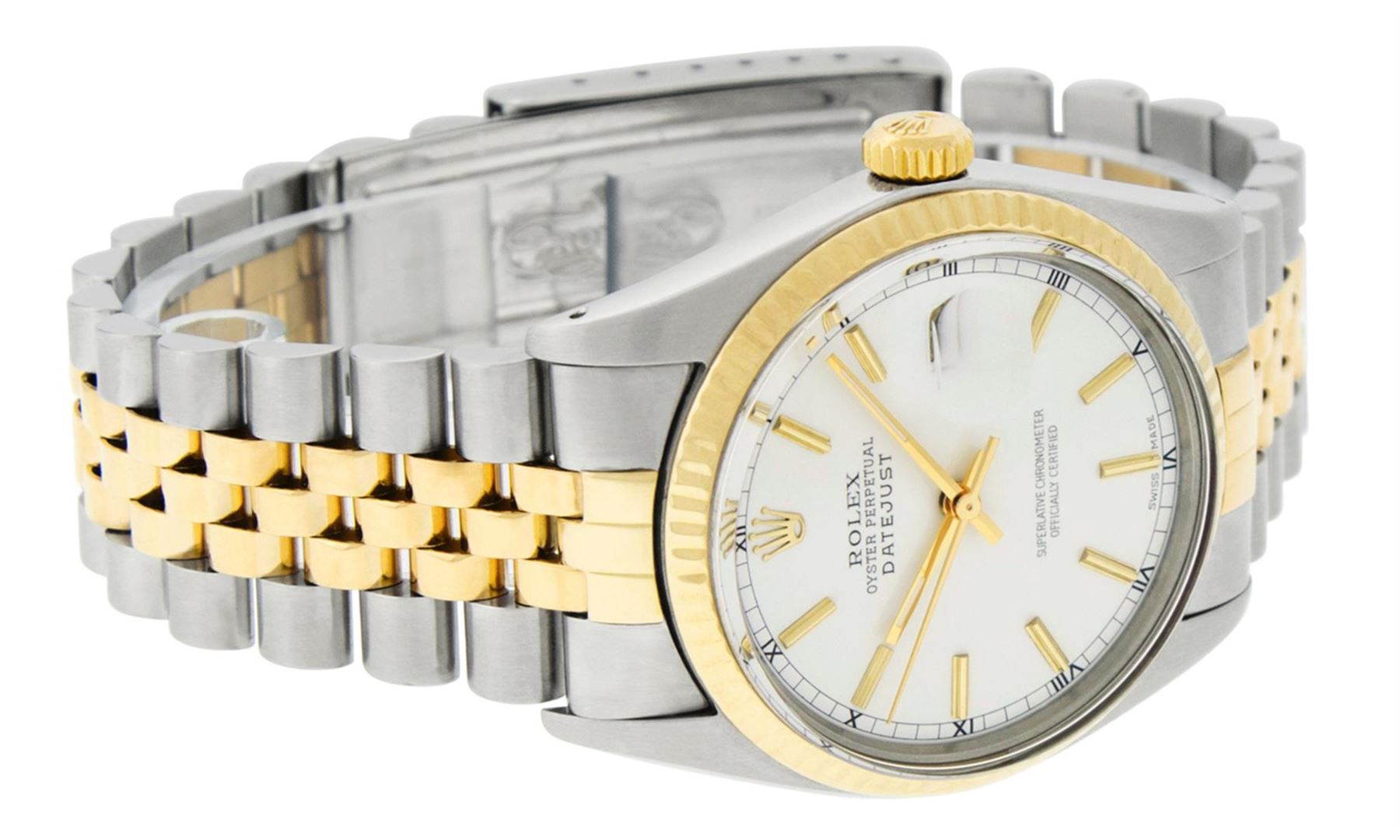 One Mens 14K Yellow Gold Two Tone Rolex Datejust Polished, Serviced & Electronically Tested, 14K Yellow Gold & Stainless Steel Case: 36mm,14K Yellow Gold Crown, Bezel: 14K Yellow Gold Fluted Bezel. Custom Crystal: New Acrylic Cyclops Lens. Custom Hands: New Luminecent Hands. Movement: Automatic Winding Movement Caliber 3035. Custom Dial: White Index With Square Roman Track. Date Window: 3 O'Clock Position Date Display, Quickset, Model: 16013 Datejust. Condition: G-6 Extra Fine. Bracelet:Two Tone 14K Yellow Gold & Stainless Steel Jubilee Band. Bright Polish. 7.0 Inch Length, Adjustable. Standard Clasp, With Rolex Logo. This Watch Has Been Serviced Time Tested And Is In Excellent Condition It Is Free Of All Scratches And Dents.