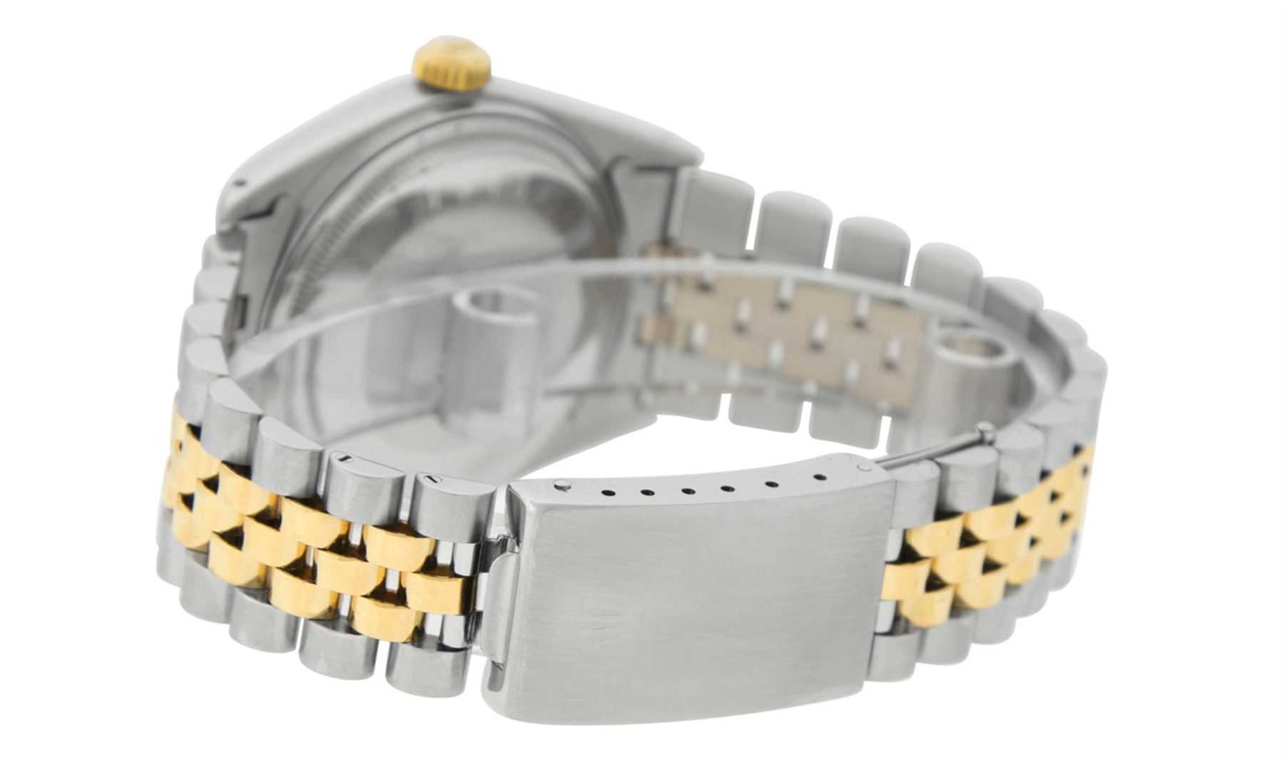 One Mens 14K Yellow Gold Two Tone Rolex Datejust Polished, Serviced & Electronically Tested, 14K Yellow Gold & Stainless Steel Case: 36mm,14K Yellow Gold Crown, Bezel: 14K Yellow Gold Fluted Bezel. Custom Crystal: New Acrylic Cyclops Lens. Custom Hands: New Luminecent Hands. Movement: Automatic Winding Movement Caliber 3035. Custom Dial: White Index With Square Roman Track. Date Window: 3 O'Clock Position Date Display, Quickset, Model: 16013 Datejust. Condition: G-6 Extra Fine. Bracelet:Two Tone 14K Yellow Gold & Stainless Steel Jubilee Band. Bright Polish. 7.0 Inch Length, Adjustable. Standard Clasp, With Rolex Logo. This Watch Has Been Serviced Time Tested And Is In Excellent Condition It Is Free Of All Scratches And Dents.