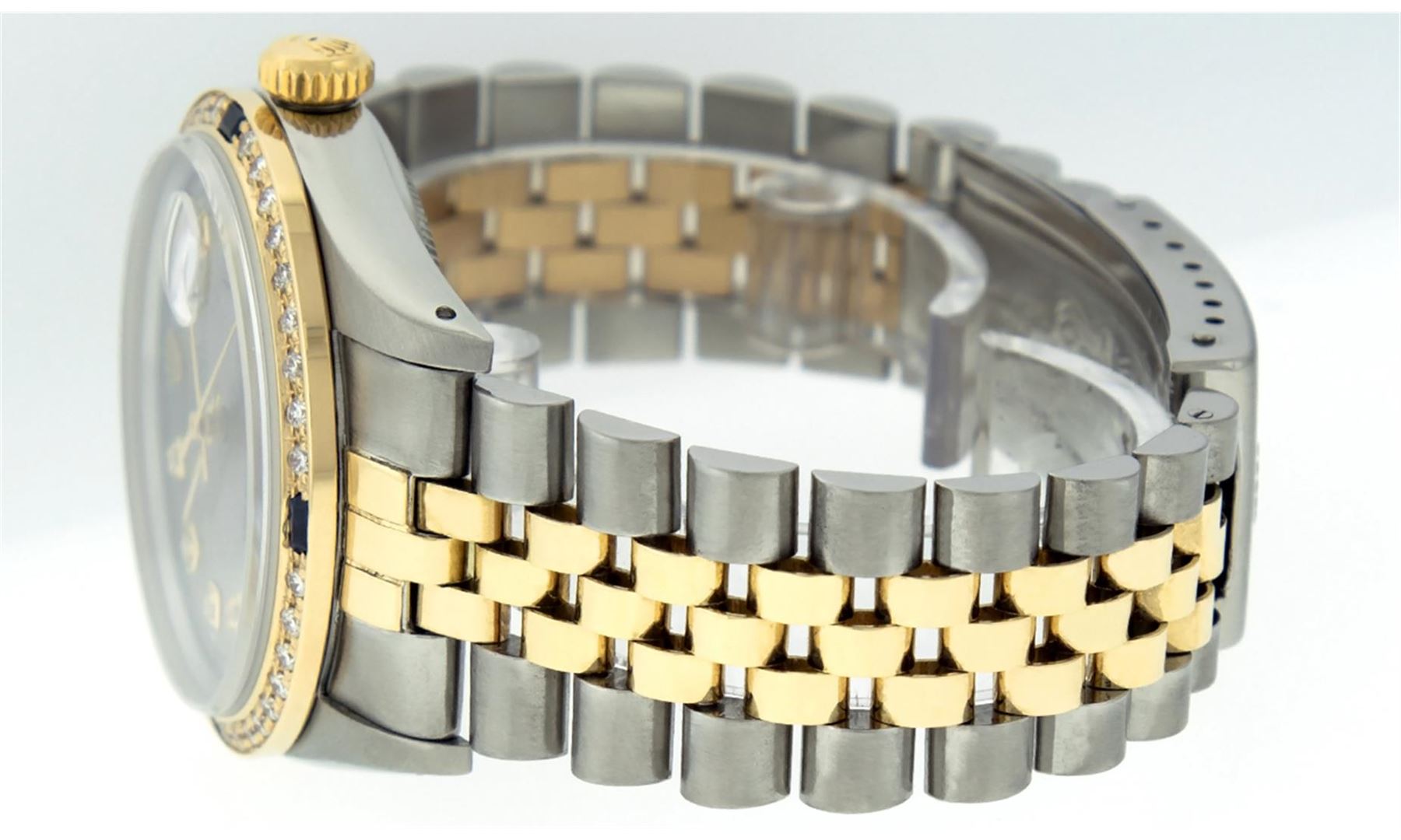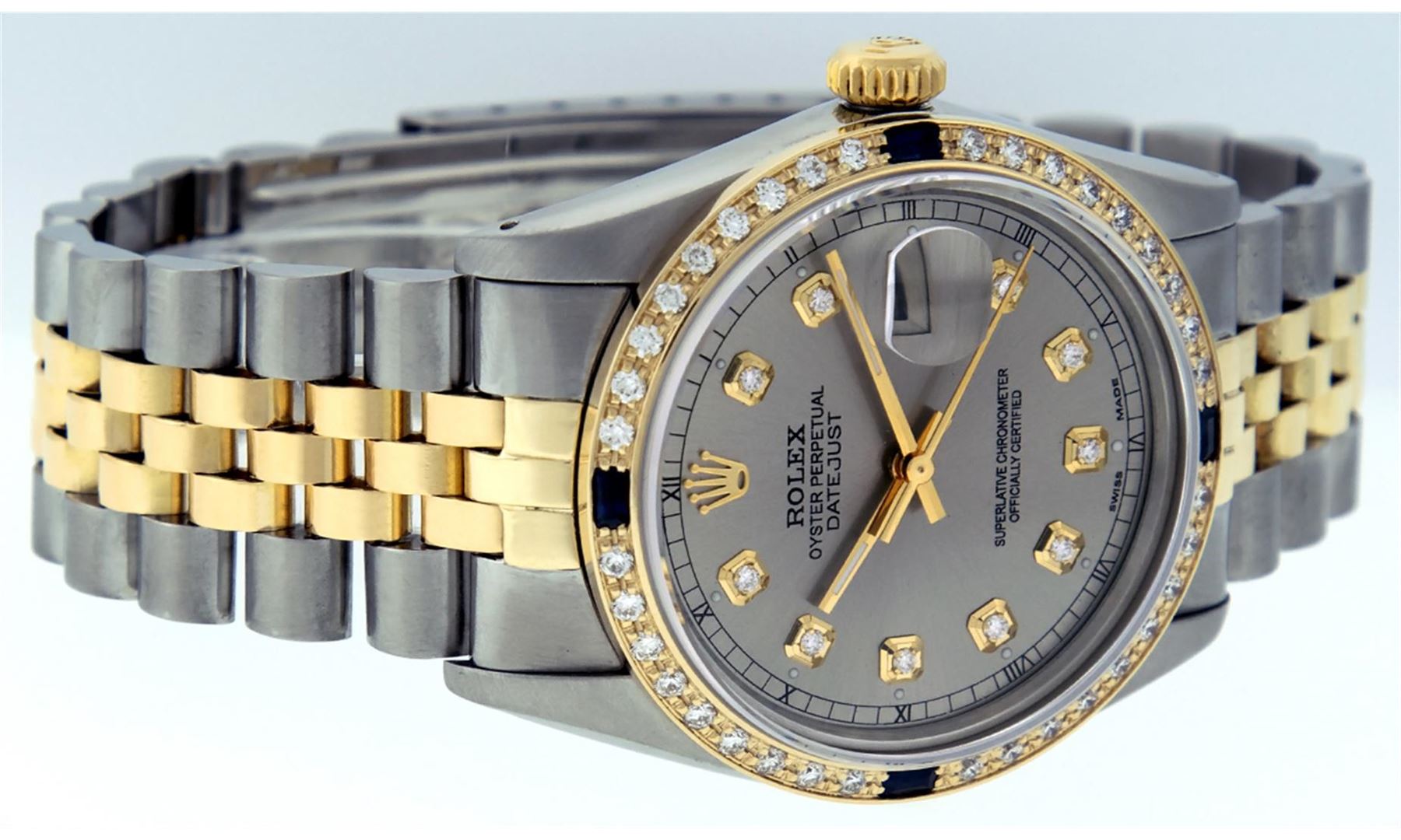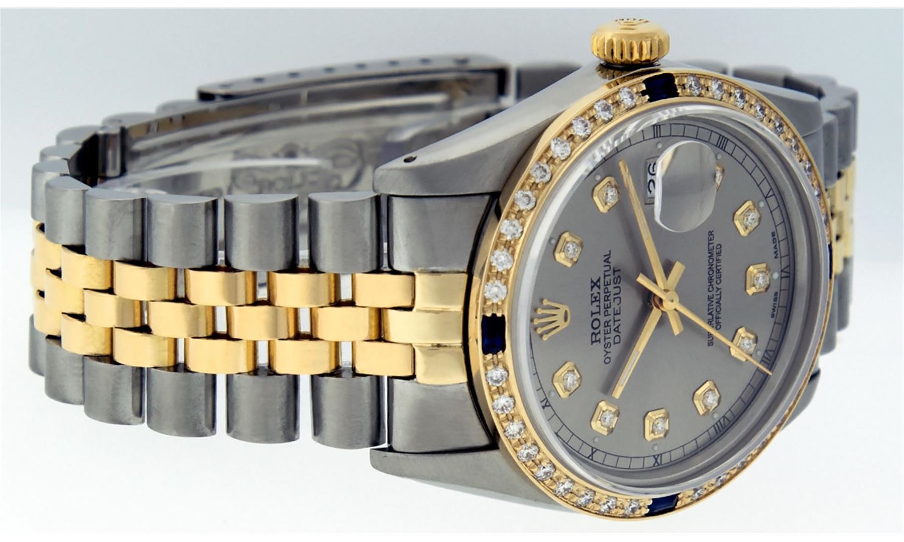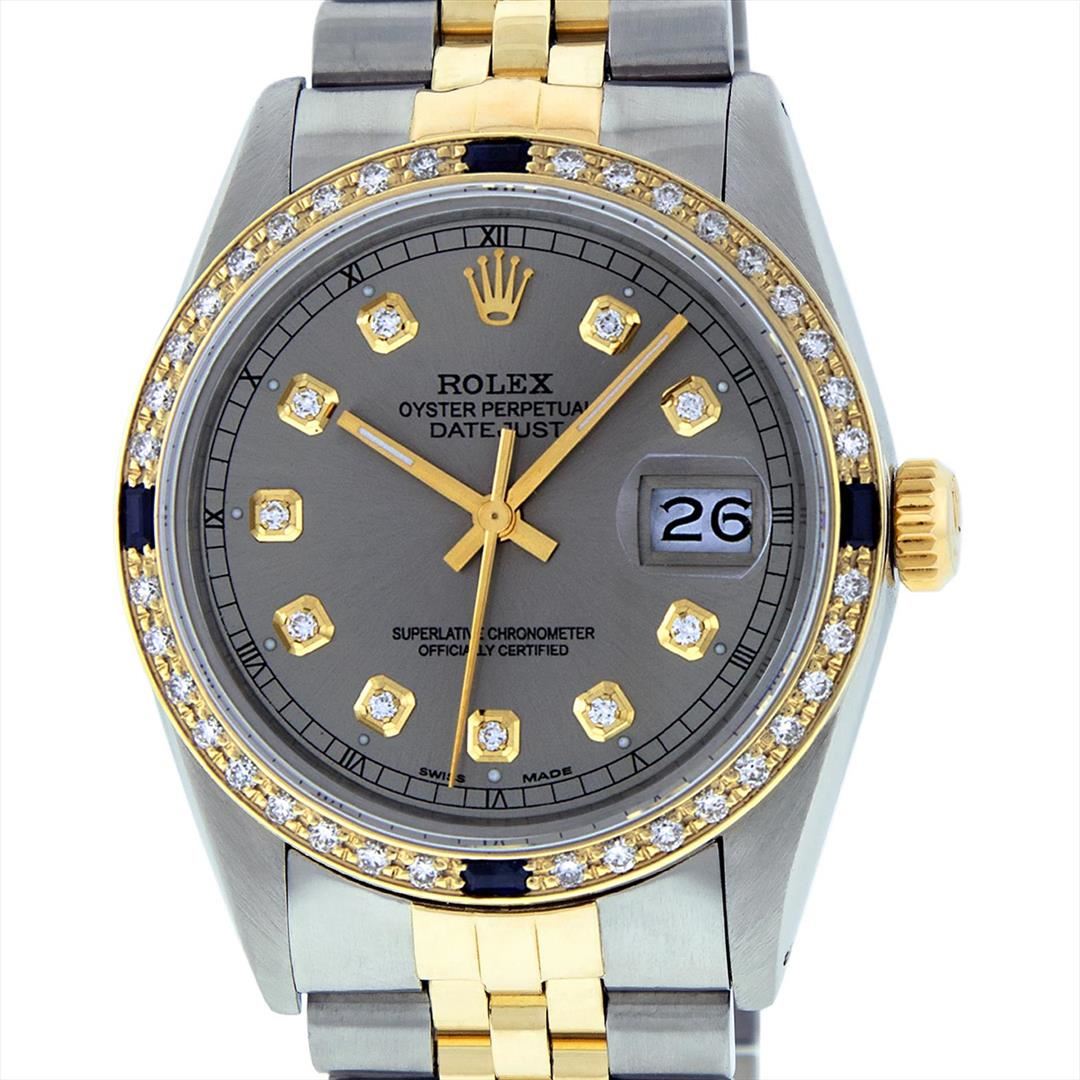 One Gents Two Tone Rolex Datejust Polished, Fully Serviced & Electronically Tested, 14K Yellow Gold & Stainless Steel Case:36mm, 14K Yellow Gold Crown, Custom Bezel: 18K Yellow Gold Sapphire Beadset Diamond Bezel, Diamond Count: 36 Diamonds + 4 Sapphires, Total Weight 1.0 Carat, Clarity: Si-VS, Color: G to H. Custom Crystal: Synthetic Sapphire Cyclops Lens. Movement: Automatic Winding Movement Caliber 3035. Custom Dial: Slate Grey Diamond Dial With Square Track and Luminescent Dots. Diamond Count: 10 Diamonds In Dial, Color: G to H, Clarity: SI-VS. Date Window: 3 O'Clock Position Date Display, Quickset, Model: Datejust Condition: G-6 Extra Fine. Bracelet: Two Tone 14K Yellow Gold & Stainless Steel Jubilee. Bright Polish. 6.5 Inch Length, Adjustable. Standard Clasp, With Rolex Logo.