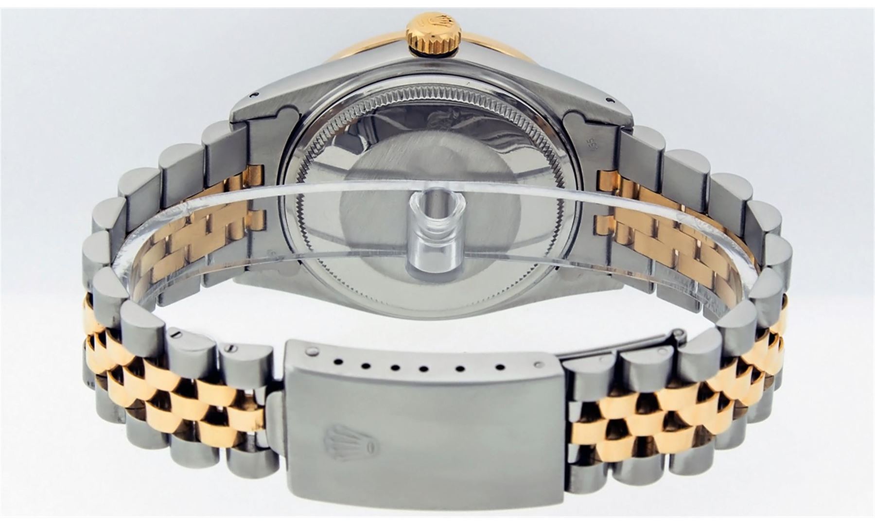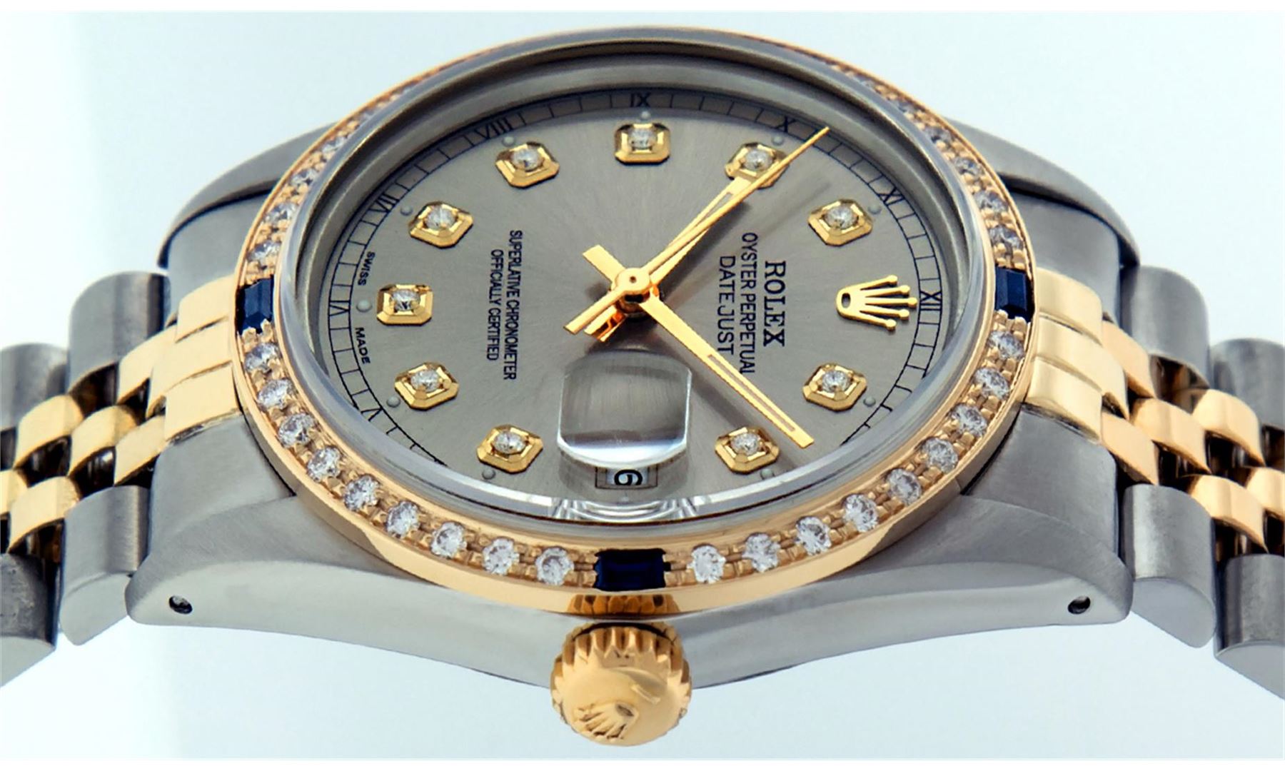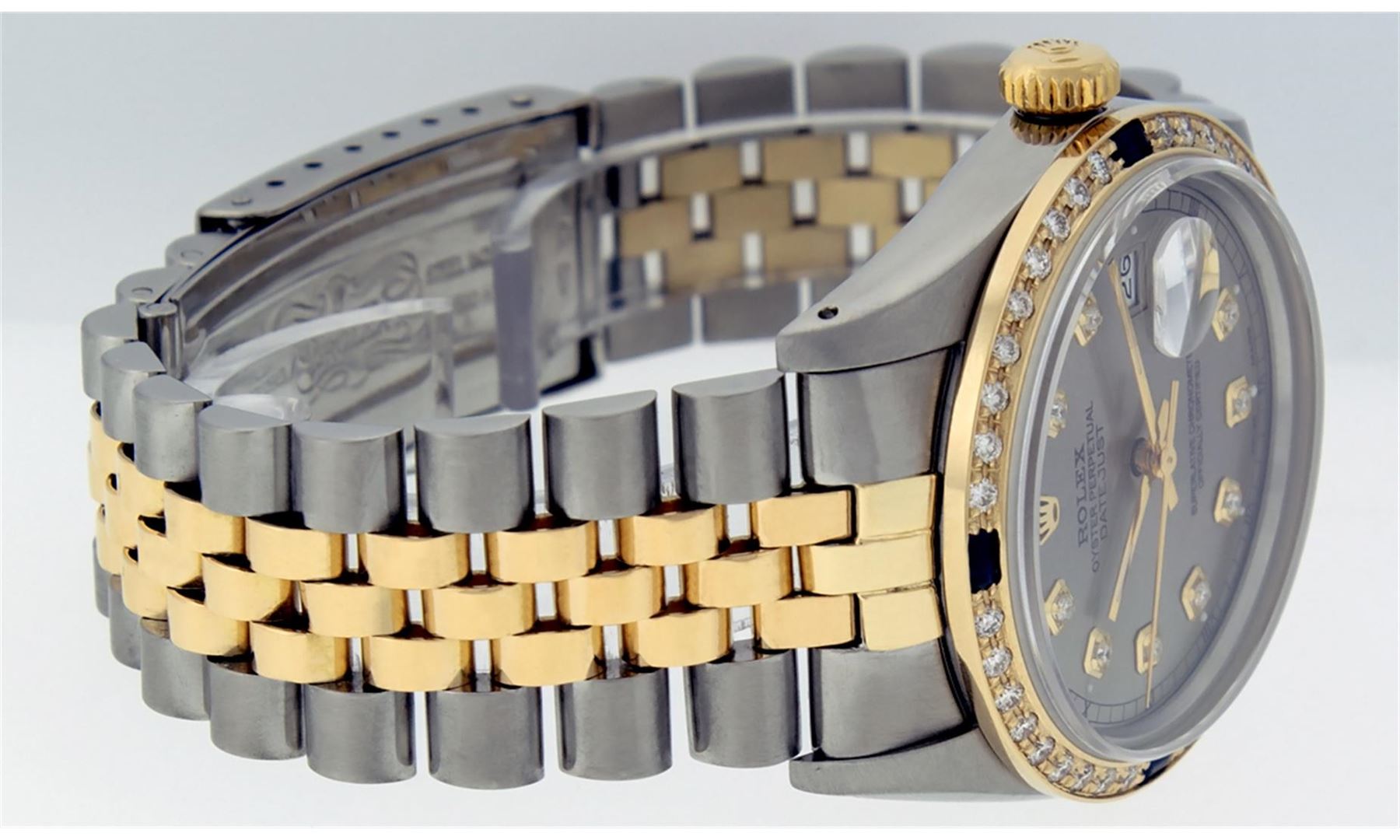 One Gents Two Tone Rolex Datejust Polished, Fully Serviced & Electronically Tested, 14K Yellow Gold & Stainless Steel Case:36mm, 14K Yellow Gold Crown, Custom Bezel: 18K Yellow Gold Sapphire Beadset Diamond Bezel, Diamond Count: 36 Diamonds + 4 Sapphires, Total Weight 1.0 Carat, Clarity: Si-VS, Color: G to H. Custom Crystal: Synthetic Sapphire Cyclops Lens. Movement: Automatic Winding Movement Caliber 3035. Custom Dial: Slate Grey Diamond Dial With Square Track and Luminescent Dots. Diamond Count: 10 Diamonds In Dial, Color: G to H, Clarity: SI-VS. Date Window: 3 O'Clock Position Date Display, Quickset, Model: Datejust Condition: G-6 Extra Fine. Bracelet: Two Tone 14K Yellow Gold & Stainless Steel Jubilee. Bright Polish. 6.5 Inch Length, Adjustable. Standard Clasp, With Rolex Logo.