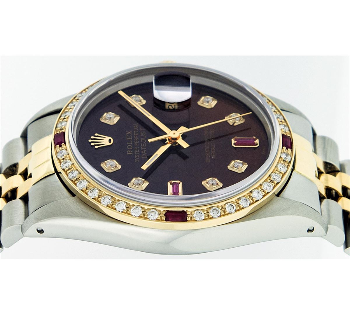 One Mens Two Tone Rolex Datejust Polished, Serviced & Electronically Tested, 14K Yellow Gold & Stainless Steel Case:36mm, 14K Yellow Gold Crown, Custom Bezel: 18K Yellow Gold Ruby Beadset Diamond Bezel, Diamond + Gem Count: 38 Diamonds + 4 Rubies Total Weight 1.00 Carat, Clarity: Si-VS, Color: G to H. Custom Crystal: Synthetic Sapphire Cyclops Lens. Movement: Automatic Winding Movement Caliber 3035. Custom Dial: Brown Diamond Dial + 2 Ruby Baguettes, Diamond Count: 8 Baguettes + 2 Ruby Baguettes in Dial, Dial Weight: .20 Carat G To H In Color, Clarity: SI-VS Date Window: 3 O'Clock Position Date Display, Quickset, Model: 16013 Condition: G-6 Extra Fine. Bracelet:Two Tone 14K Yellow Gold & Stainless Steel Jubilee. Bright Polish. 7.0 Inch Length, Adjustable. Standard Clasp, With Rolex Logo.