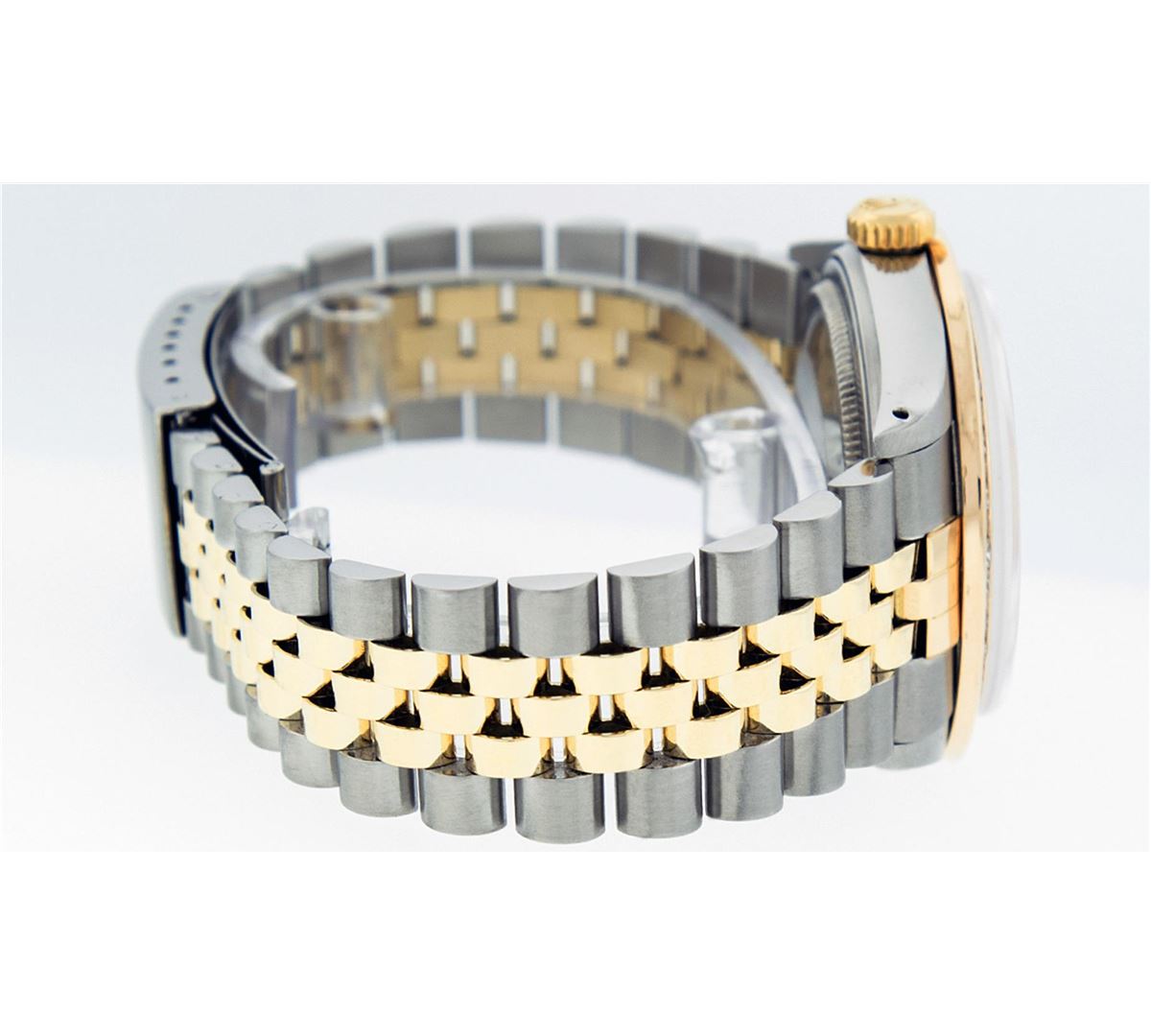 One Mens Two Tone Rolex Datejust Polished Bright with Satin Finish, Serviced & Electronically Tested, 14K Yellow Gold And Stainless Steel Case:36mm, 14K Yellow Gold Crown, Custom Bezel: 14K Yellow Gold Princess Cut Diamond Bezel, Diamond Count: 53 Diamonds, Total Weight 2.75 Carat, Clarity: SI-VS, Color: G to H. Custom Crystal: Synthetic Sapphire Cyclops Lens. Movement: Automatic Winding Movement Caliber 3035. Custom Dial: Mother Of Pearl 8 + 2 Diamond Dial, Diamond Count: 8 Diamonds in Dial + 2 Baguettes, Diamond Color: G To H In Color, Clarity: VS2-SI1. Date Window: 3 O'Clock Position Date Display, Quickset, Model: 16013 Condition: G-6 Extra Fine. Bracelet: 14K Yellow Gold And Stainless Steel Jubilee. Bright Polish & Satin Finish. 7.0 Inch Length, Adjustable. Standard Clasp, With Rolex Logo.