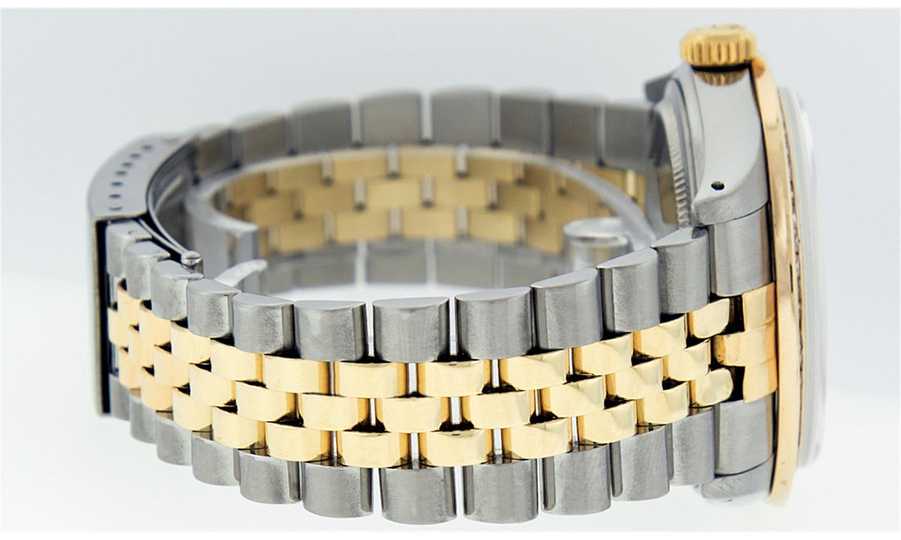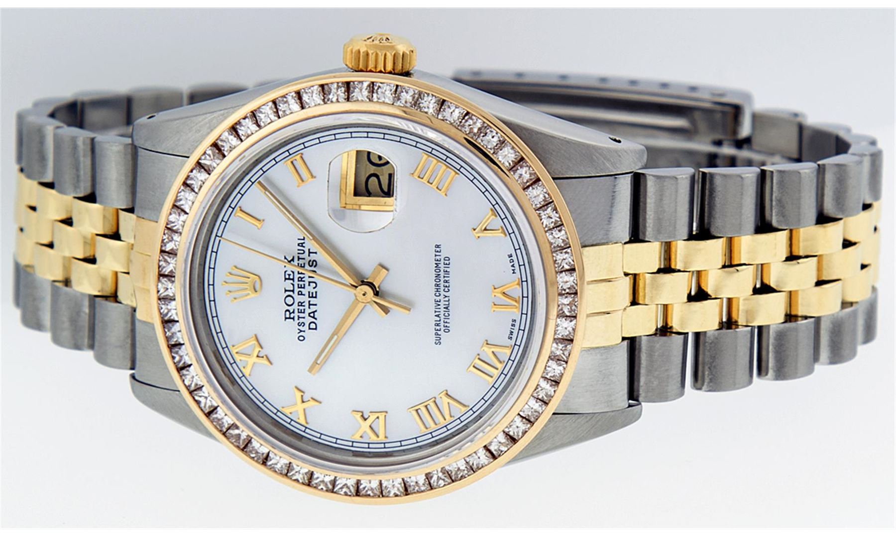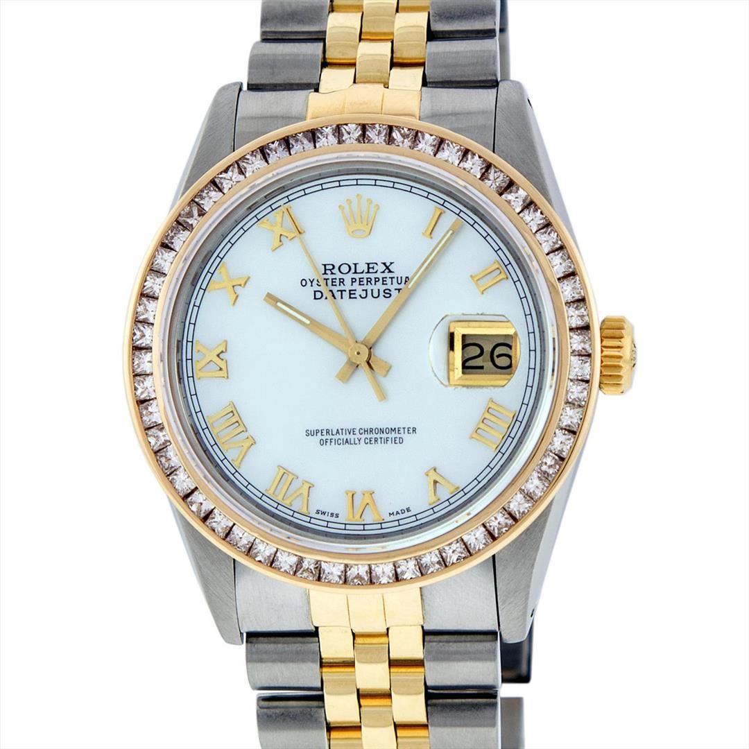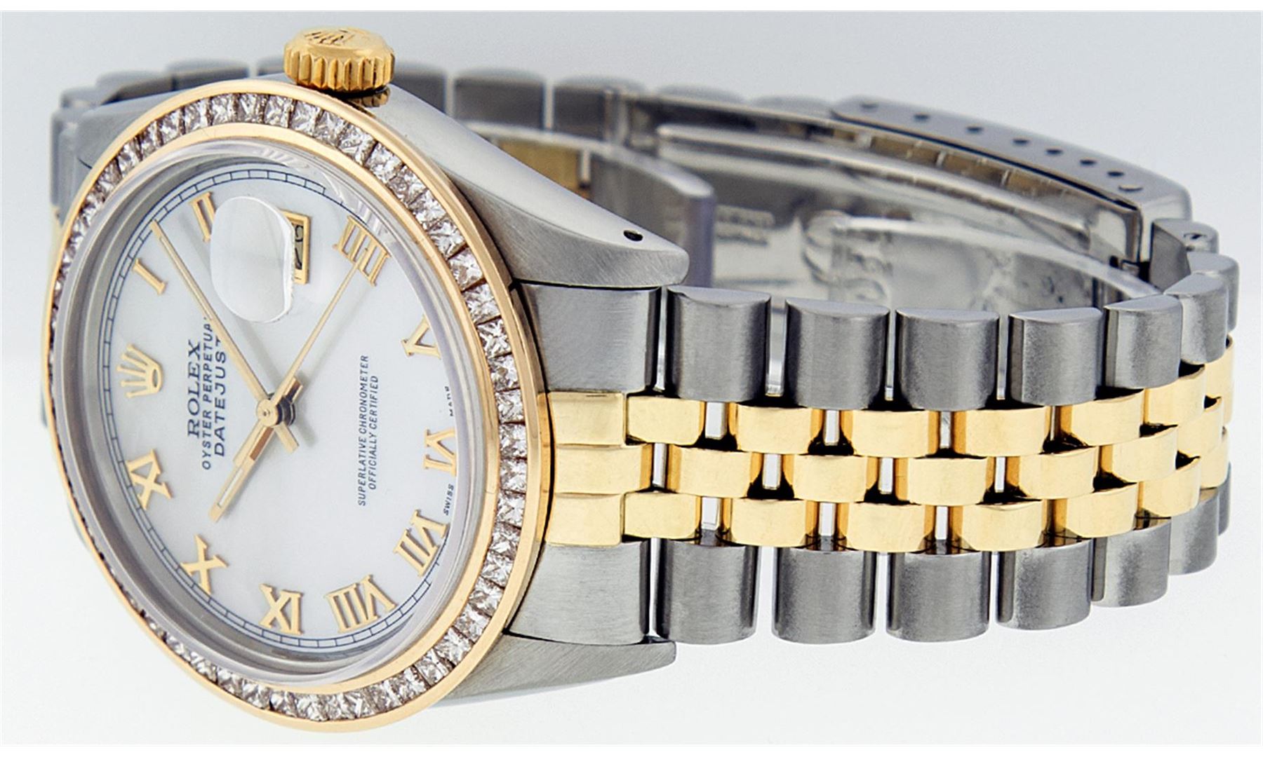 One Mens Two Tone Rolex Datejust Polished Bright with Satin Finish, Serviced & Electronically Tested, 14K Yellow Gold And Stainless Steel Case:36mm, 14K Yellow Gold Crown, Custom Bezel: 14K Yellow Gold Princess Cut Diamond Bezel, Diamond Count: 53 Diamonds, Total Weight 2.75 Carat, Clarity: SI-VS, Color: G to H. Custom Crystal: Synthetic Sapphire Cyclops Lens. Movement: Automatic Winding Movement Caliber 3035. Custom Dial: Mother Of Pearl Roman Dial. Date Window: 3 O'Clock Position Date Display, Quickset, Model: 16013 Condition: G-6 Extra Fine. Bracelet: 14K Yellow Gold And Stainless Steel Jubilee. Bright Polish & Satin Finish. 7.0 Inch Length, Adjustable. Standard Clasp, With Rolex Logo.