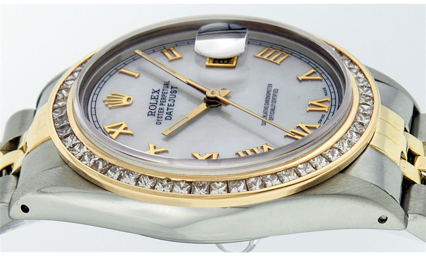 One Mens Two Tone Rolex Datejust Polished Bright with Satin Finish, Serviced & Electronically Tested, 14K Yellow Gold And Stainless Steel Case:36mm, 14K Yellow Gold Crown, Custom Bezel: 14K Yellow Gold Princess Cut Diamond Bezel, Diamond Count: 53 Diamonds, Total Weight 2.75 Carat, Clarity: SI-VS, Color: G to H. Custom Crystal: Synthetic Sapphire Cyclops Lens. Movement: Automatic Winding Movement Caliber 3035. Custom Dial: Mother Of Pearl Roman Dial. Date Window: 3 O'Clock Position Date Display, Quickset, Model: 16013 Condition: G-6 Extra Fine. Bracelet: 14K Yellow Gold And Stainless Steel Jubilee. Bright Polish & Satin Finish. 7.0 Inch Length, Adjustable. Standard Clasp, With Rolex Logo.