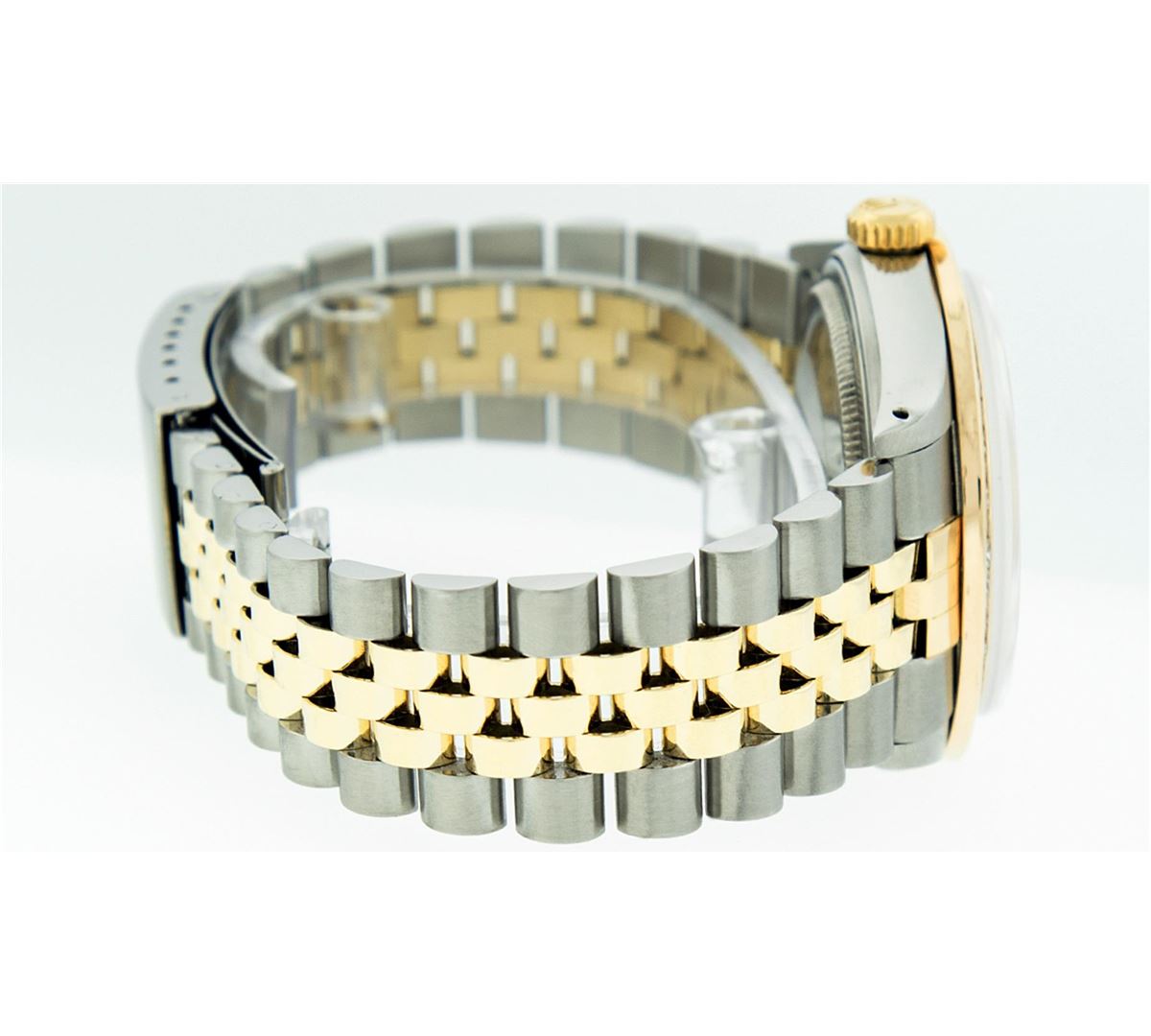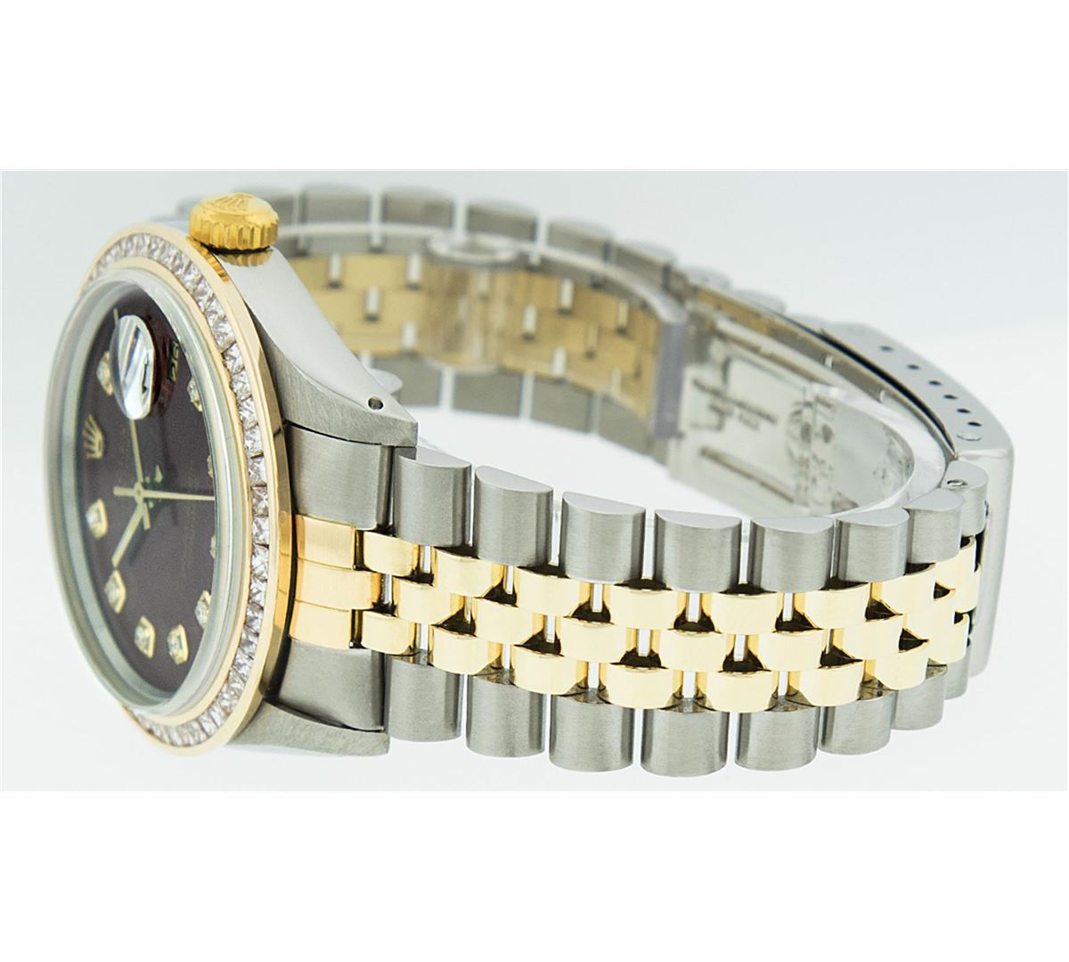 One Mens Rolex Datejust Polished Bright with Satin Finish, Serviced & Electronically Tested, 14K Yellow Gold and Stainless Steel Case:36mm, Stainless Steel Crown, Custom Bezel: 14K Yellow Gold Princess Cut Diamond Bezel, Diamond Count: 53 Diamonds, Total Weight 2.75 Carat, Clarity: SI-VS, Color: G to H. Custom Crystal: Synthetic Sapphire Cyclops Lens. Movement: Automatic Winding Movement Caliber 3035. Custom Dial: Maroon Diamond Single Cut VVS, Diamond Count: 10 Diamond in Dial, Dial Color: G To H In Color, Clarity: VVS. Date Window: 3 O'Clock Position Date Display, Quickset, Model: 16013 Condition: G-6 Extra Fine. Bracelet: 14K Yellow Gold and Stainless Steel Jubilee. Bright Polish & Satin Finish. 7.0 Inch Length, Adjustable. Standard Clasp, With Rolex Logo.