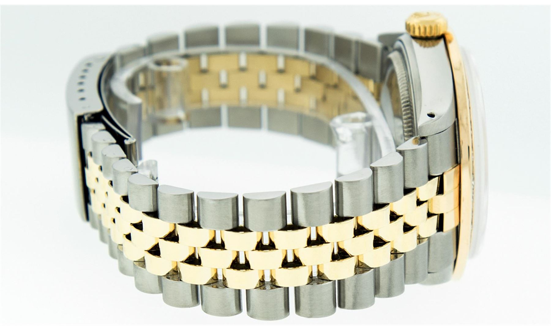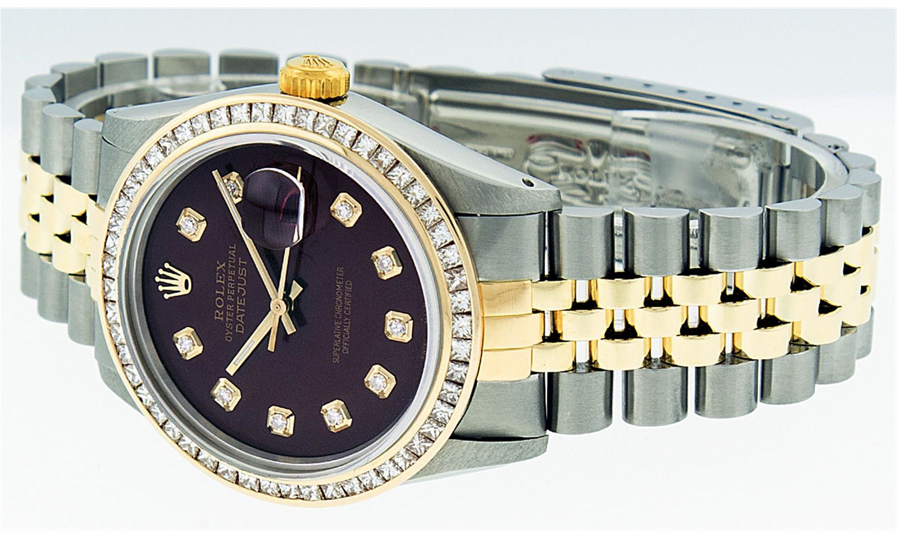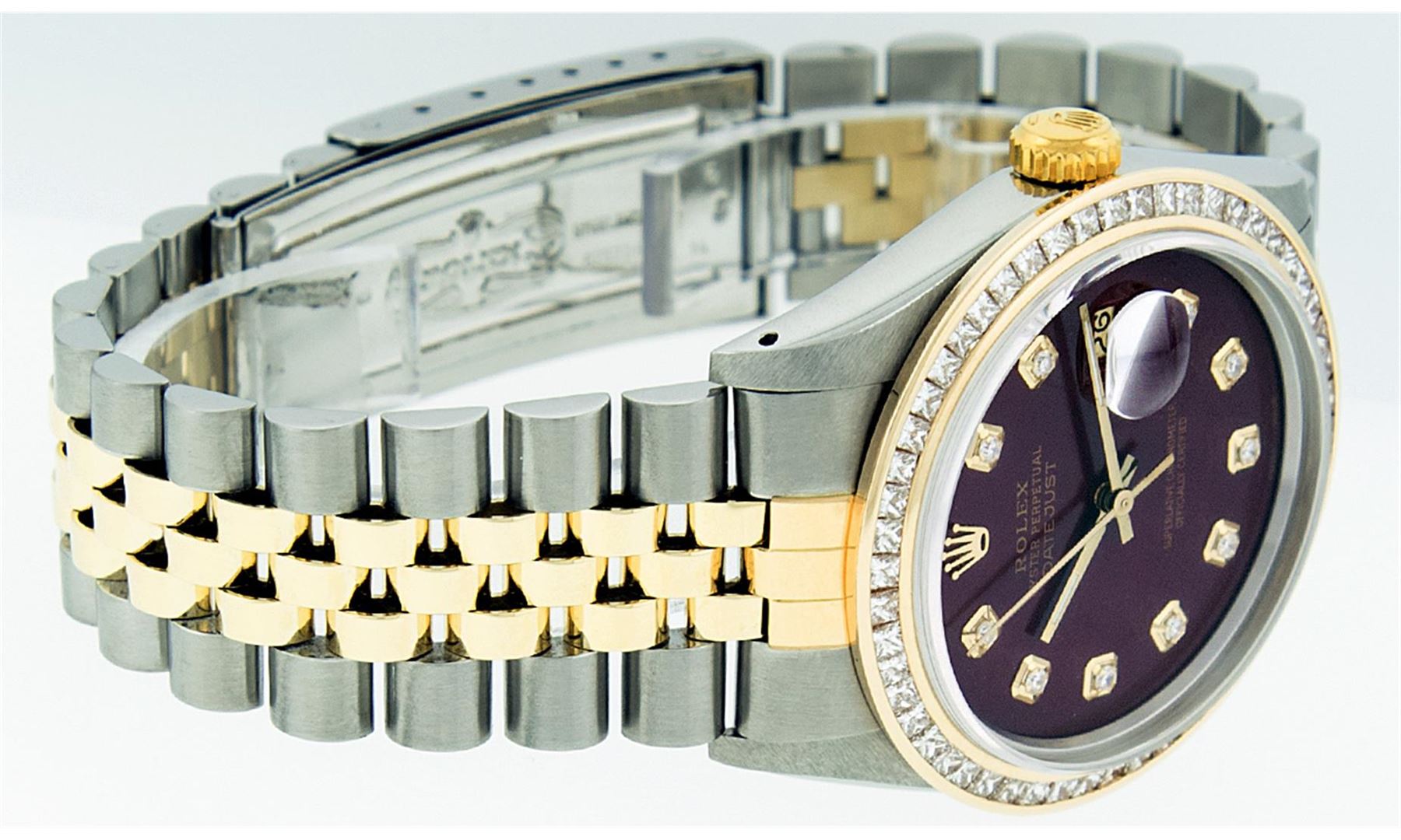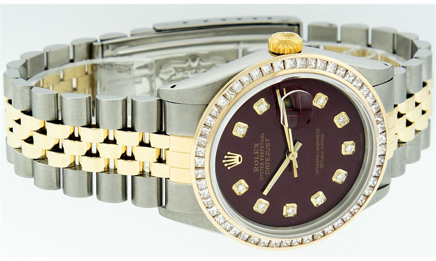 One Mens Rolex Datejust Polished Bright with Satin Finish, Serviced & Electronically Tested, 14K Yellow Gold and Stainless Steel Case:36mm, Stainless Steel Crown, Custom Bezel: 14K Yellow Gold Princess Cut Diamond Bezel, Diamond Count: 53 Diamonds, Total Weight 2.75 Carat, Clarity: SI-VS, Color: G to H. Custom Crystal: Synthetic Sapphire Cyclops Lens. Movement: Automatic Winding Movement Caliber 3035. Custom Dial: Maroon Diamond Single Cut VVS, Diamond Count: 10 Diamond in Dial, Dial Color: G To H In Color, Clarity: VVS. Date Window: 3 O'Clock Position Date Display, Quickset, Model: 16013 Condition: G-6 Extra Fine. Bracelet: 14K Yellow Gold and Stainless Steel Jubilee. Bright Polish & Satin Finish. 7.0 Inch Length, Adjustable. Standard Clasp, With Rolex Logo.
