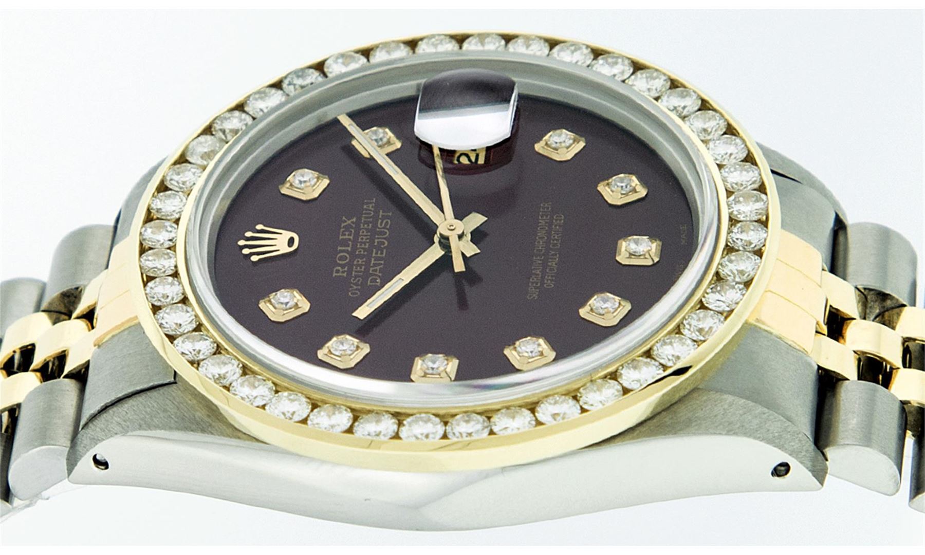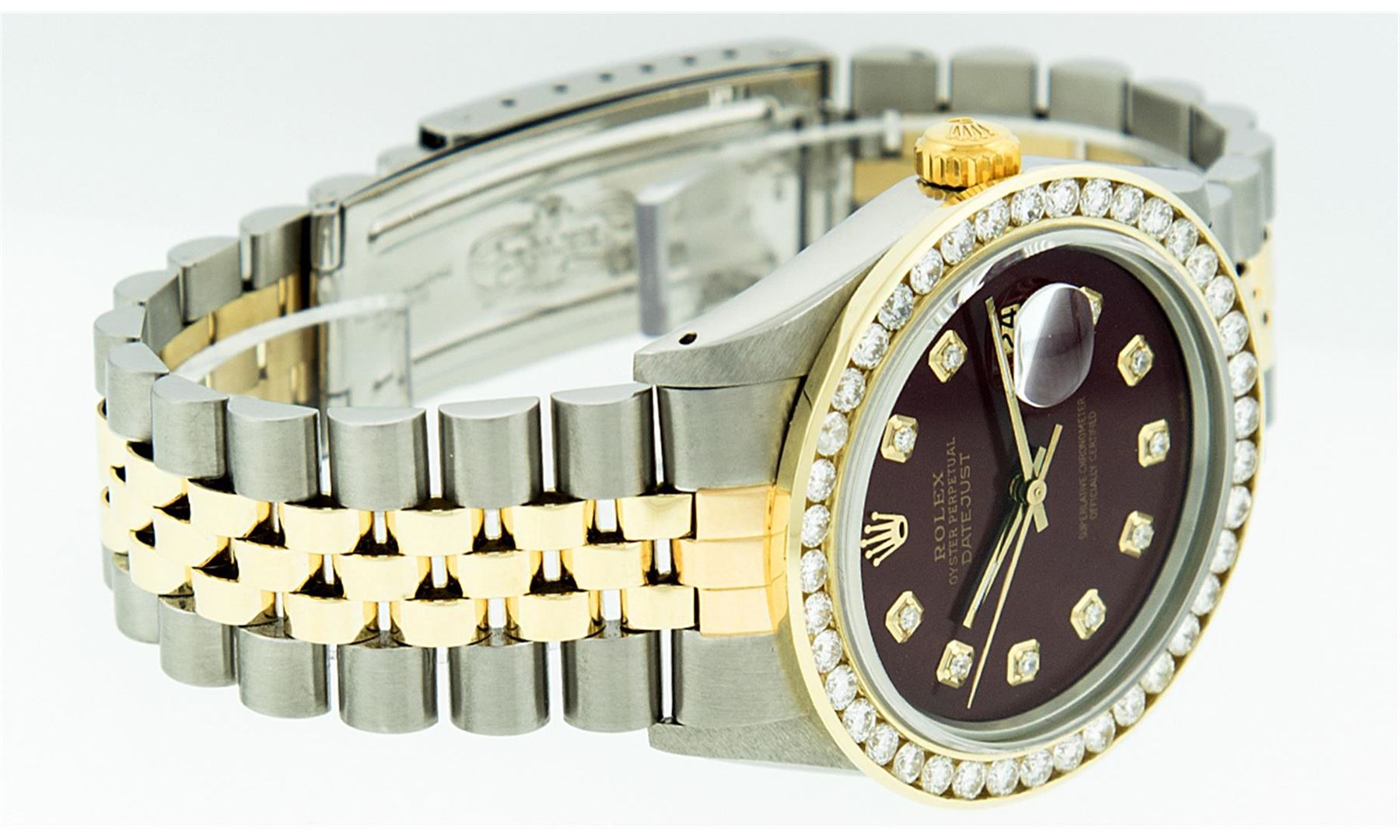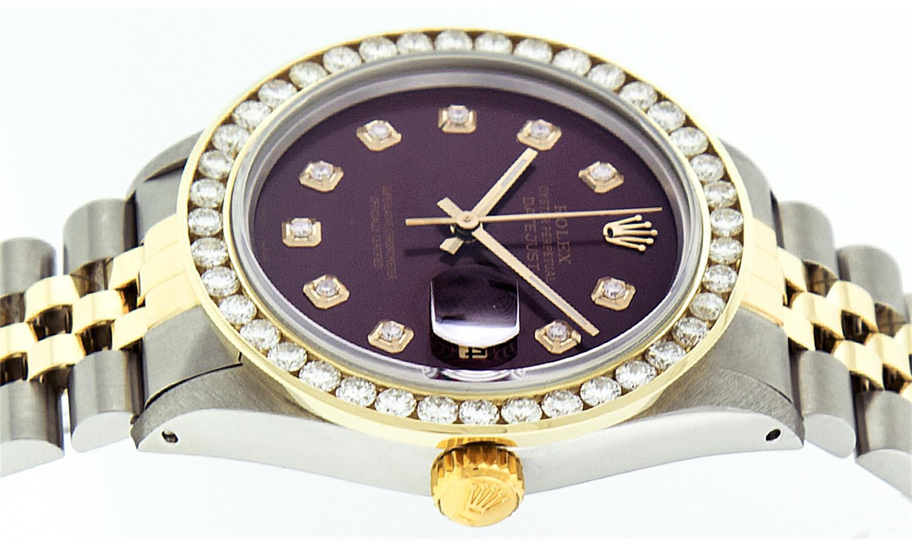 One Mens Rolex Datejust Polished Bright with Satin Finish, Serviced & Electronically Tested, 14K Yellow Gold and Stainless Steel Case:36mm, Stainless Steel Crown, Custom Bezel: 18K Yellow Gold Channel Set Diamond Bezel, Diamond Count: 40 Diamonds, Total Weight 3.00 Carat, Clarity: SI-VS, Color: G to H. Custom Crystal: Synthetic Sapphire Cyclops Lens. Movement: Automatic Winding Movement Caliber 3035. Custom Dial: Maroon Diamond Single Cut VVS, Diamond Count: 10 Diamond in Dial, Dial Color: G To H In Color, Clarity: VVS. Date Window: 3 O'Clock Position Date Display, Quickset, Model: 16013 Condition: G-6 Extra Fine. Bracelet: 14K Yellow Gold and Stainless Steel Jubilee. Bright Polish & Satin Finish. 7.0 Inch Length, Adjustable. Standard Clasp, With Rolex Logo.