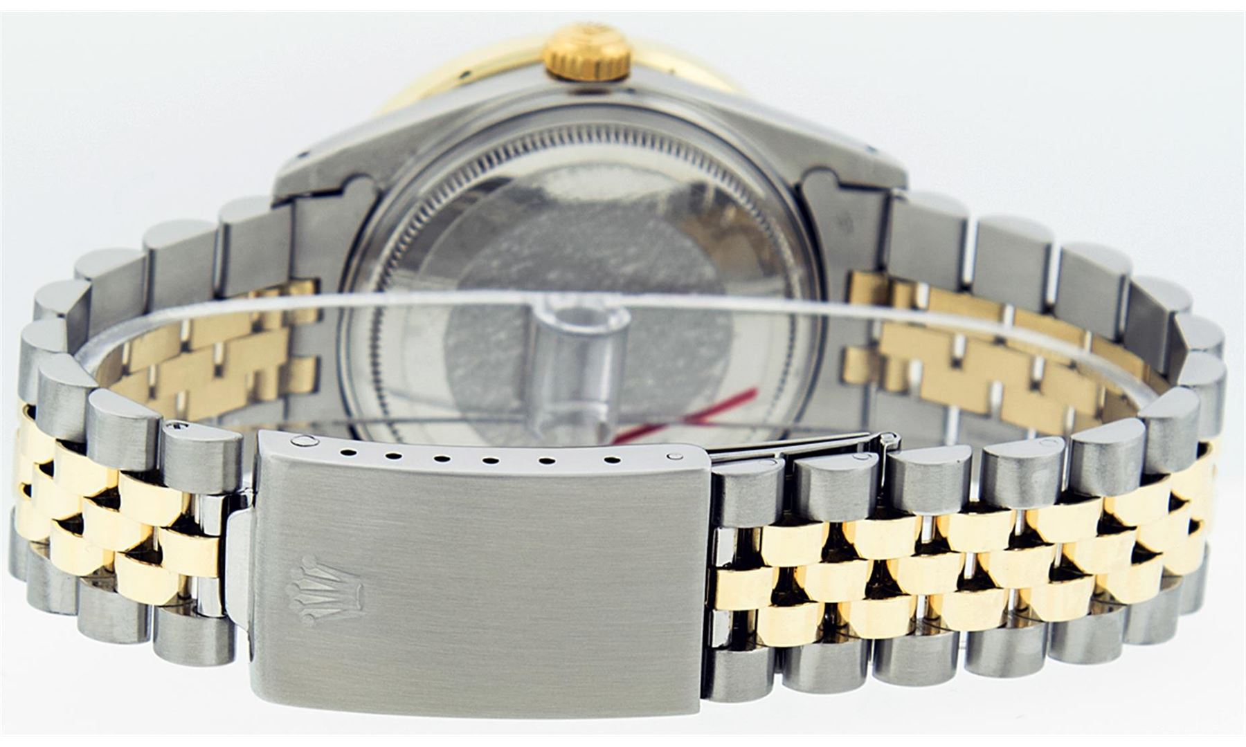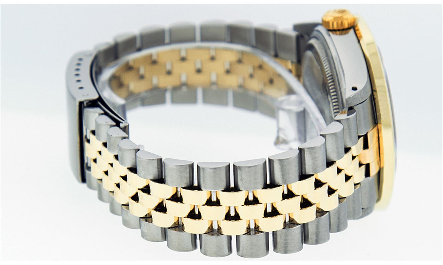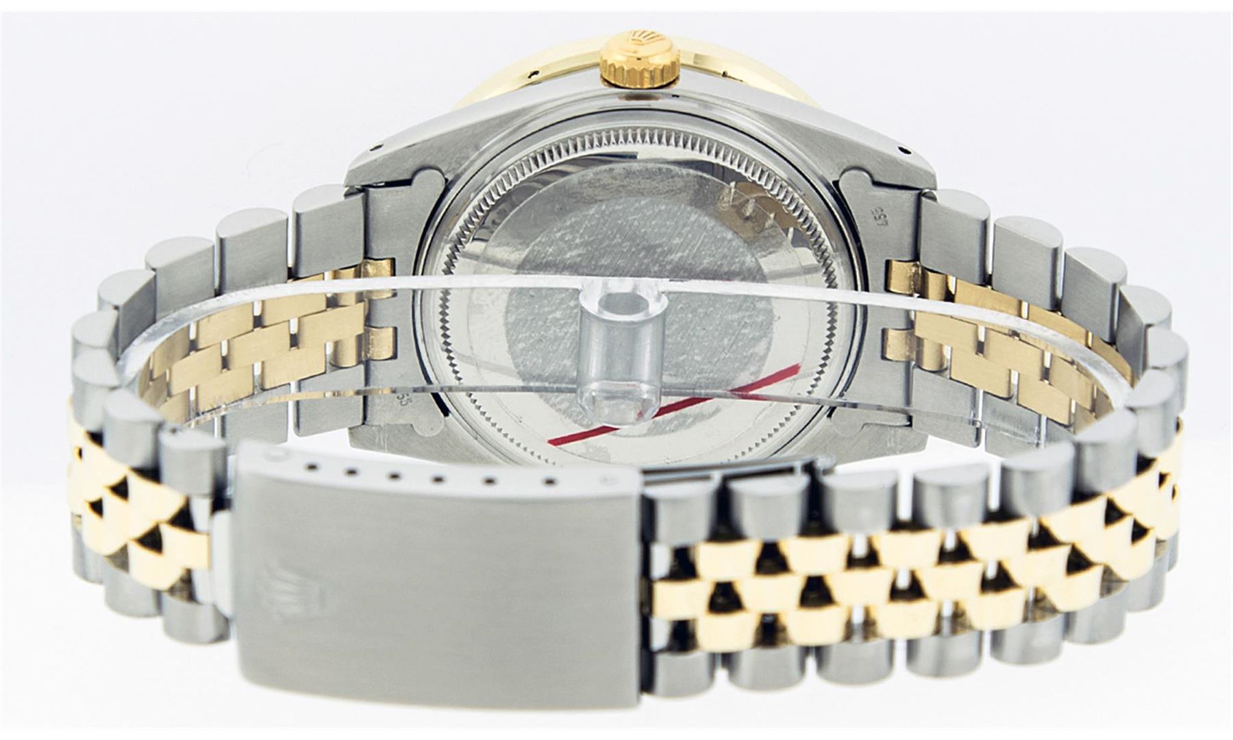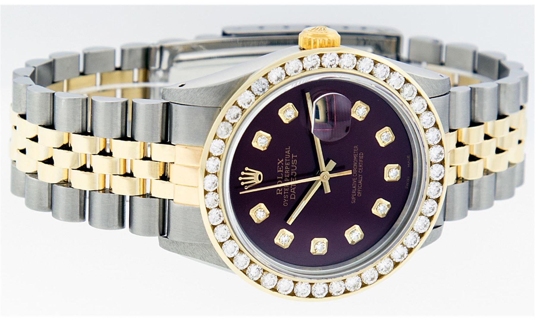 One Mens Rolex Datejust Polished Bright with Satin Finish, Serviced & Electronically Tested, 14K Yellow Gold and Stainless Steel Case:36mm, Stainless Steel Crown, Custom Bezel: 18K Yellow Gold Channel Set Diamond Bezel, Diamond Count: 40 Diamonds, Total Weight 3.00 Carat, Clarity: SI-VS, Color: G to H. Custom Crystal: Synthetic Sapphire Cyclops Lens. Movement: Automatic Winding Movement Caliber 3035. Custom Dial: Maroon Diamond Single Cut VVS, Diamond Count: 10 Diamond in Dial, Dial Color: G To H In Color, Clarity: VVS. Date Window: 3 O'Clock Position Date Display, Quickset, Model: 16013 Condition: G-6 Extra Fine. Bracelet: 14K Yellow Gold and Stainless Steel Jubilee. Bright Polish & Satin Finish. 7.0 Inch Length, Adjustable. Standard Clasp, With Rolex Logo.