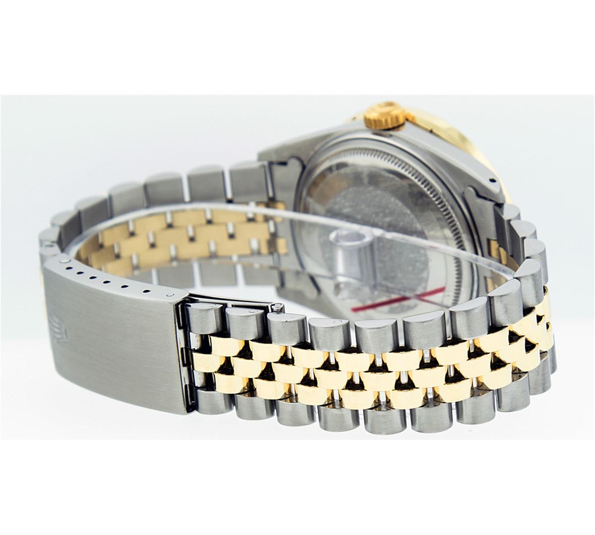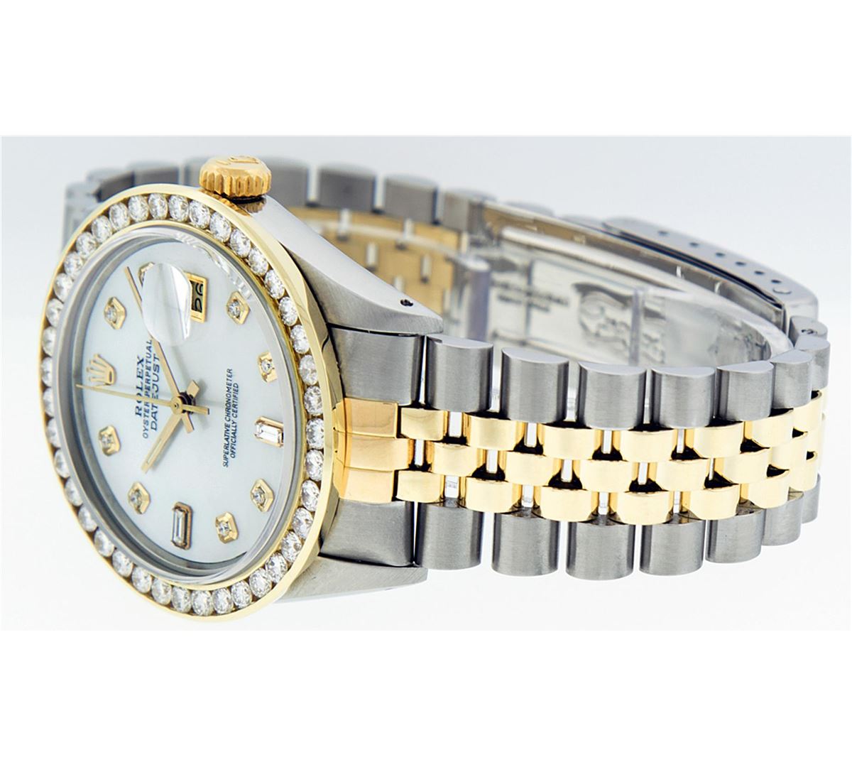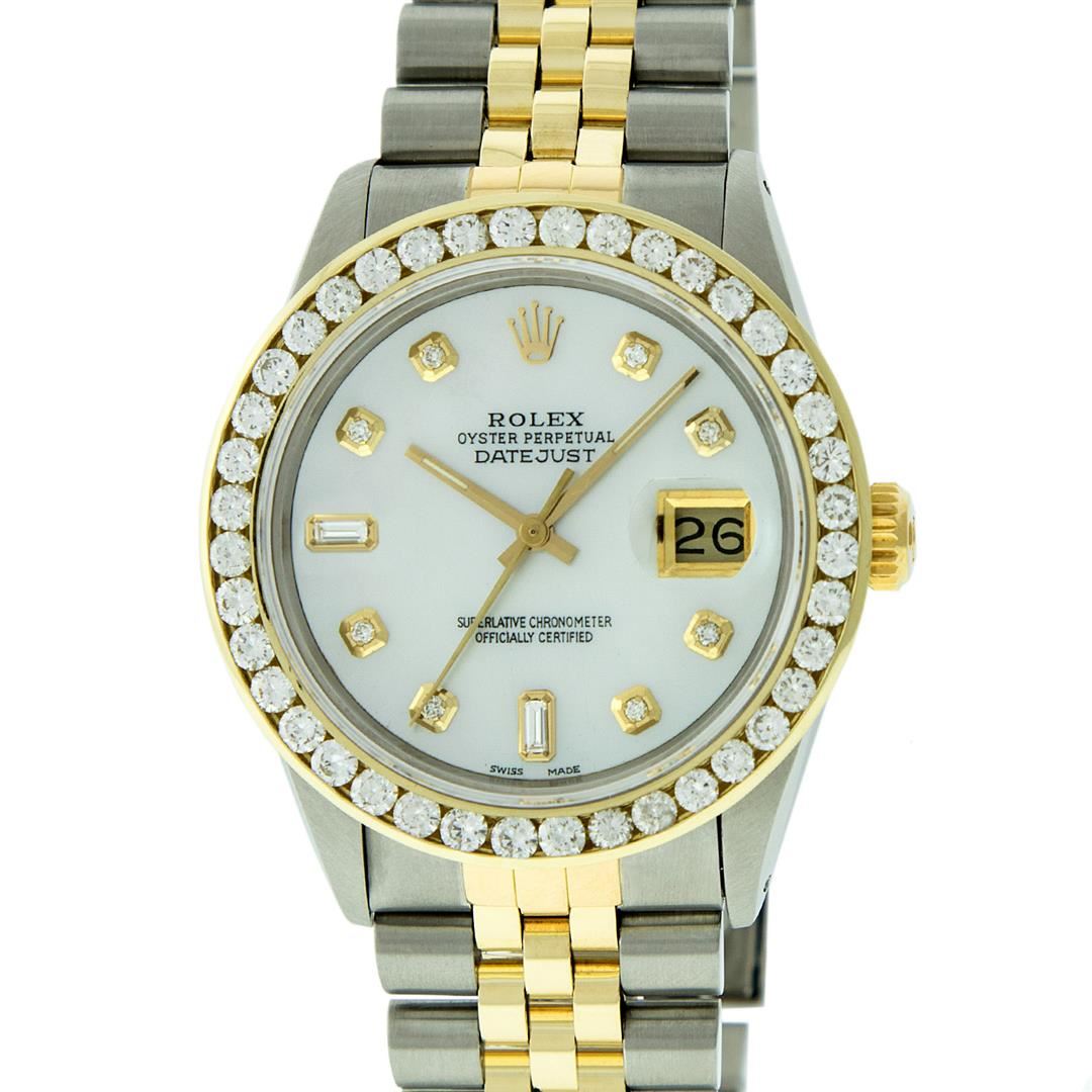 One Mens Rolex Datejust Polished Bright with Satin Finish, Serviced & Electronically Tested, 14K Yellow Gold and Stainless Steel Case:36mm, Stainless Steel Crown, Custom Bezel: 18K Yellow Gold Channel Set Diamond Bezel, Diamond Count: 40 Diamonds, Total Weight 3.00 Carat, Clarity: SI-VS, Color: G to H. Custom Crystal: Synthetic Sapphire Cyclops Lens. Movement: Automatic Winding Movement Caliber 3035. Custom Dial: Mother Of Pearl Diamond, Diamond Count: 8 Diamond + 2 Baguettes in Dial, Dial Color: G To H In Color, Clarity: SI-VS. Date Window: 3 O'Clock Position Date Display, Quickset, Model: 16013 Condition: G-6 Extra Fine. Bracelet: 14K Yellow Gold and Stainless Steel Jubilee. Bright Polish & Satin Finish. 7.0 Inch Length, Adjustable. Standard Clasp, With Rolex Logo.