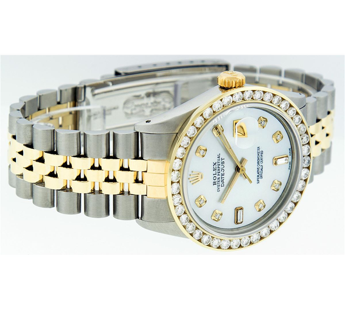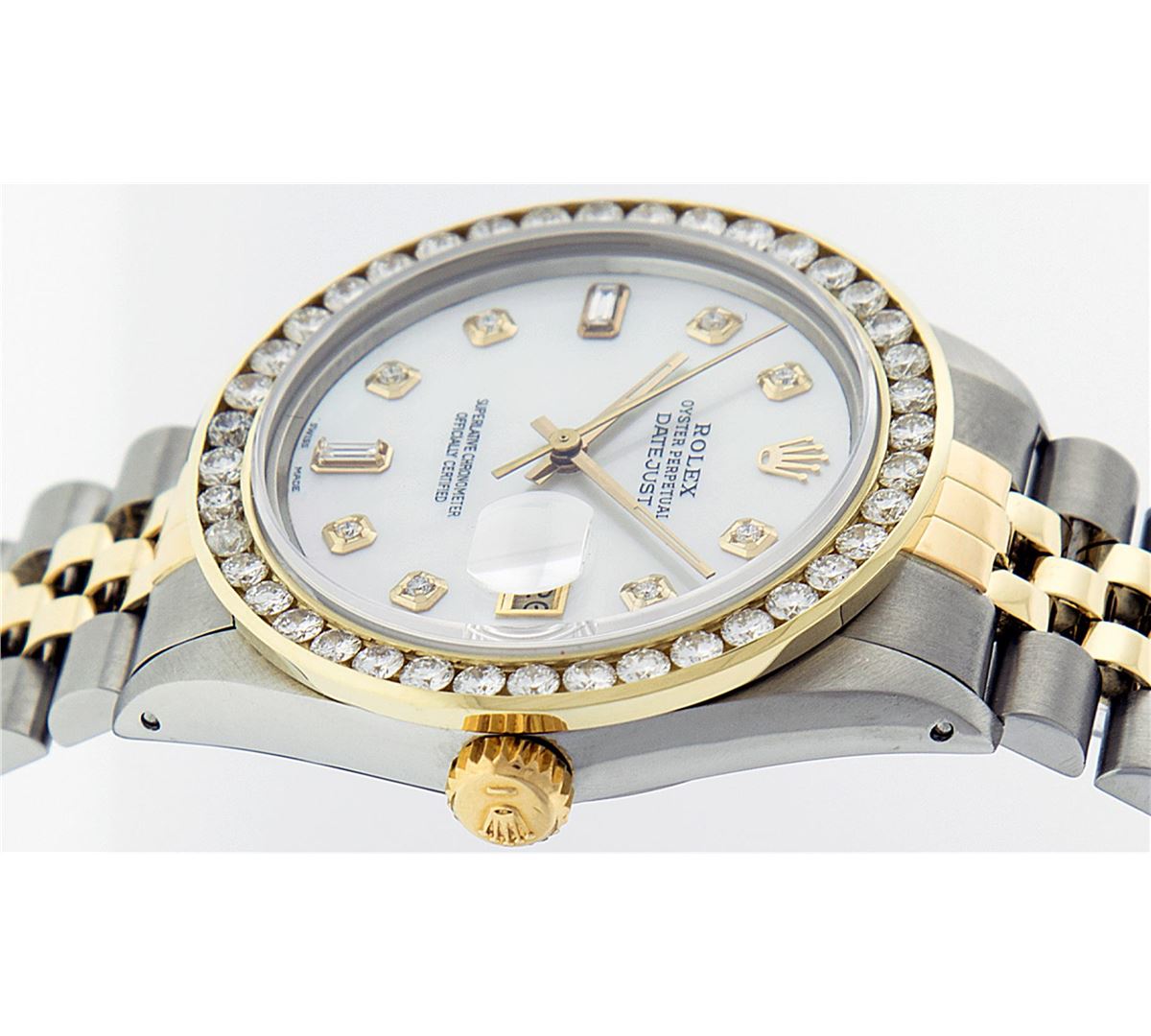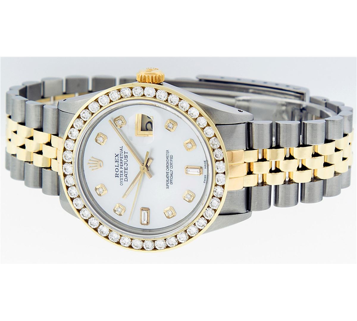 One Mens Rolex Datejust Polished Bright with Satin Finish, Serviced & Electronically Tested, 14K Yellow Gold and Stainless Steel Case:36mm, Stainless Steel Crown, Custom Bezel: 18K Yellow Gold Channel Set Diamond Bezel, Diamond Count: 40 Diamonds, Total Weight 3.00 Carat, Clarity: SI-VS, Color: G to H. Custom Crystal: Synthetic Sapphire Cyclops Lens. Movement: Automatic Winding Movement Caliber 3035. Custom Dial: Mother Of Pearl Diamond, Diamond Count: 8 Diamond + 2 Baguettes in Dial, Dial Color: G To H In Color, Clarity: SI-VS. Date Window: 3 O'Clock Position Date Display, Quickset, Model: 16013 Condition: G-6 Extra Fine. Bracelet: 14K Yellow Gold and Stainless Steel Jubilee. Bright Polish & Satin Finish. 7.0 Inch Length, Adjustable. Standard Clasp, With Rolex Logo.