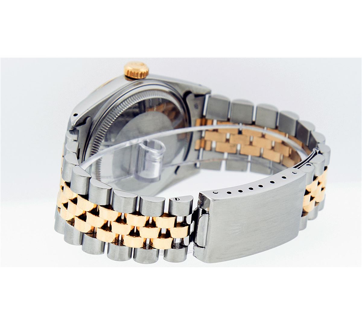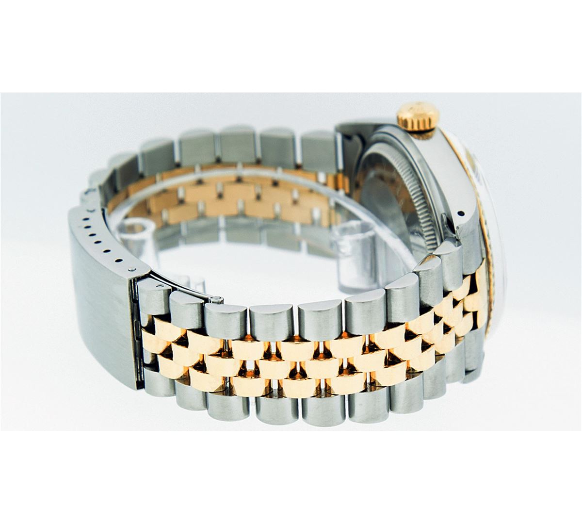 One Mens Two Tone Rolex Datejust Polished, Serviced & Electronically Tested, 14K Yellow Gold & Stainless Steel Case: 36mm,14K Yellow Gold Crown, Bezel: 14K Yellow Gold Fluted Bezel. Custom Crystal: Acrylic Cyclops Lens. Movement: Automatic Winding Movement Caliber 3035. Custom Dial: Champagne Dial With Index Hour Markers and Small Track. Date Window: 3 O'Clock Position Date Display, Quickset, Model: Datejust. Condition: G-6 Extra Fine. Bracelet:Two Tone 14K Yellow Gold & Stainless Steel Jubilee. Bright Polish. 7.0 Inch Length, Adjustable. Standard Clasp, With Rolex Logo.
