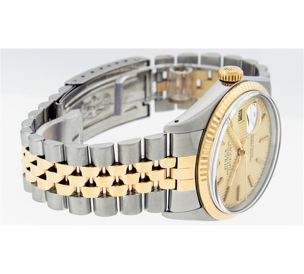 One Mens Two Tone Rolex Datejust Polished, Serviced & Electronically Tested, 14K Yellow Gold & Stainless Steel Case: 36mm, 14K Yellow Gold Crown, Bezel: 14K Yellow Gold Fluted Bezel. Custom Crystal: Acrylic Cyclops Lens. Movement: Automatic Winding Movement Caliber 3035. Custom Dial: Champagne Tapestry Dial With Index Hour Markers and Small Track. Date Window: 3 O'Clock Position Date Display, Quickset, Model: 16013 Condition: G-6 Extra Fine. Bracelet:Two Tone 14K Yellow Gold & Stainless Steel Jubilee. Bright Polish. 7.0 Inch Length, Adjustable. Standard Clasp, With Rolex Logo.