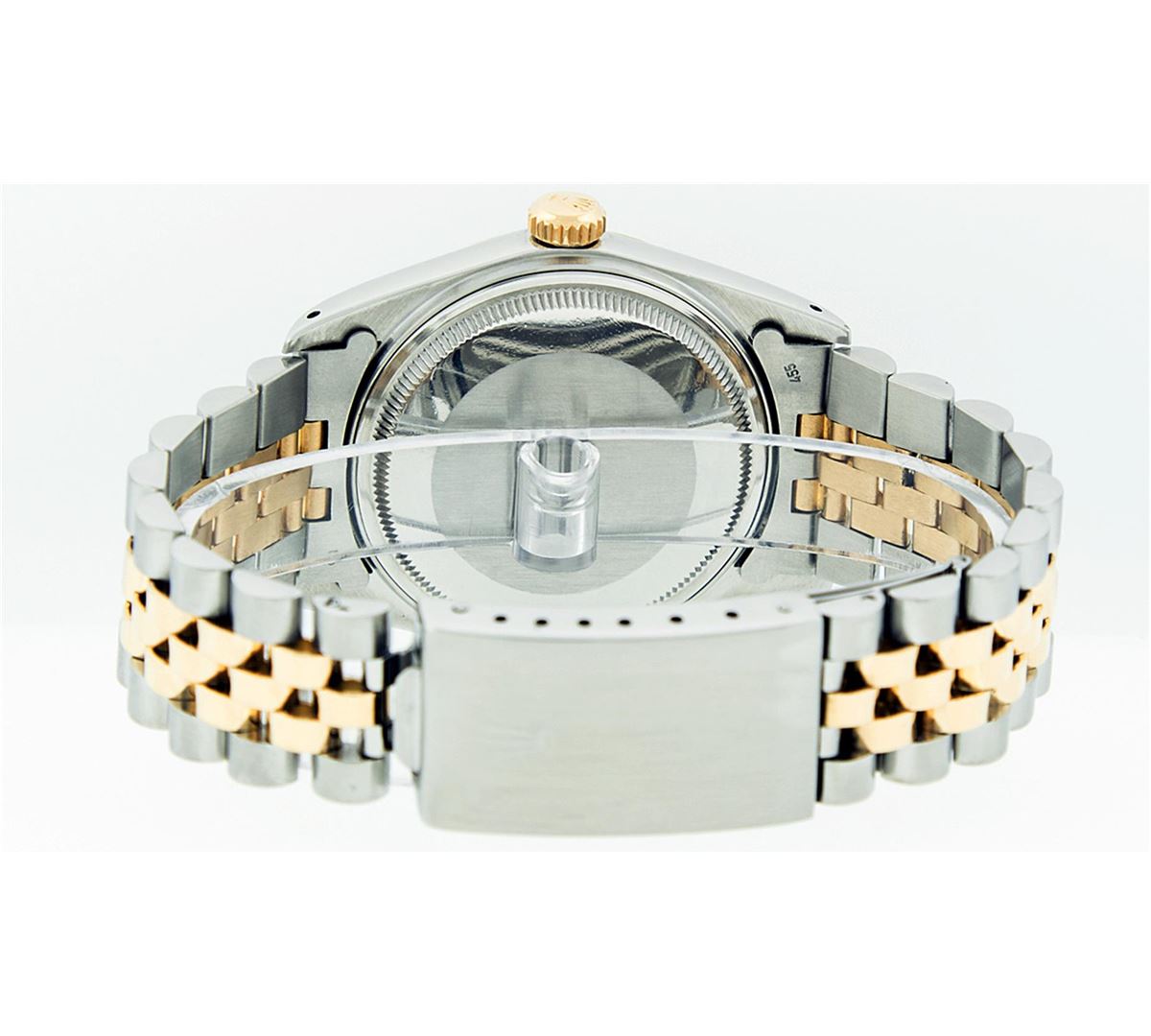 One Mens Two Tone Rolex Datejust Polished, Serviced & Electronically Tested, 14K Yellow Gold & Stainless Steel Case: 36mm,14K Yellow Gold Crown, Bezel: 14K Yellow Gold Fluted Bezel. Custom Crystal: Acrylic Cyclops Lens. Movement: Automatic Winding Movement Caliber 3035. Custom Dial: Champagne Dial With Index Hour Markers and Small Track. Date Window: 3 O'Clock Position Date Display, Quickset, Model: Datejust. Condition: G-6 Extra Fine. Bracelet:Two Tone 14K Yellow Gold & Stainless Steel Jubilee. Bright Polish. 7.0 Inch Length, Adjustable. Standard Clasp, With Rolex Logo.