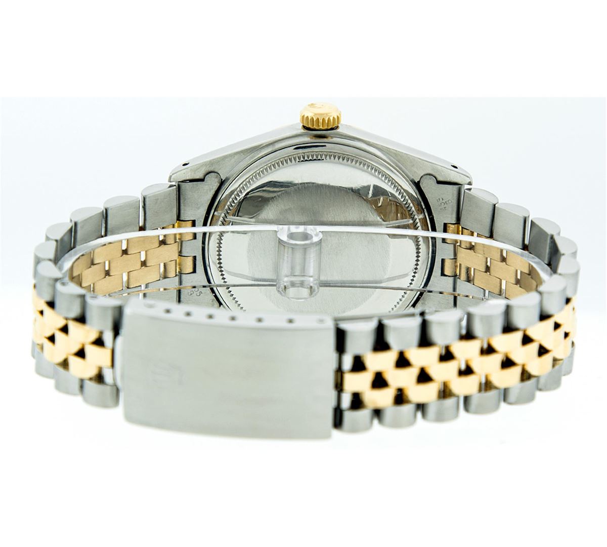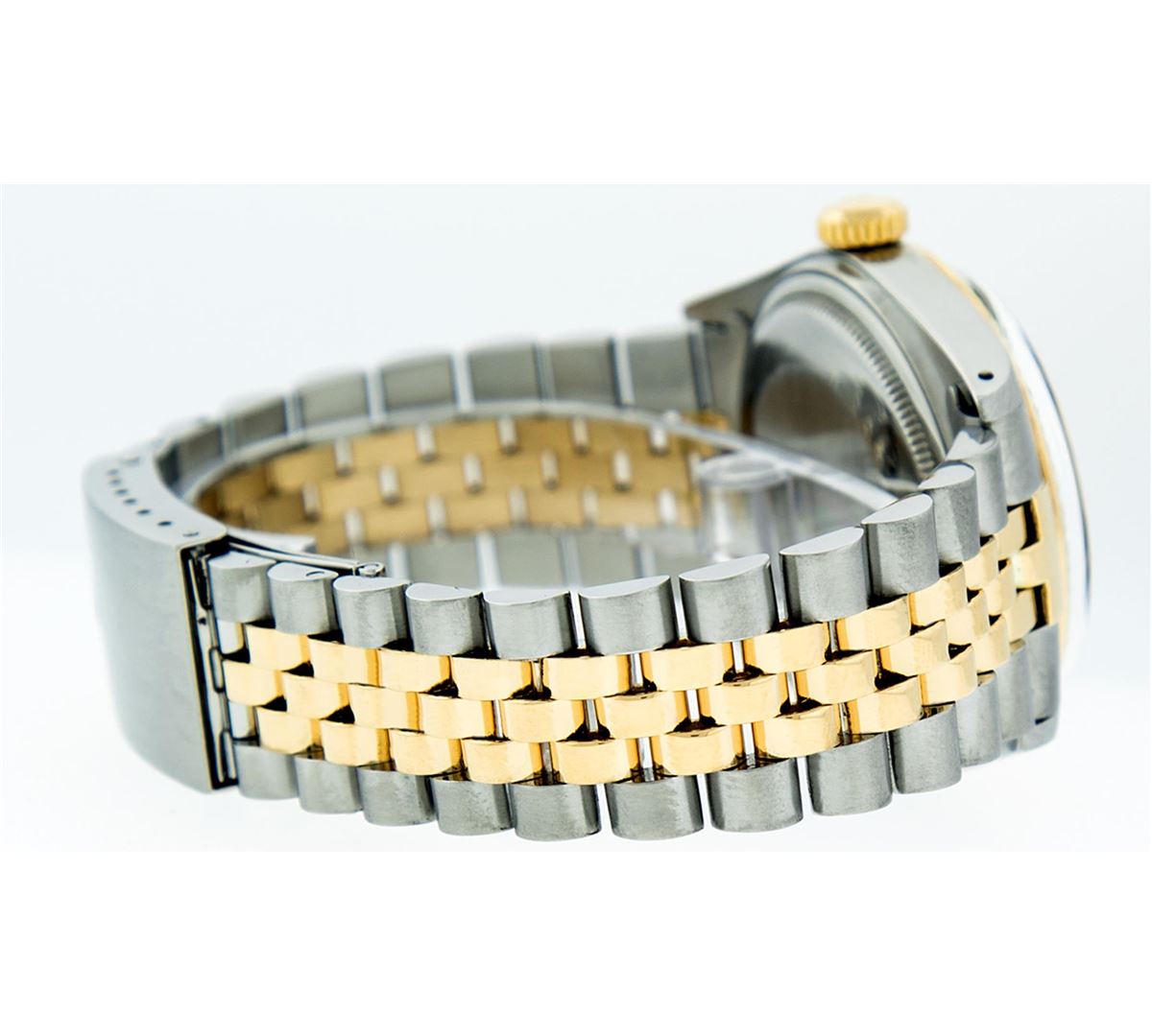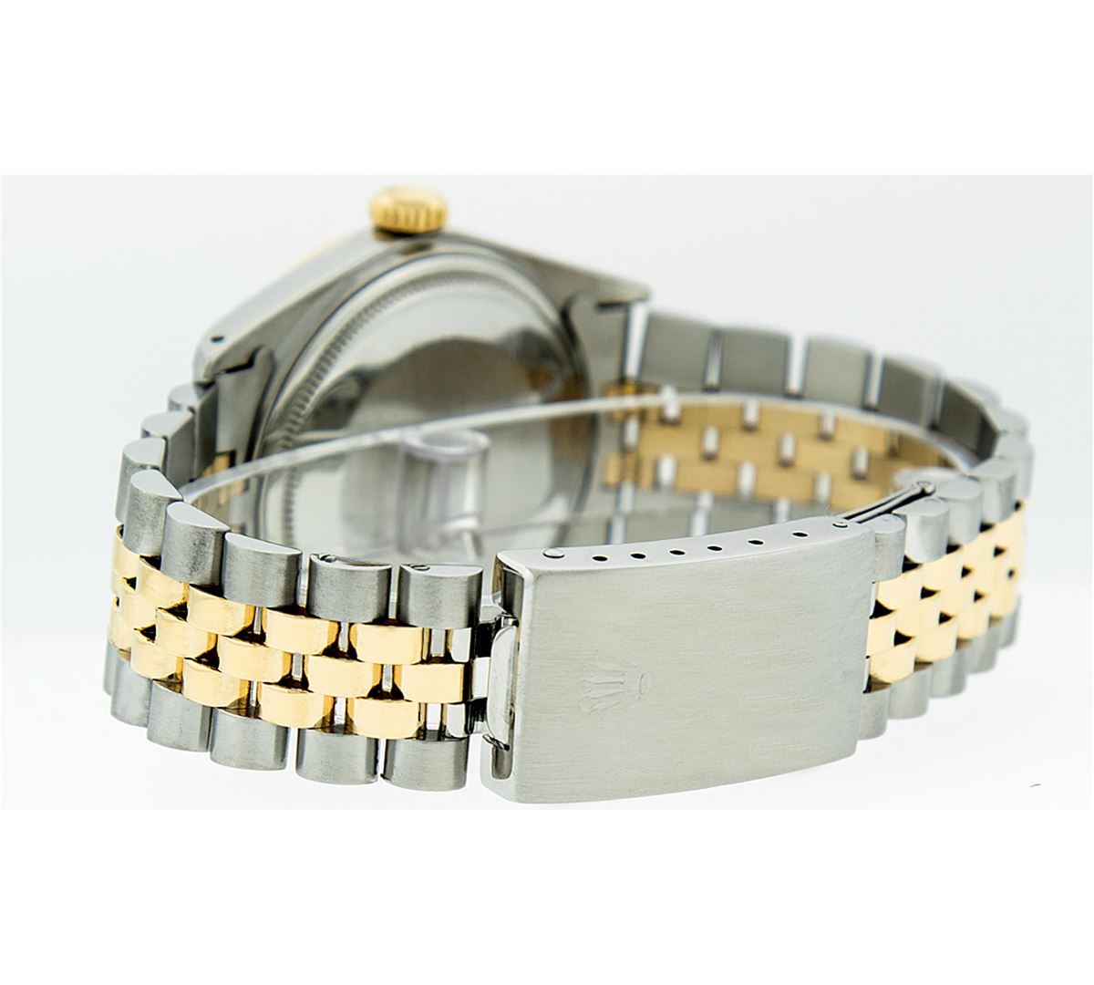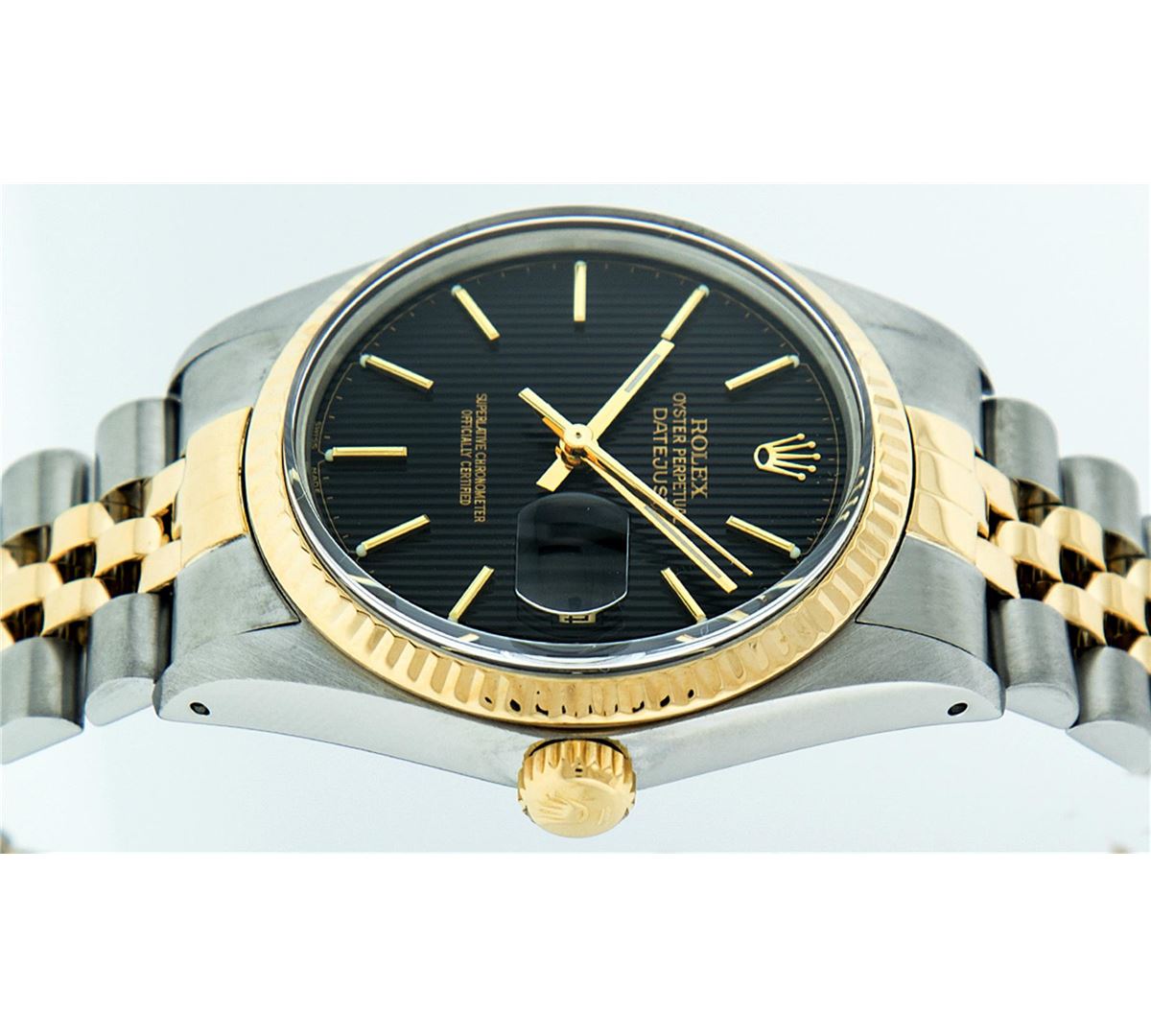 One Gents Two Tone Rolex Datejust Polished, Serviced & Electronically Tested, 14K Yellow Gold & Stainless Steel Case:36mm, 14K Yellow Gold Crown, Bezel: 14K Yellow Gold Fluted Bezel. Custom Crystal: Acrylic Cyclops Lens. Movement: Automatic Winding Movement Caliber 3035. Dial: Black Tapestry Index With Luminecent Dots. Date Window: 3 O'Clock Position Date Display, Quickset, Model: 16013 Condition: G-6 Extra Fine. Bracelet: Two Tone 14K Yellow Gold & Stainless Steel Jubilee. Bright Polish. 6.5 Inch Length, Adjustable. Standard Clasp, With Rolex Logo.