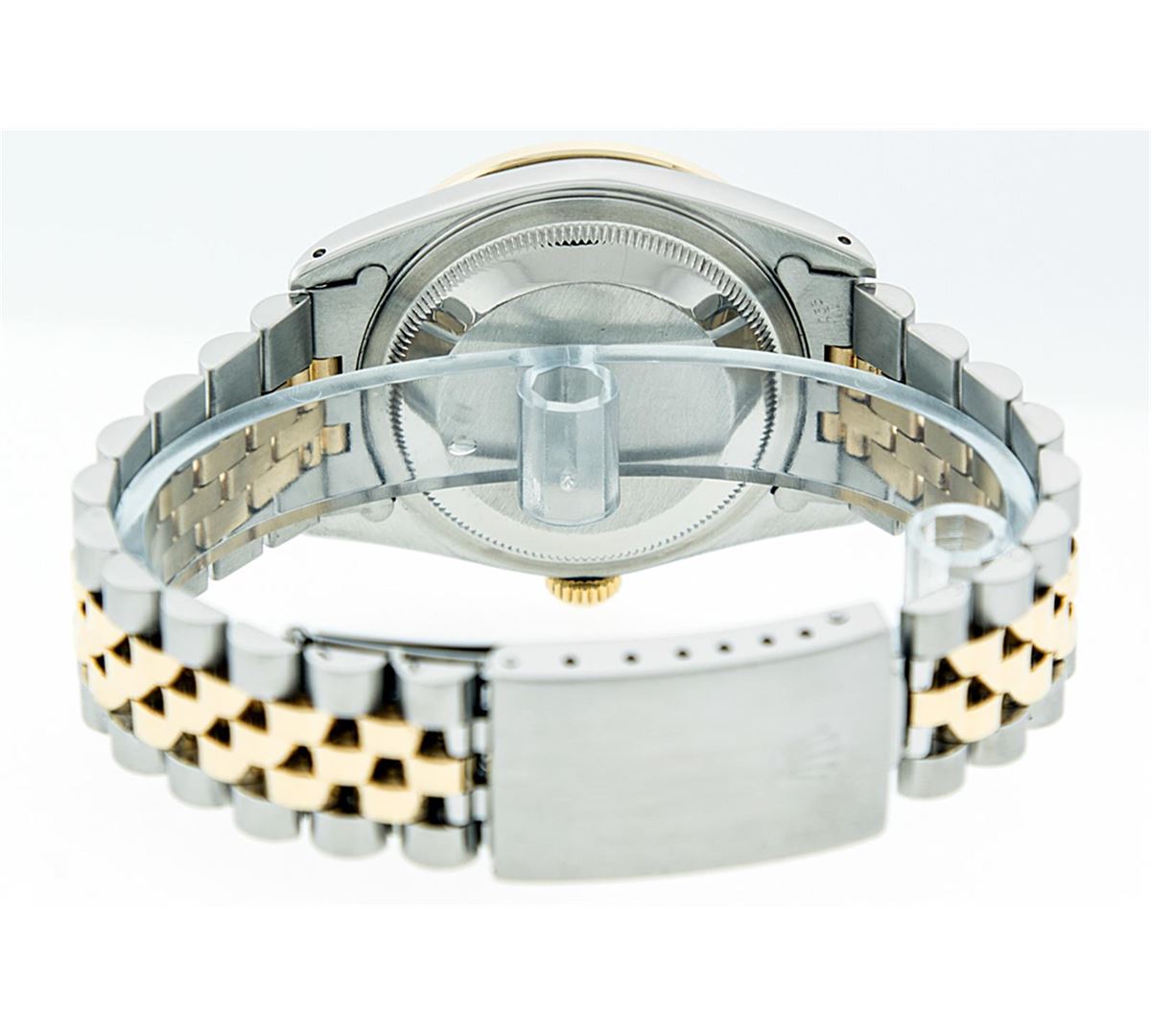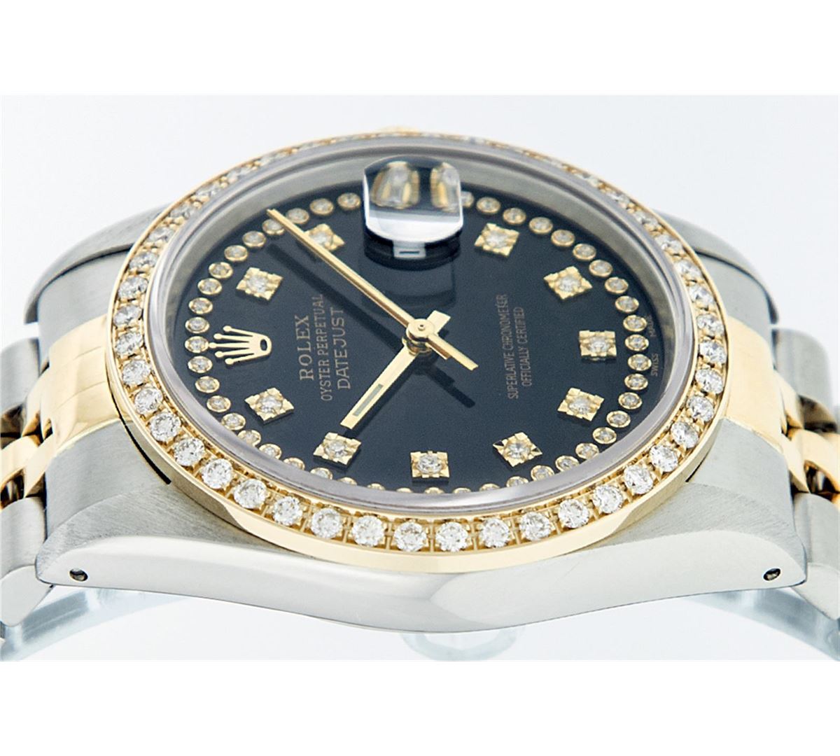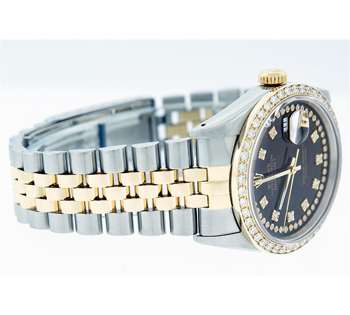 One Mens Two Tone Rolex Datejust Polished, Serviced & Electronically Tested, 14K Yellow Gold & Stainless Steel Case:36mm, 14K Yellow Gold Crown, Custom Bezel: 18K Yellow Gold Beadset Diamond Bezel, Diamond Count: 44 Diamonds, Total Weight 1.00 Carat, Clarity: Si-VS, Color: G to H. Custom Crystal: Synthetic Sapphire Cyclops Lens. Movement: Automatic Winding Movement Caliber 3035. Custom Dial: Black VVS String Diamond Dial, Diamond Count: 58 Diamonds in Dial G To H In Color, VVS In Clarity. Date Window: 3 O'Clock Position Date Display, Quickset, Model: 16013 Condition: G-6 Extra Fine. Bracelet:Two Tone 14K Yellow Gold & Stainless Steel Jubilee. Bright Polish. 7.0 Inch Length, Adjustable. Standard Clasp, With Rolex Logo.