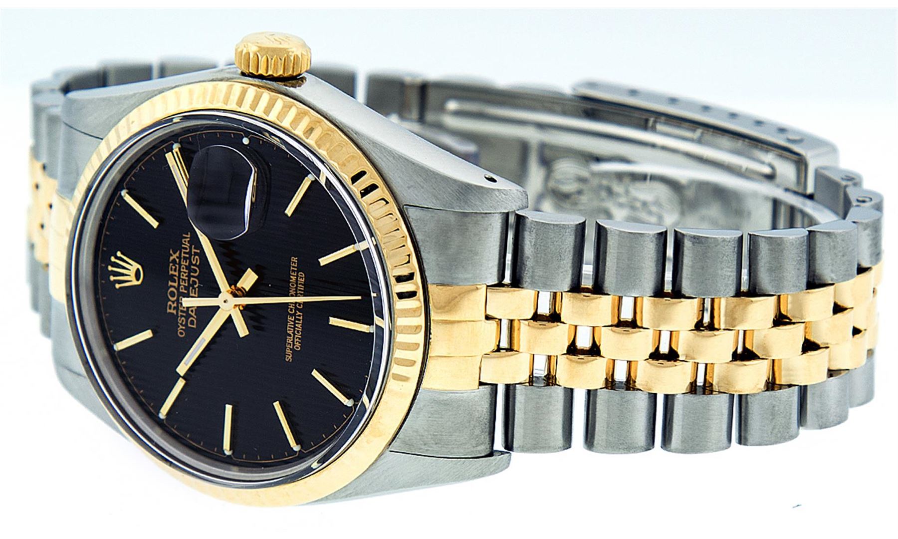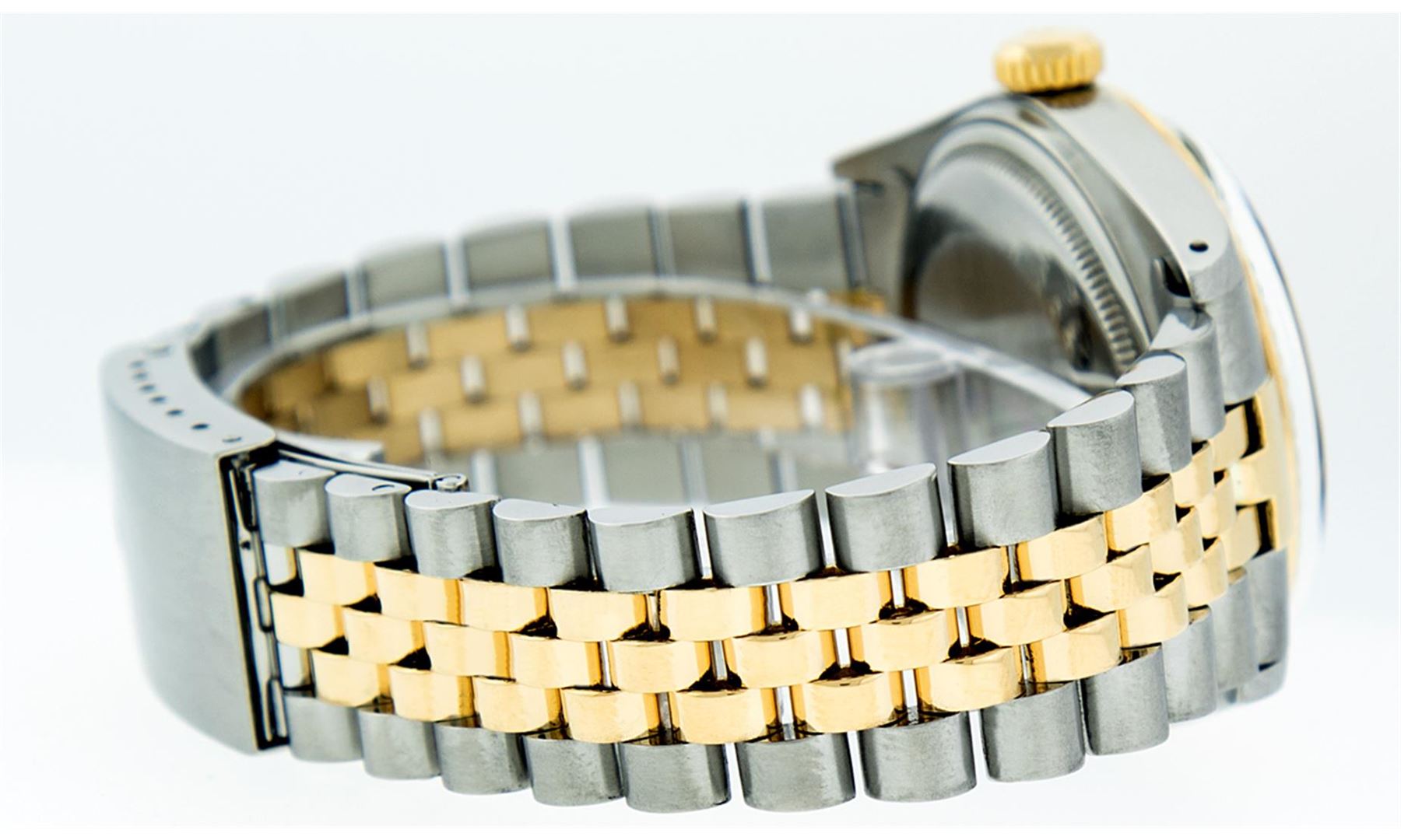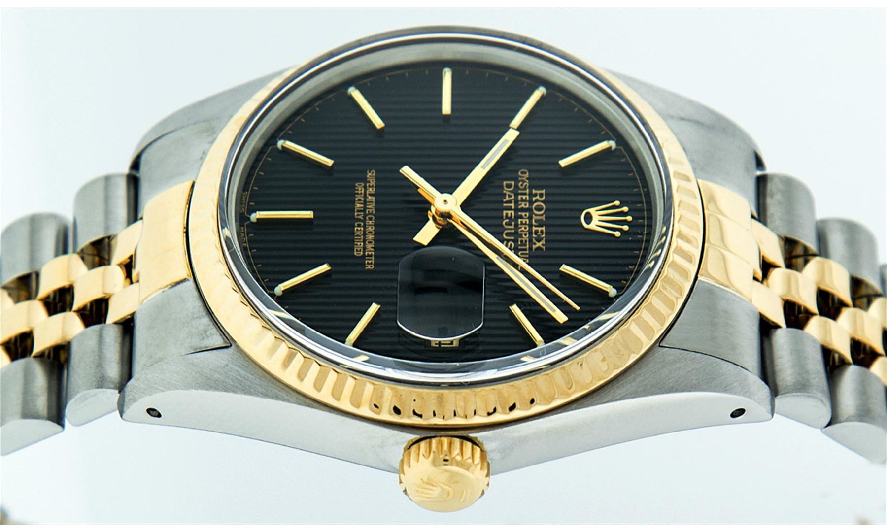 One Gents Two Tone Rolex Datejust Polished, Serviced & Electronically Tested, 14K Yellow Gold & Stainless Steel Case:36mm, 14K Yellow Gold Crown, Bezel: 14K Yellow Gold Fluted Bezel. Custom Crystal: Acrylic Cyclops Lens. Movement: Automatic Winding Movement Caliber 3035. Dial: Black Tapestry Index With Luminecent Dots. Date Window: 3 O'Clock Position Date Display, Quickset, Model: 16013 Condition: G-6 Extra Fine. Bracelet: Two Tone 14K Yellow Gold & Stainless Steel Jubilee. Bright Polish. 6.5 Inch Length, Adjustable. Standard Clasp, With Rolex Logo.