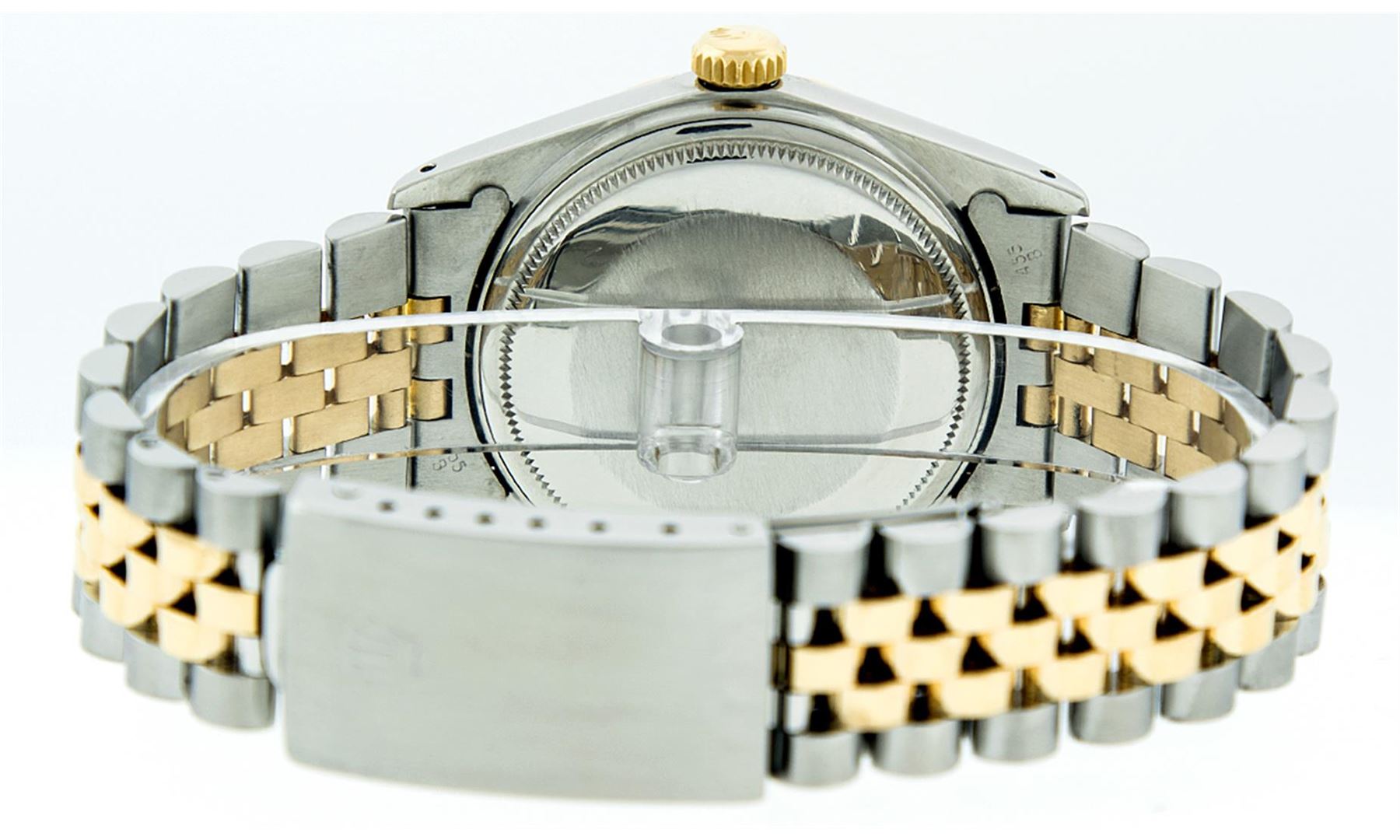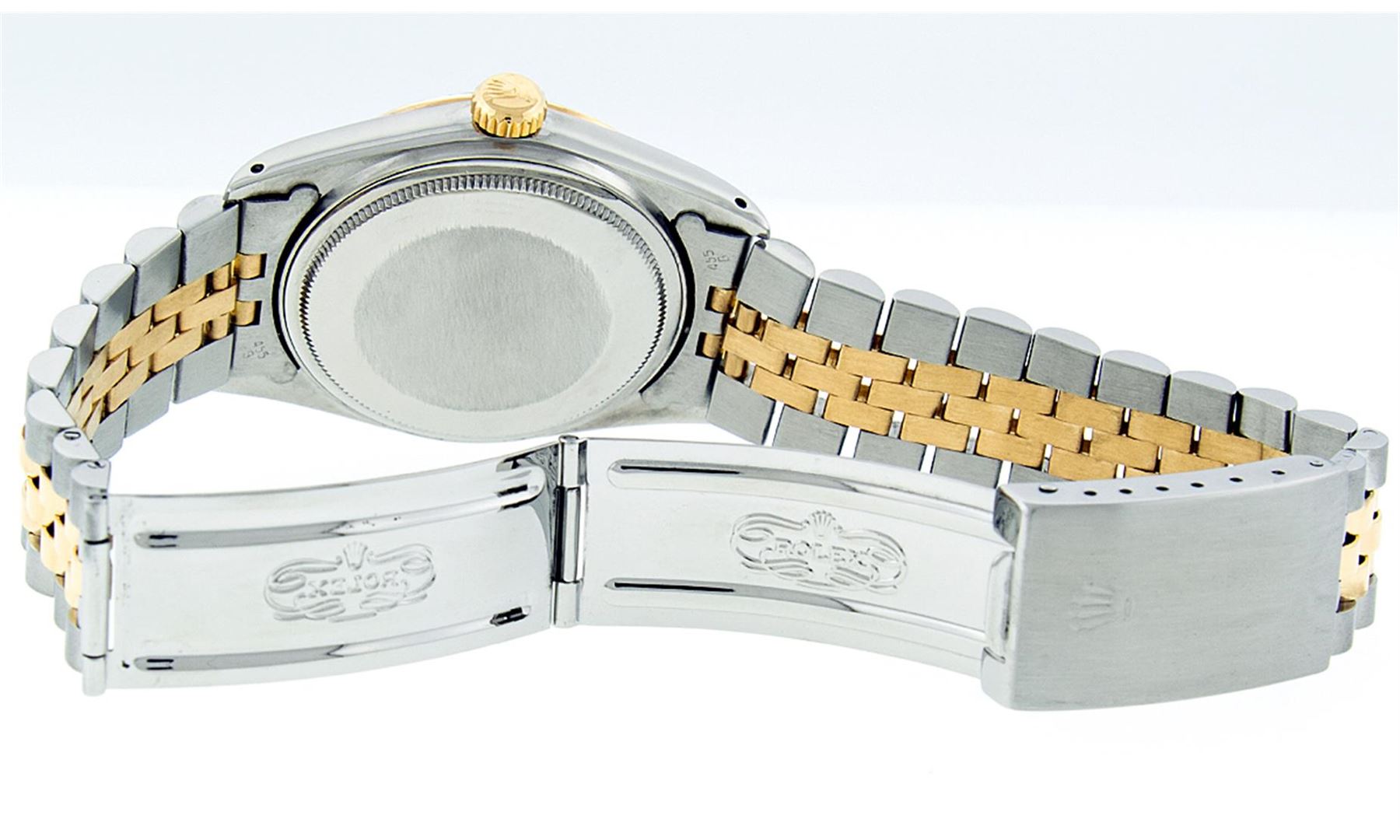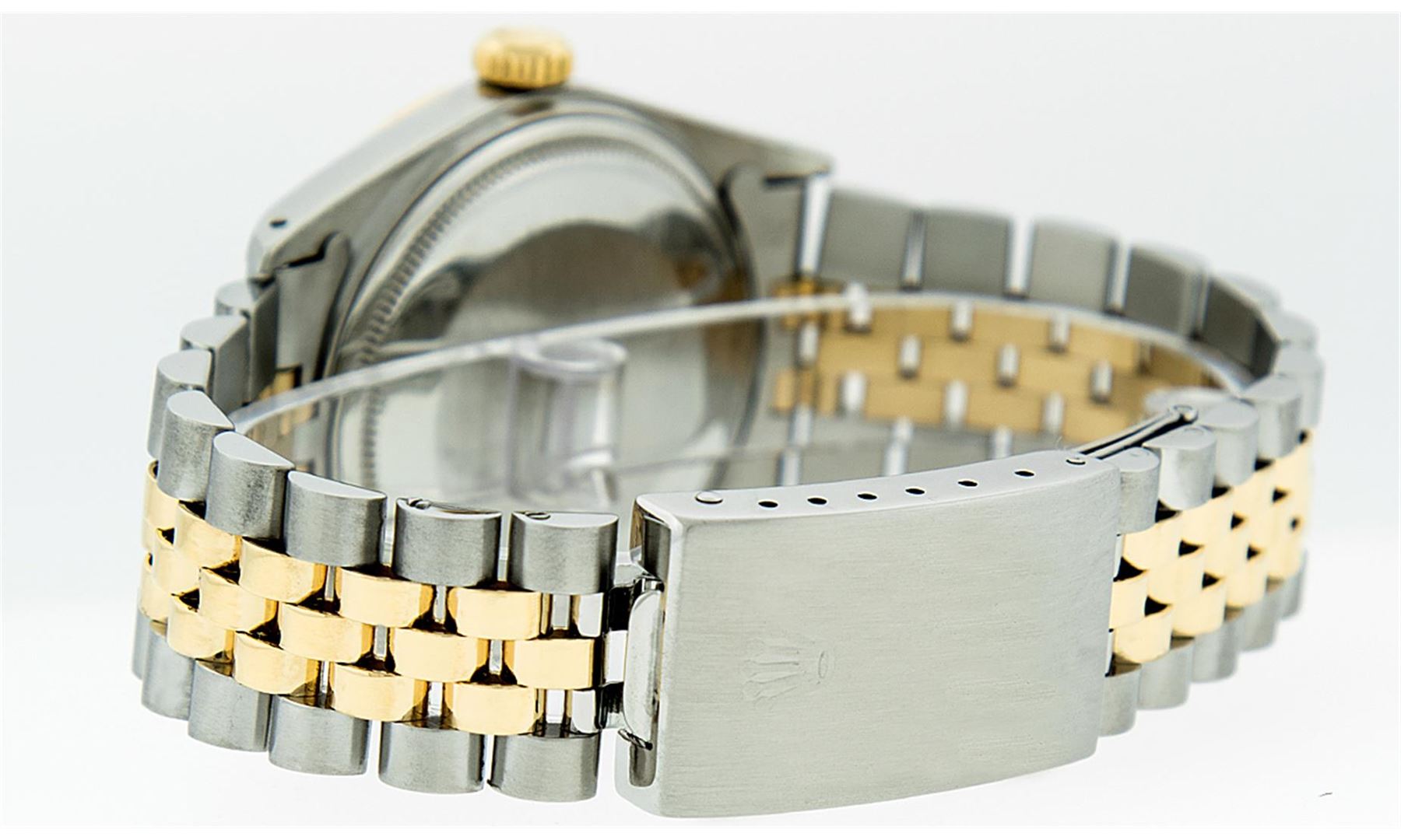 One Gents Two Tone Rolex Datejust Polished, Serviced & Electronically Tested, 14K Yellow Gold & Stainless Steel Case:36mm, 14K Yellow Gold Crown, Bezel: 14K Yellow Gold Fluted Bezel. Custom Crystal: Acrylic Cyclops Lens. Movement: Automatic Winding Movement Caliber 3035. Dial: Black Tapestry Index With Luminecent Dots. Date Window: 3 O'Clock Position Date Display, Quickset, Model: 16013 Condition: G-6 Extra Fine. Bracelet: Two Tone 14K Yellow Gold & Stainless Steel Jubilee. Bright Polish. 6.5 Inch Length, Adjustable. Standard Clasp, With Rolex Logo.