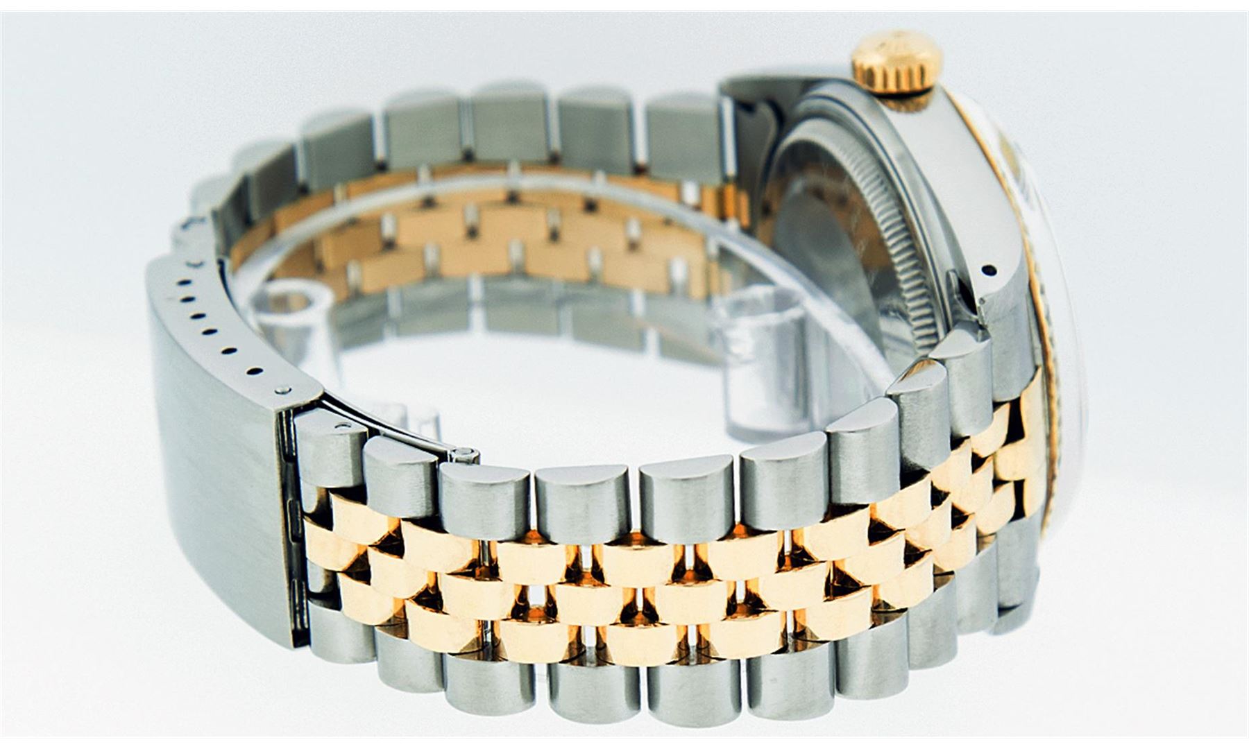 One Mens Two Tone Rolex Datejust Polished, Serviced & Electronically Tested, 14K Yellow Gold & Stainless Steel Case: 36mm,14K Yellow Gold Crown, Bezel: 14K Yellow Gold Fluted Bezel. Custom Crystal: Acrylic Cyclops Lens. Movement: Automatic Winding Movement Caliber 3035. Custom Dial: Champagne Dial With Index Hour Markers and Small Track. Date Window: 3 O'Clock Position Date Display, Quickset, Model: 16013 Condition: G-6 Extra Fine. Bracelet:Two Tone 14K Yellow Gold & Stainless Steel Jubilee. Bright Polish. 7.0 Inch Length, Adjustable. Standard Clasp, With Rolex Logo.