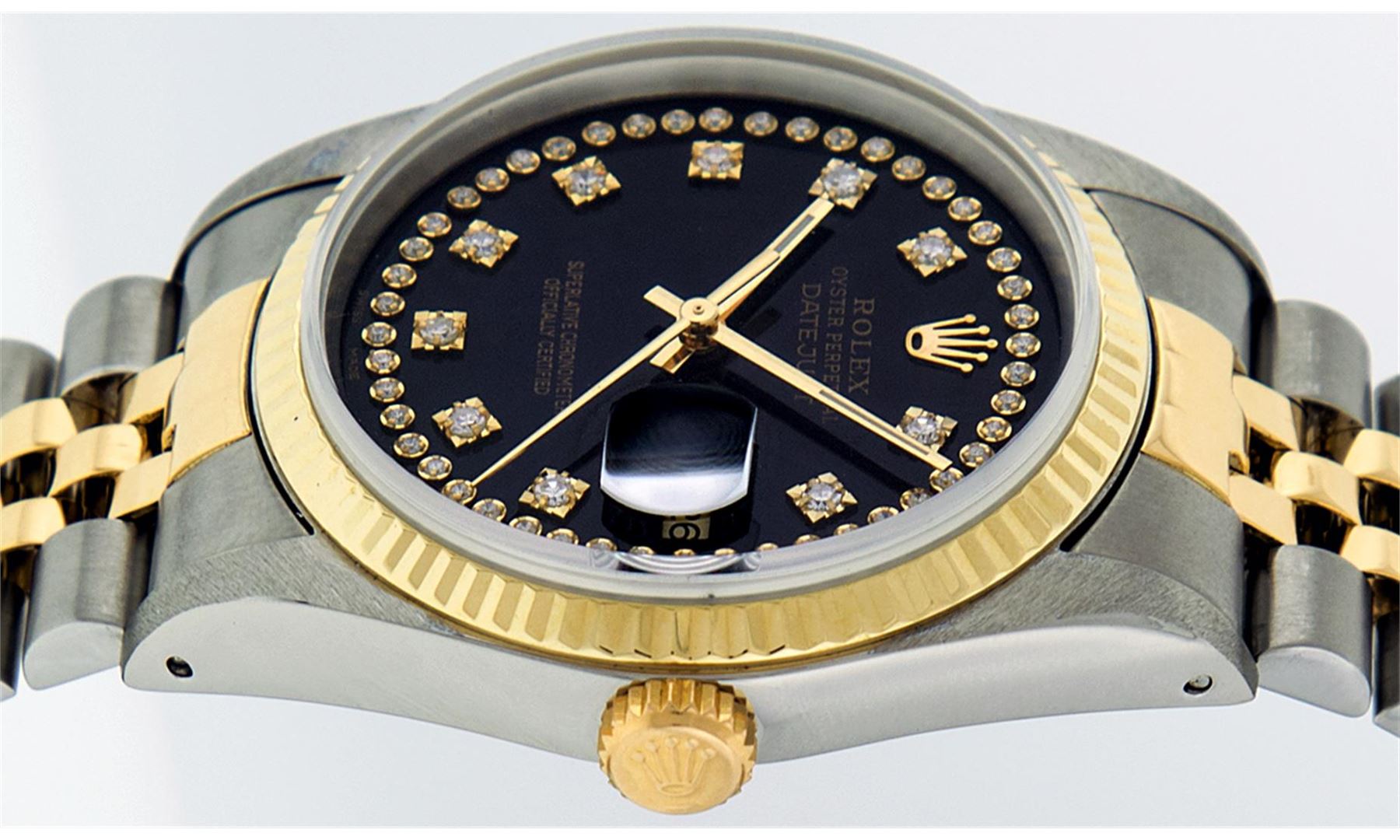One Mens Two Tone Rolex Datejust Polished, Serviced & Electronically Tested, 14K Yellow Gold & Stainless Steel Case: 36mm, 14K Yellow Gold Crown, Bezel: 14K Yellow Gold Fluted Bezel. Custom Crystal: Acrylic Cyclops Lens. Movement: Automatic Winding Movement Caliber 3035. Custom Dial: Black String VVS Diamond Dial, Diamond Count: 58 Diamonds In Dial, Color: G to H, Clarity: VVS. Date Window: 3 O'Clock Position Date Display, Quickset, Model: 16013 Condition: G-6 Extra Fine. Bracelet: Two Tone 14K Yellow Gold & Stainless Steel Jubilee. Bright Polish. 7.0 Inch Length, Adjustable. Standard Clasp, With Rolex Logo.