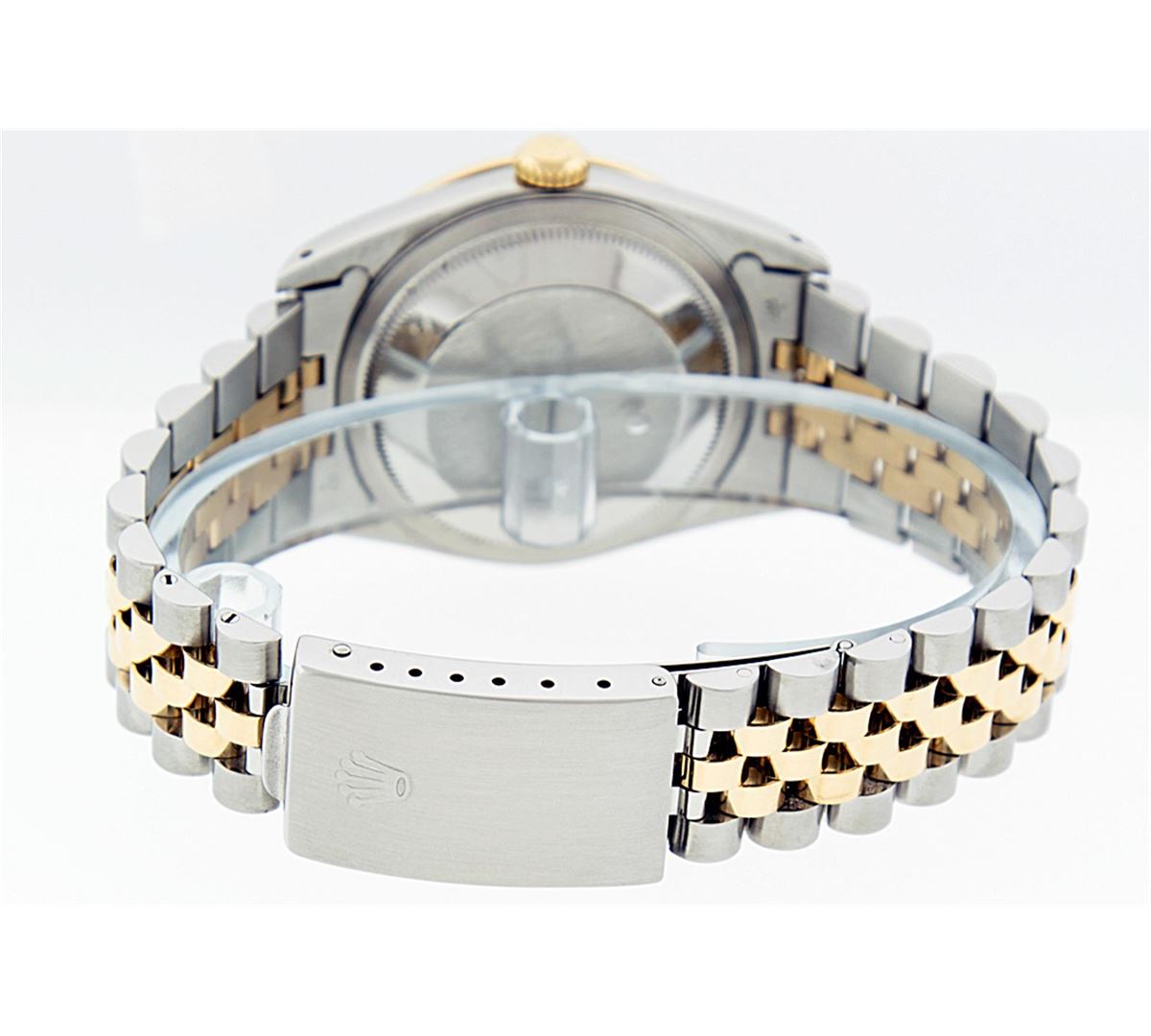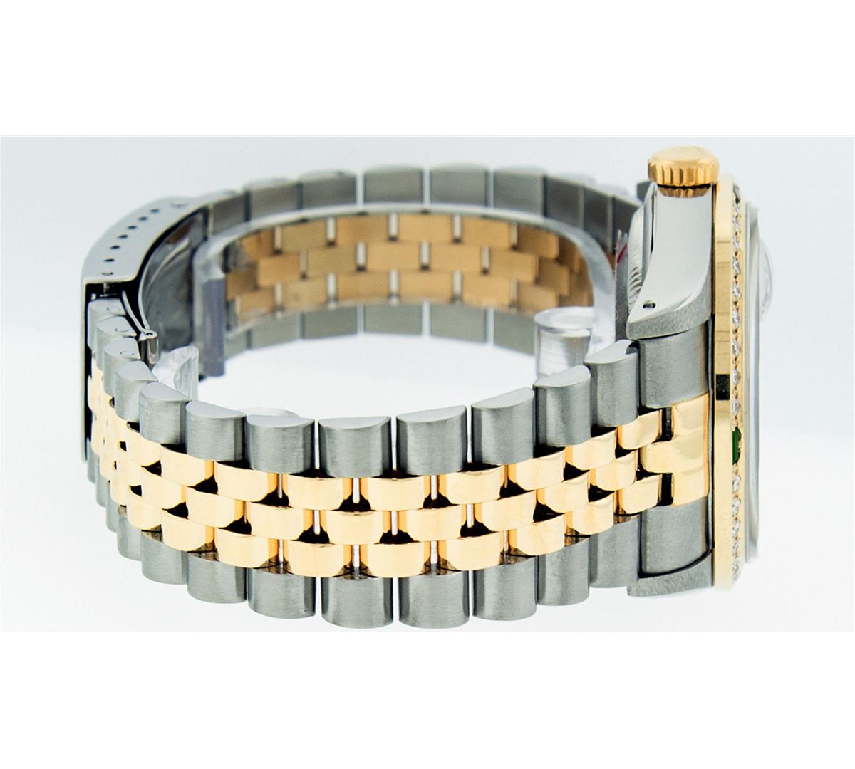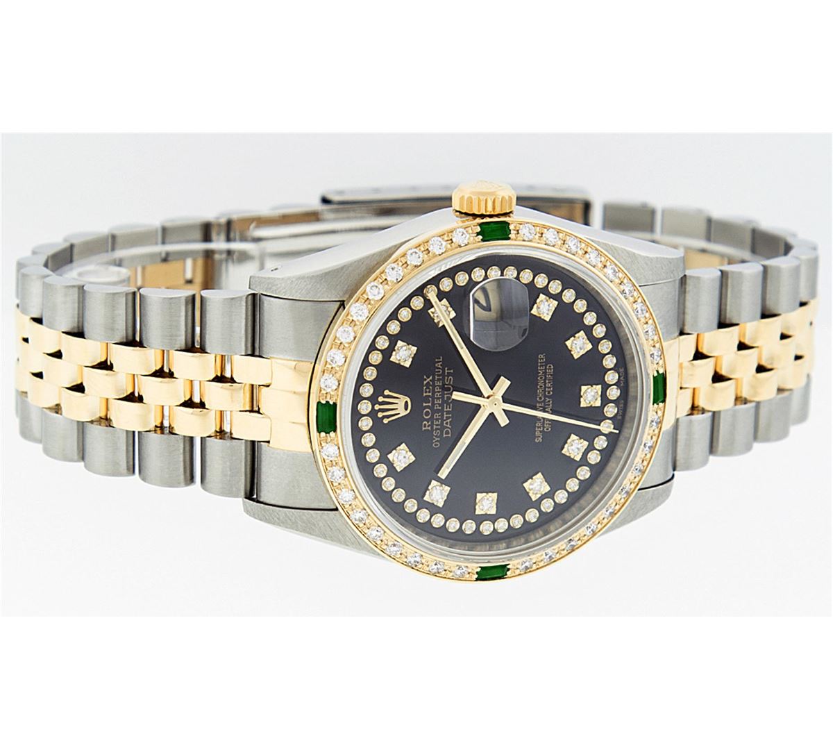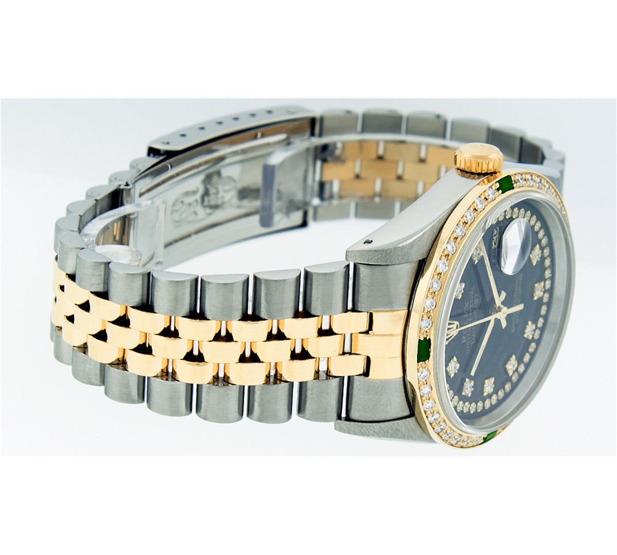 One Mens Two Tone Rolex Datejust Polished, Serviced & Electronically Tested, 14K Yellow Gold & Stainless Steel Case:36mm, 14K Yellow Gold Crown, Custom Bezel: 18K Yellow Gold Emerald Beadset Diamond Bezel, Diamond Count: 36 Diamonds + 4 Emeralds, Total We