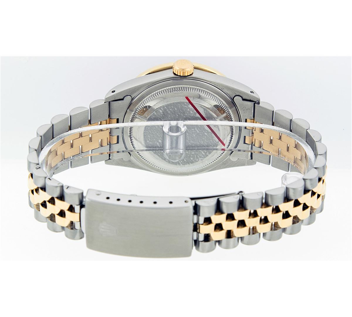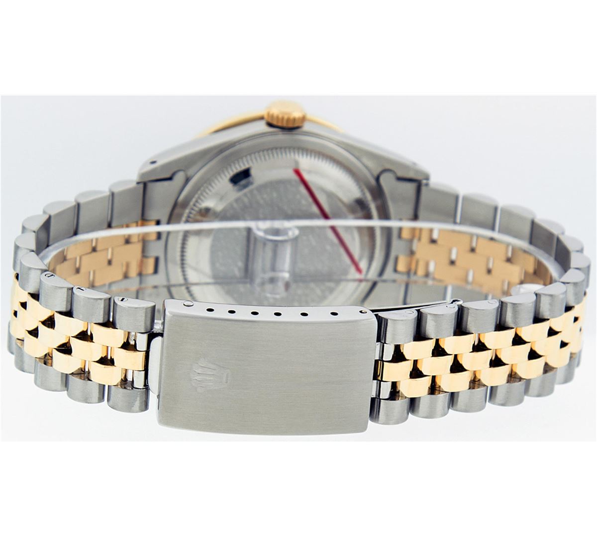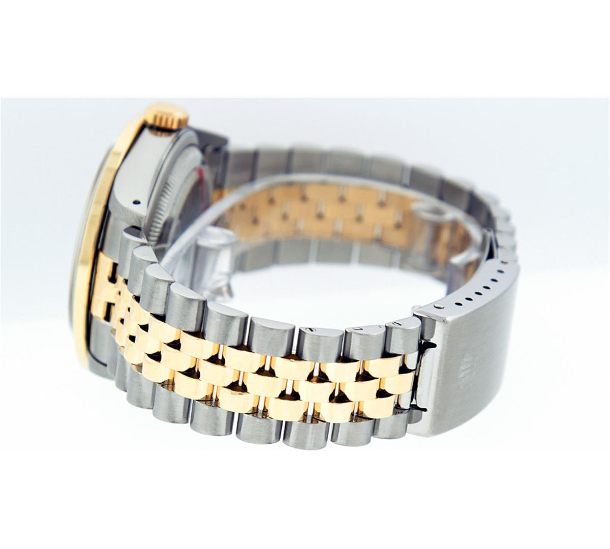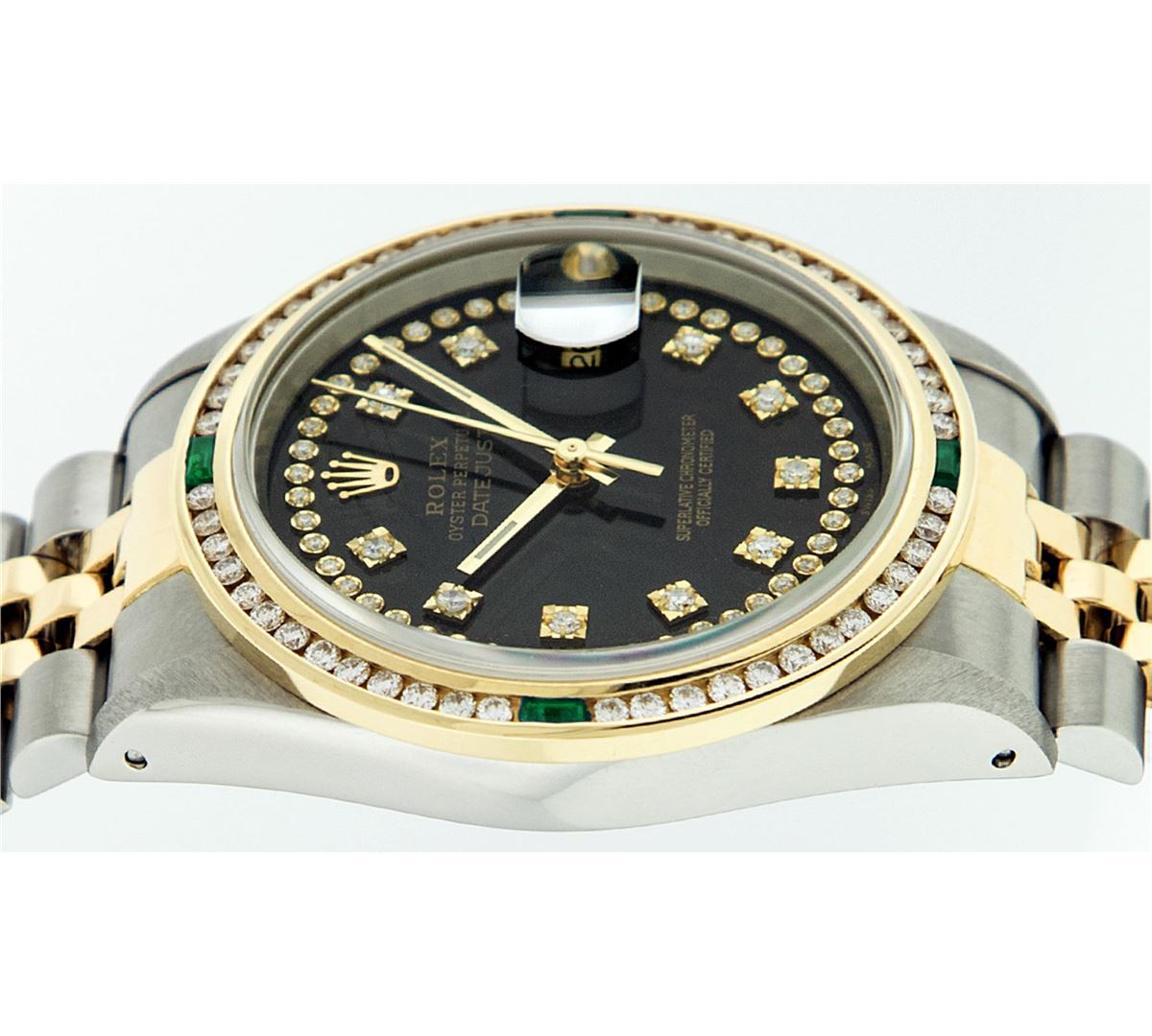 One Mens Two Tone Rolex Datejust Polished, Serviced & Electronically Tested, 14K Yellow Gold & Stainless Steel Case:36mm, 14K Yellow Gold Crown, Custom Bezel: 18K Yellow Gold Emerald Channel Set Diamond Bezel, Diamond Count: 52 Diamonds + 4 Emeralds, Total Weight 1.30 Carat, Clarity: SI-VS, Color: G to H. Custom Crystal: Synthetic Sapphire Cyclops Lens. Movement: Automatic Winding Movement Caliber 3035. Custom Dial: Black String Diamond Dial VVS, Diamond Count: 58 Diamonds in Dial G To H In Color, VVS Clarity. Date Window: 3 O'Clock Position Date Display, Quickset, Model: 16013 Condition: G-6 Extra Fine. Bracelet:Two Tone 14K Yellow Gold & Stainless Steel Jubilee. Bright Polish. 7.0 Inch Length, Adjustable. Standard Clasp, With Rolex Logo.