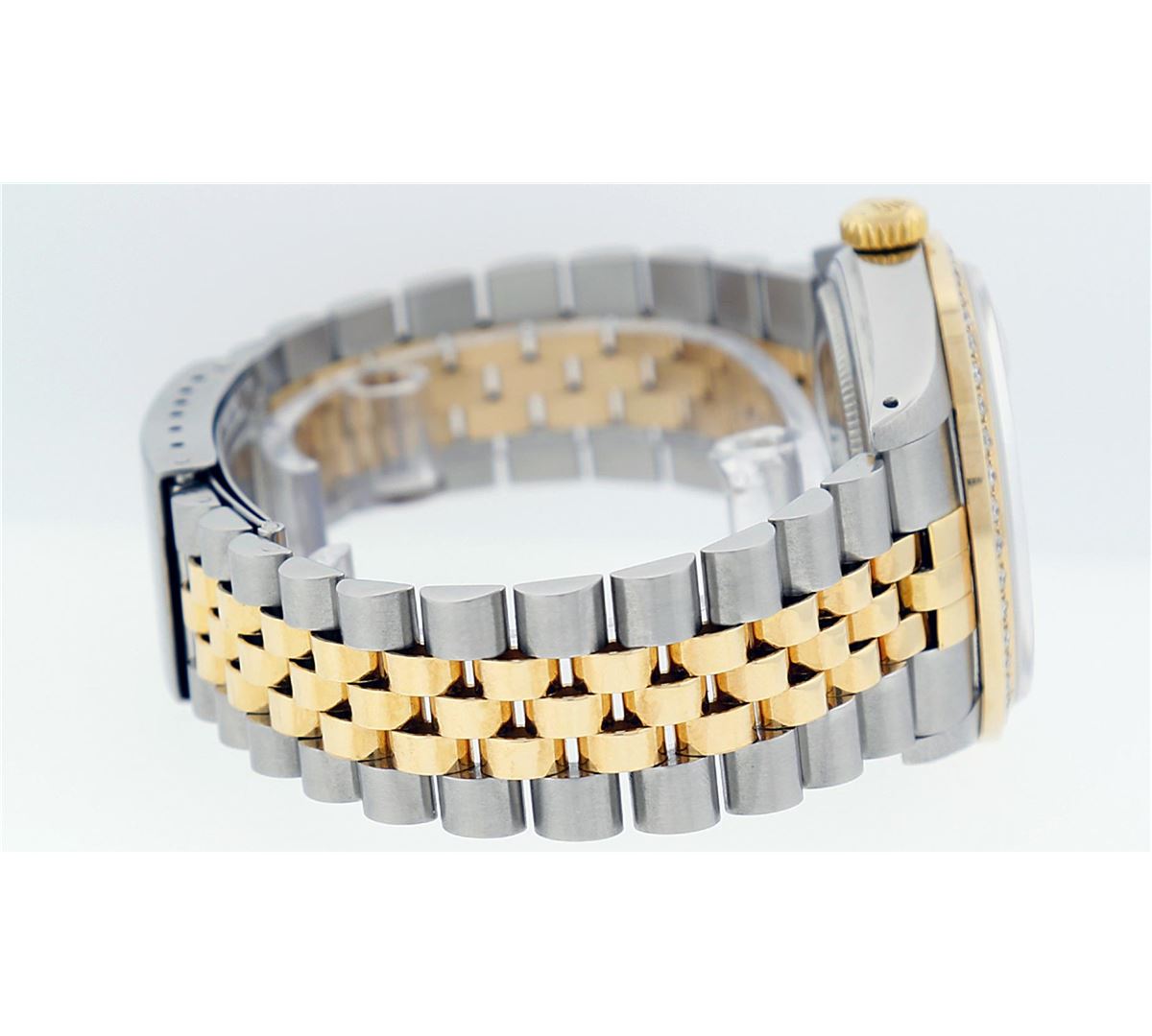 One Mens Two Tone Rolex Datejust Polished, Serviced & Electronically Tested, 14K Yellow Gold & Stainless Steel Case:36mm, 14K Yellow Gold Crown, Custom Bezel: 18K Yellow Gold Beadset Diamond Bezel, Diamond Count: 44 Diamonds. Total Weight 1.00 Carat, Clarity: Si-VS, Color: G to H. Custom Crystal: Synthetic Sapphire Cyclops Lens. Movement: Automatic Winding Movement Caliber 3035. Custom Dial: Mother Of Pearl Diamond With Emerald Baguette, 8 Diamonds + 2 Emerald Baguettes in Dial, Dial Weight: .40 Carat G To H In Color, Clarity: SI-VS Date Window: 3 O'Clock Position Date Display, Quickset, Model: 16013 Condition: G-6 Extra Fine. Bracelet:Two Tone 14K Yellow Gold & Stainless Steel Jubilee. Bright Polish. 7.0 Inch Length, Adjustable. Standard Clasp, With Rolex Logo.