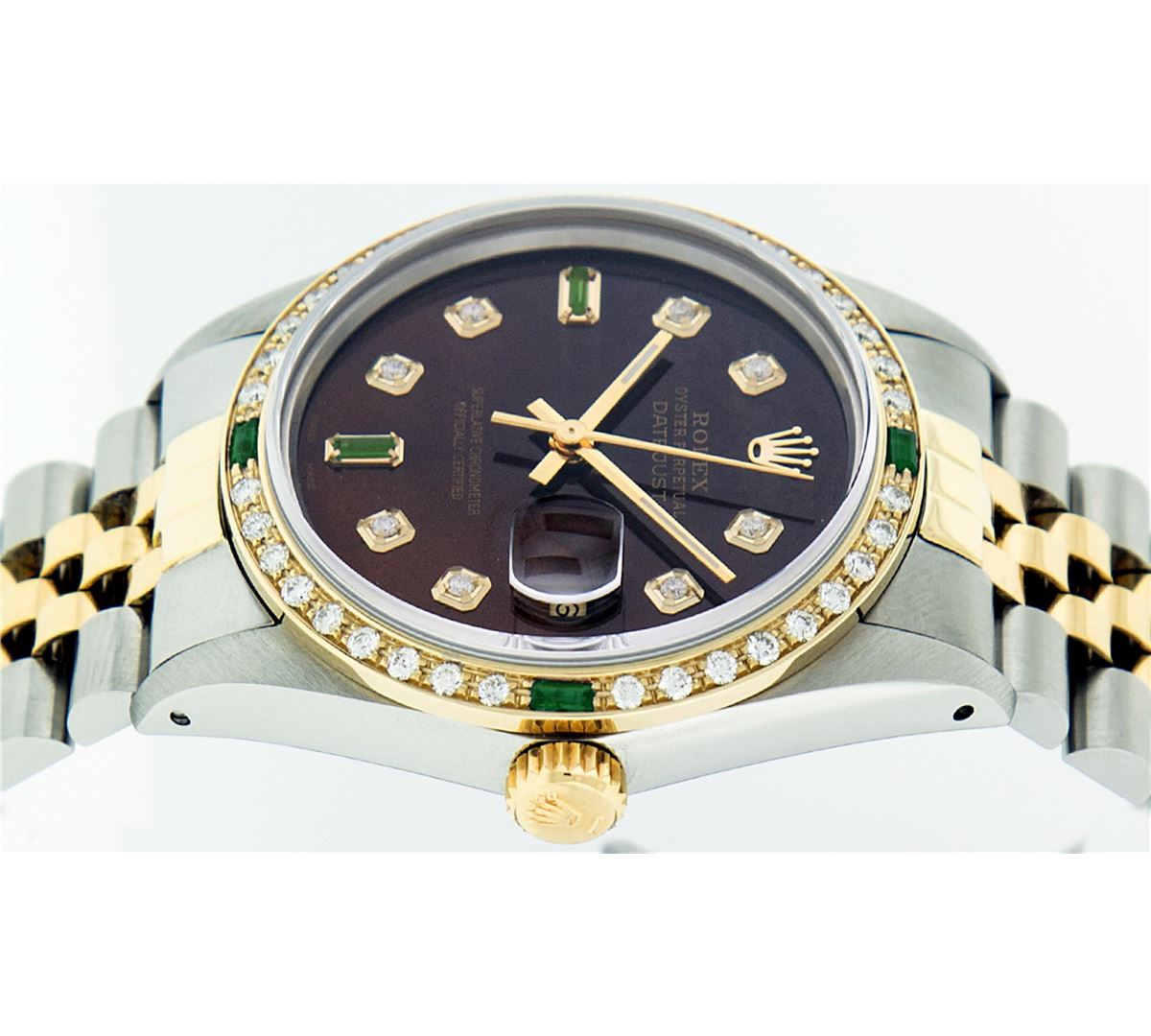 One Mens Rolex Datejust Polished Bright with Satin Finish, Serviced & Electronically Tested, Stainless Steel Case:36mm, Stainless Steel Crown, Custom Bezel: 18K Yellow Gold Emerald Beadset Diamond Bezel, Diamond + Gem Count:36 Diamonds + 4 Emeralds, Total Weight 1.00 Carat, Clarity: SI-VS, Color: G to H. Custom Crystal: Synthetic Sapphire Cyclops Lens. Movement: Automatic Winding Movement Caliber 3035. Custom Dial: Brown Diamonds With Emeralds, Diamond Count: 8 Diamond + 2 Emerald Baguettes in Dial, Dial Color: G To H In Color, Clarity: SI-VS. Date Window: 3 O'Clock Position Date Display, Quickset, Model: 16013 Condition: G-6 Extra Fine. Bracelet: 14K Yellow Gold and Stainless Steel Jubilee. Bright Polish & Satin Finish. 7.0 Inch Length, Adjustable. Standard Clasp, With Rolex Logo.