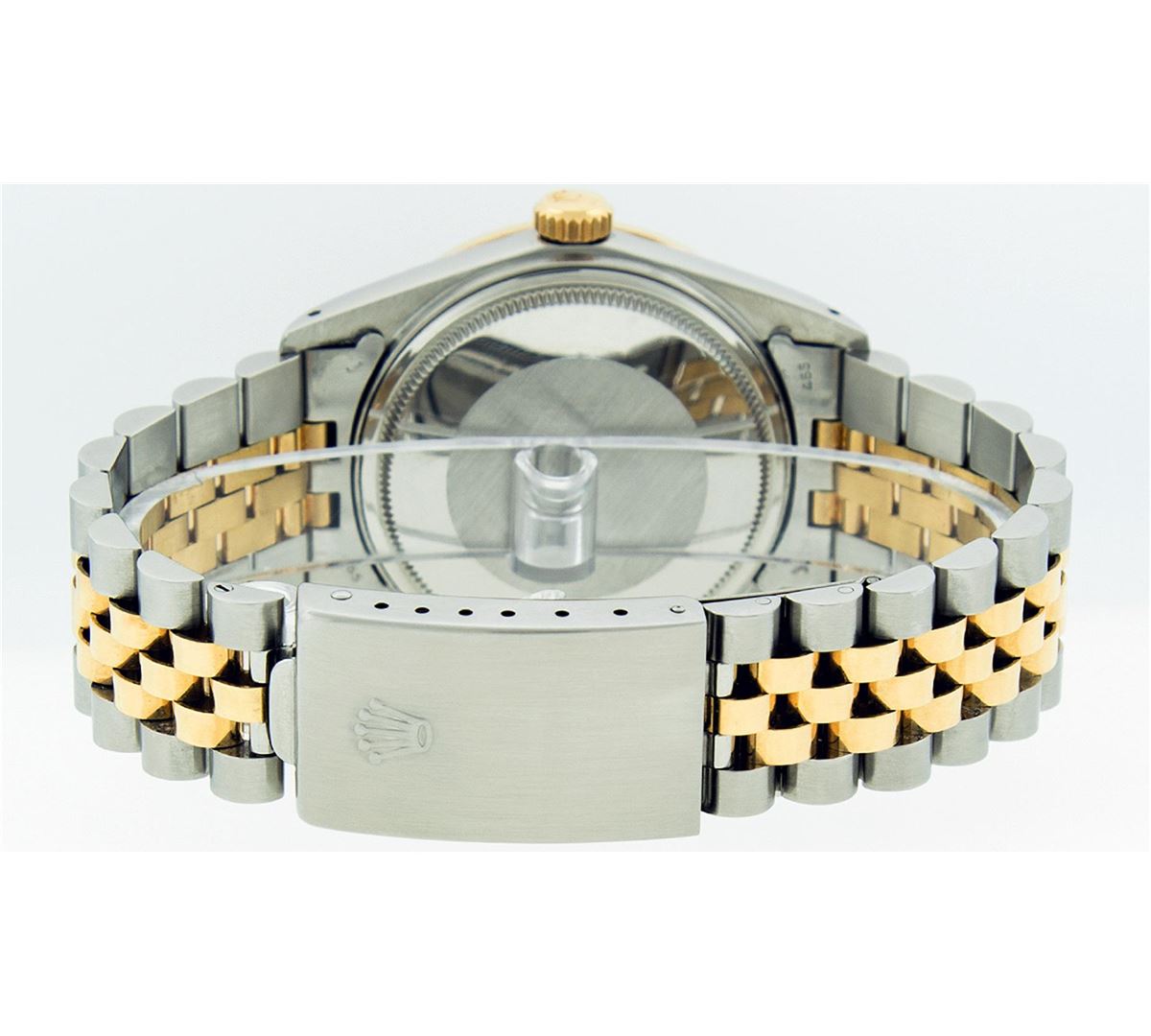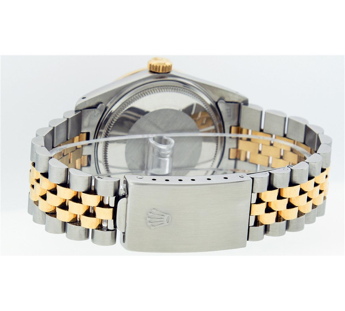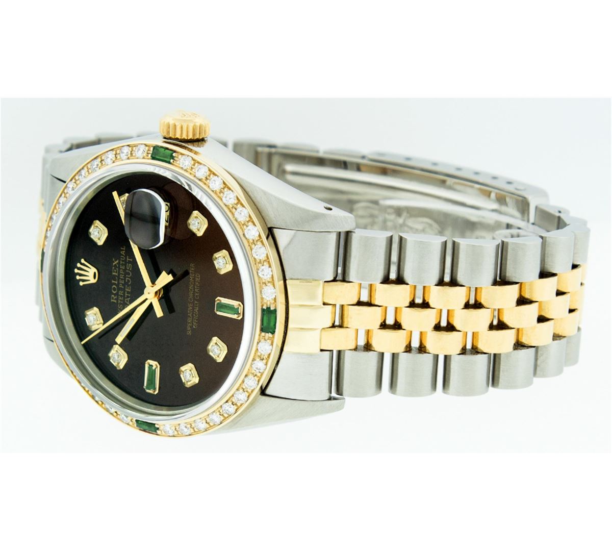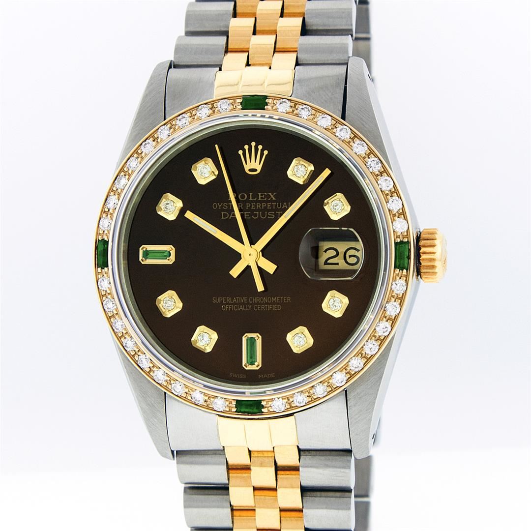 One Mens Rolex Datejust Polished Bright with Satin Finish, Serviced & Electronically Tested, Stainless Steel Case:36mm, Stainless Steel Crown, Custom Bezel: 18K Yellow Gold Emerald Beadset Diamond Bezel, Diamond + Gem Count:36 Diamonds + 4 Emeralds, Total Weight 1.00 Carat, Clarity: SI-VS, Color: G to H. Custom Crystal: Synthetic Sapphire Cyclops Lens. Movement: Automatic Winding Movement Caliber 3035. Custom Dial: Brown Diamonds With Emeralds, Diamond Count: 8 Diamond + 2 Emerald Baguettes in Dial, Dial Color: G To H In Color, Clarity: SI-VS. Date Window: 3 O'Clock Position Date Display, Quickset, Model: 16013 Condition: G-6 Extra Fine. Bracelet: 14K Yellow Gold and Stainless Steel Jubilee. Bright Polish & Satin Finish. 7.0 Inch Length, Adjustable. Standard Clasp, With Rolex Logo.