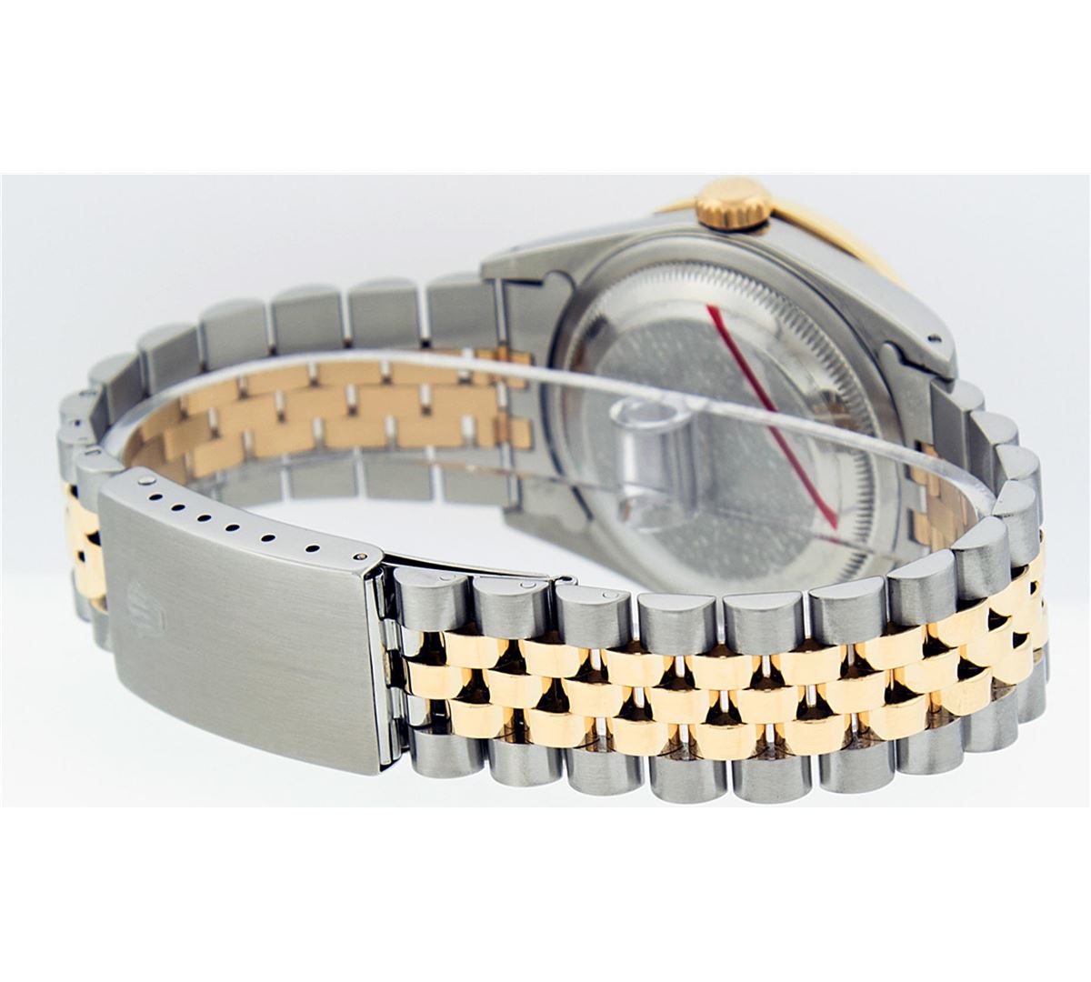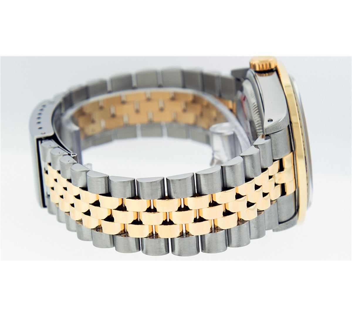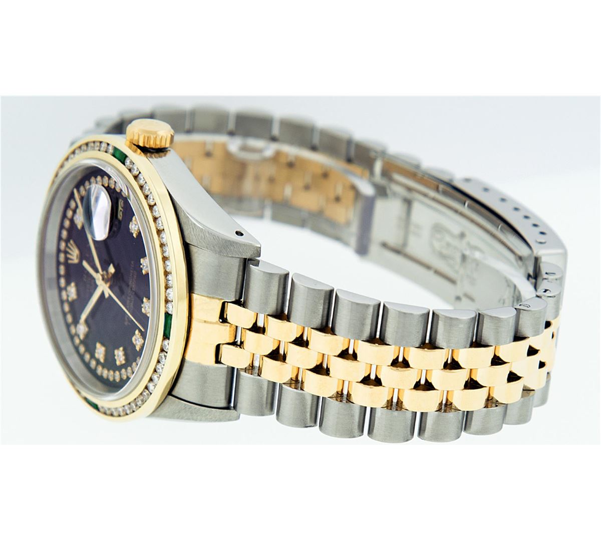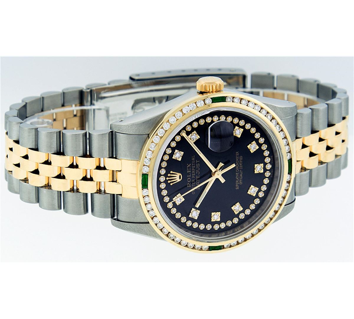 One Mens Two Tone Rolex Datejust Polished, Serviced & Electronically Tested, 14K Yellow Gold & Stainless Steel Case:36mm, 14K Yellow Gold Crown, Custom Bezel: 18K Yellow Gold Emerald Channel Set Diamond Bezel, Diamond Count: 52 Diamonds + 4 Emeralds, Total Weight 1.30 Carat, Clarity: SI-VS, Color: G to H. Custom Crystal: Synthetic Sapphire Cyclops Lens. Movement: Automatic Winding Movement Caliber 3035. Custom Dial: Black String Diamond Dial VVS, Diamond Count: 58 Diamonds in Dial G To H In Color, VVS Clarity. Date Window: 3 O'Clock Position Date Display, Quickset, Model: 16013 Condition: G-6 Extra Fine. Bracelet:Two Tone 14K Yellow Gold & Stainless Steel Jubilee. Bright Polish. 7.0 Inch Length, Adjustable. Standard Clasp, With Rolex Logo.